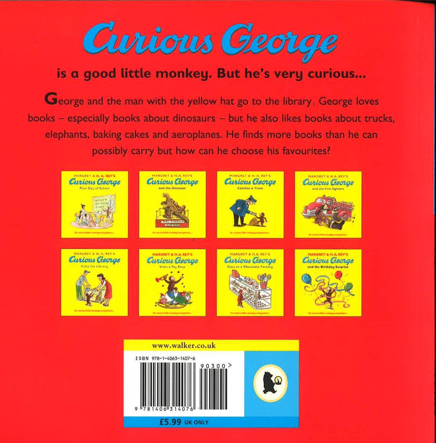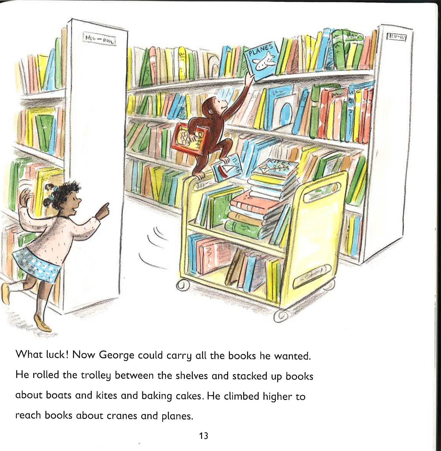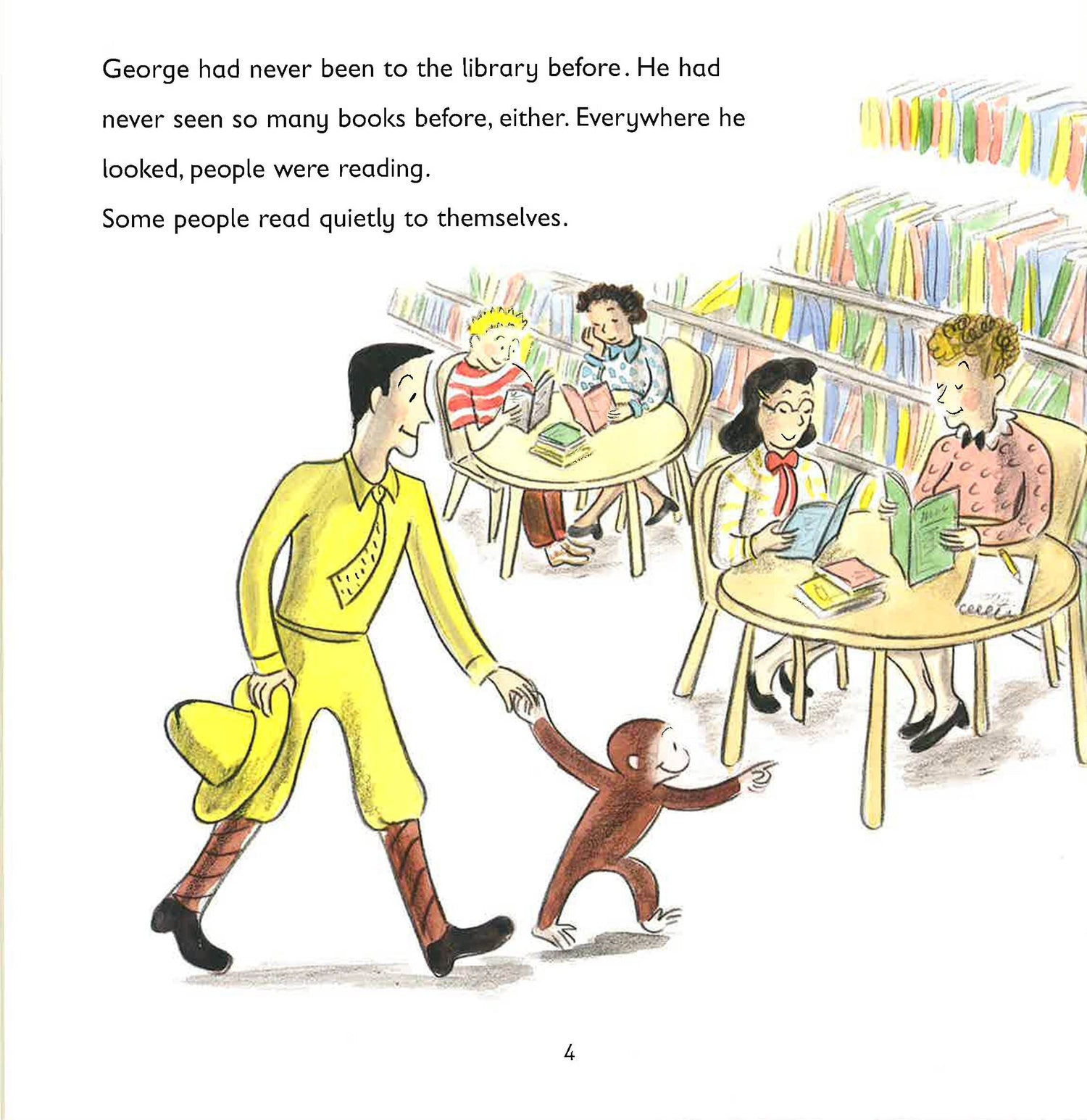 The man in the yellow hat takes George for his very first visit to the library. George can't believe how many books there are and loads up a trolley with his favourites, but the trolley picks up speed and crashes - what a mess! With the help of the librarian and the other children, the books are all picked up and sorted out, and George is left with a small pile of his favourites. He is even given a new library card so that he can borrow some more when he visits again.