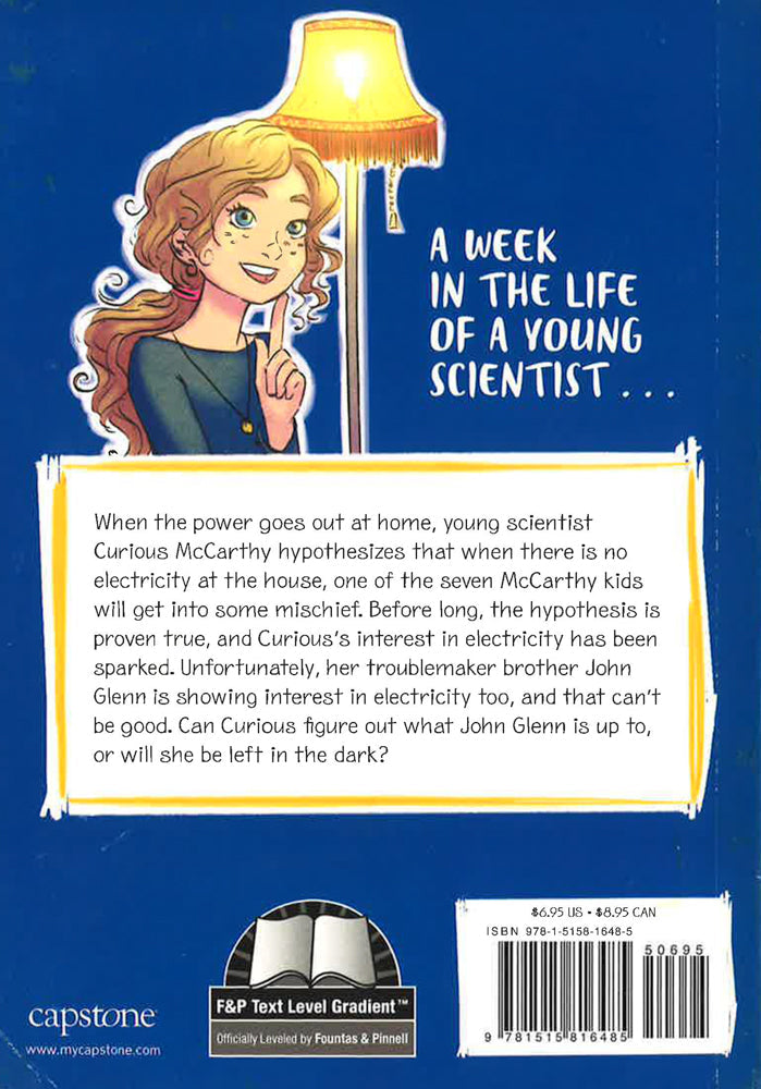When the power goes out at home, young scientist Curious McCarthy hypothesizes that when there is no electricity at the house, one of the seven McCarthy kids will get in trouble. The power comes back of before the hypothesis is proven true, but Curious's interest in electricity has been sparked. Using funny footnotes, Curious shares her observations of school and home in a crazy story featuring electrons, arm wrestling, cooties, and batteries made out of fruit! A glossary, discussion questions, and writing prompts provide reading support, while a related science experiment adds to the fun.