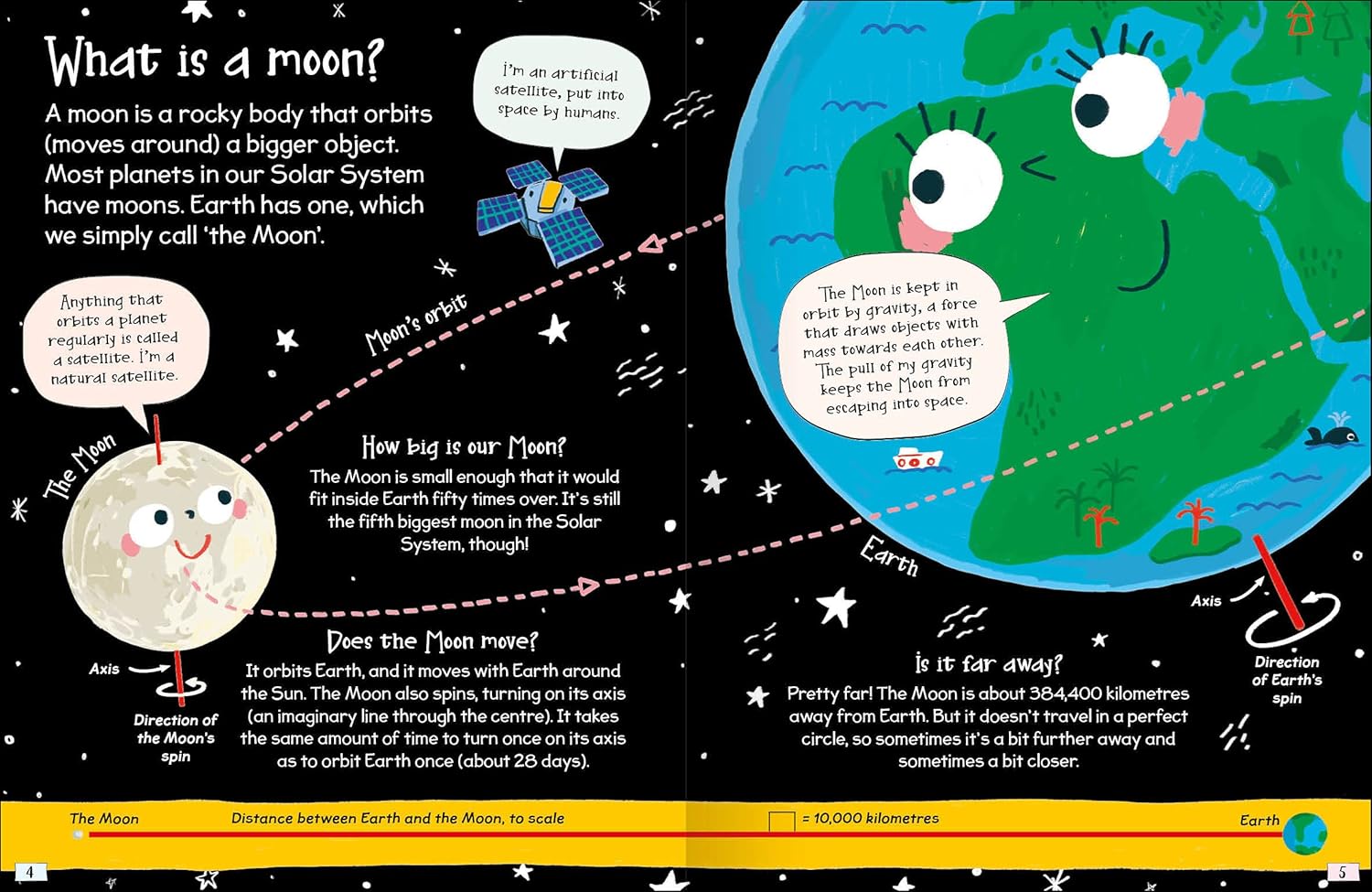 Throughout there are special double-pages that focus looking at the most extraordinary things. Your child will be enthralled by Incredible Numbers, such as 5268 is the diameter in kilometres of the largest moon in the Solar System, the popular Would You Rather game, such as fly the orbiter round and round the Moon, or guide the lander down to the surface? and quickfire Did You Know… that footprints on the Moon will stay there unless disturbed.