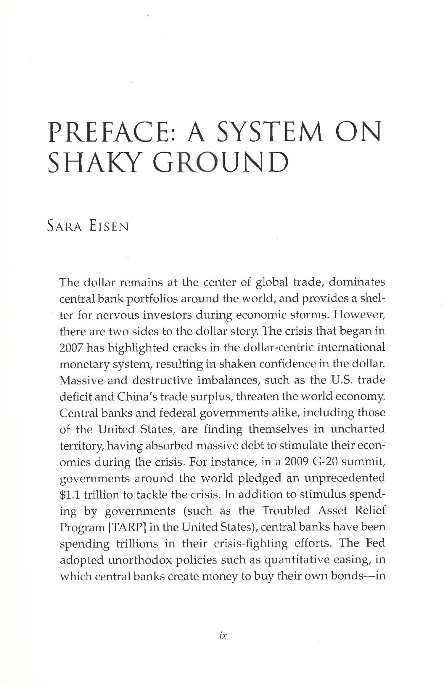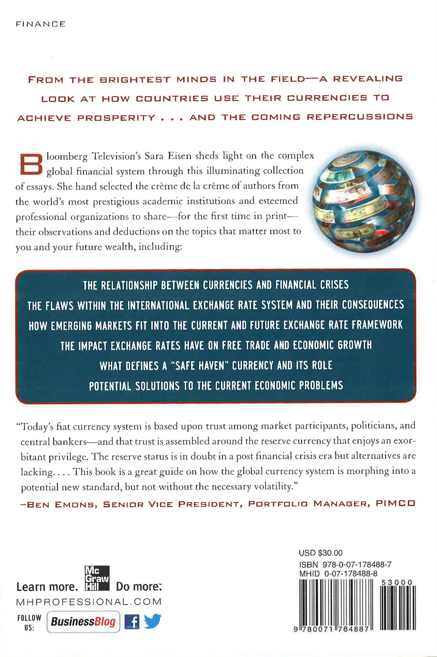 From the brightest minds in the field-a revealinglook at how countries use their currencies toachieve prosperity . . . and the coming repercussionsBloomberg Television's Sara Eisen sheds light on the complex global financial system through this illuminating collection of essays. She hand selected the creme de la creme of authors from the world's most prestigious academic institutions and esteemed professional organizations to share--for the first time in print-- their observations and deductions on the topics that matter most to you and your future wealth, including:THE RELATIONSHIP BETWEEN CURRENCIES AND FINANCIAL CRISESTHE FLAWS WITHIN THE INTERNATIONAL EXCHANGE RATE SYSTEM AND THEIR CONSEQUENCESHOW EMERGING MARKETS FIT INTO THE CURRENT AND FUTURE EXCHANGE RATE FRAMEWORKTHE IMPACT EXCHANGE RATES HAVE ON FREE TRADE AND ECONOMIC GROWTHWHAT DEFINES A "SAFE HAVEN" CURRENCY AND ITS ROLEPOTENTIAL SOLUTIONS TO THE CURRENT ECONOMIC PROBLEMS"Today's fiat currency system is based upon trust among market participants, politicians, and central bankers--and that trust is assembled around the reserve currency that enjoys an exorbitant privilege. The reserve status is in doubt in a post financial crisis era but alternatives are lacking. . . . This book is a great guide on how the global currency system is morphing into apotential new standard, but not without the necessary volatility." -- Ben Emons, Senior Vice President, Portfolio Manager, PIMCO