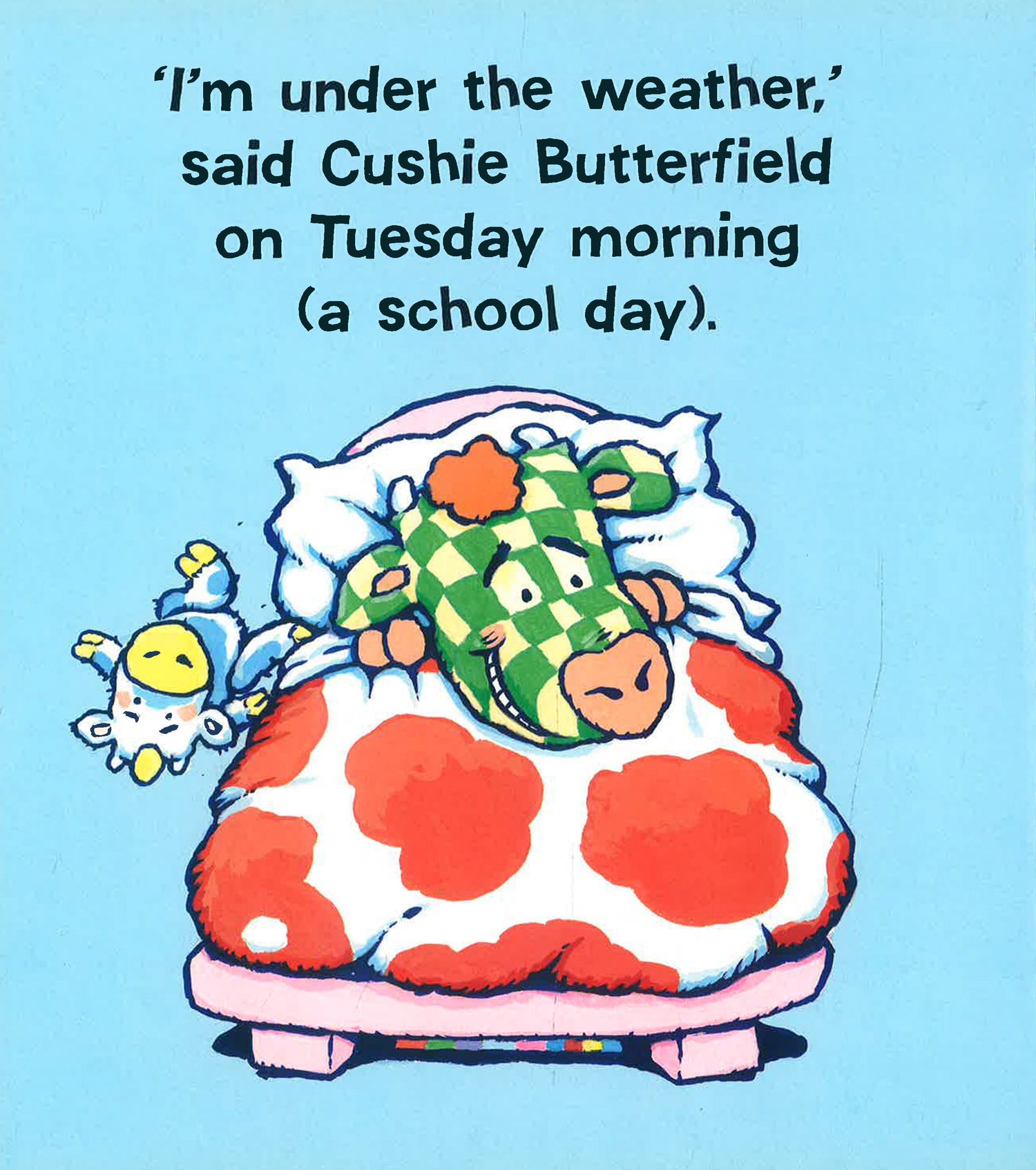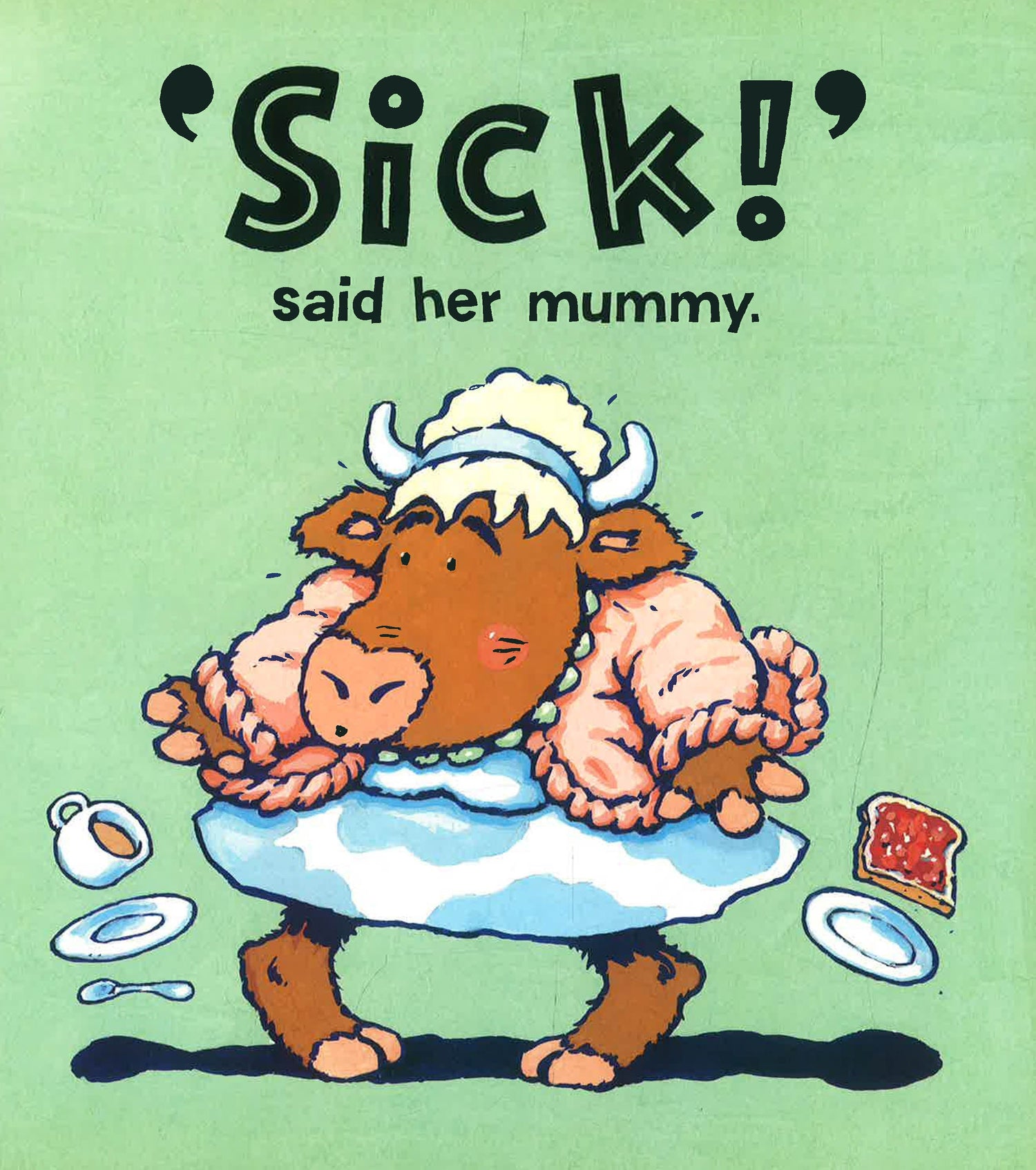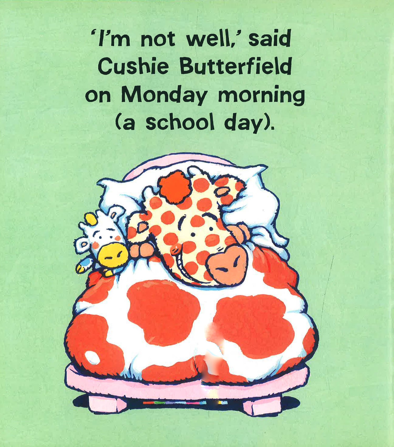 Cushie is feeling too sick to go to school, even her friends and family can see how poorly she has become. Her face is covered firstly with red spots, which then develops into green and yellow cheeks and then with blue triangles?