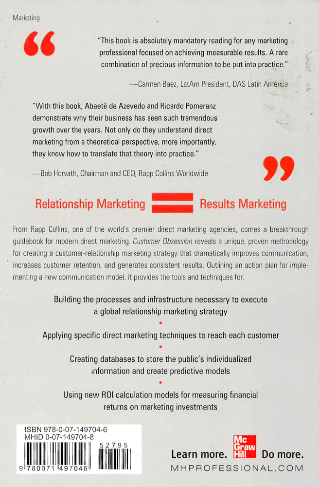 Customer Obsession is an invaluable hands-on guide to the next generation of customer relationship marketing. Abaete de Azevedo and Ricardo Pomeranz, top leaders at the world-renowned direct marketing agency Rapp Collins, reveal how businesses of any size can develop a global strategy that embraces today's empowered consumers and encourages the development of meaningful, profitable relationships with them. Sharing insider details from Rapp Collins's breakthrough methodology, the authors provide the tools to implement the next level of relationship marketing, enabling you to pinpoint the unique value of every customer and specific direct marketing techniques for winning them over.You get practical steps for integrating your brand communications and identifying a strong marketing concept to create a campaign that establishes personalized connections with consumers. Then, you'll learn how to:Implement your relationship marketing program in four phases: strategic analysis, planning, implementation, and controlUtilize databases to gather individualized information and create targeted messagesCreate specific campaigns that are relevant to different segments of consumersMeasure marketing campaign results with ROI calculation modelsDevelop practices that will continuously improve ROIRounding out this invaluable guide are illuminating case studies of numerous national and international brands that successfully used relationship marketing to meet their communication needs. Customer Obsession is the definitive roadmap for all businesses that want to achieve the maximum return for their marketing investments.