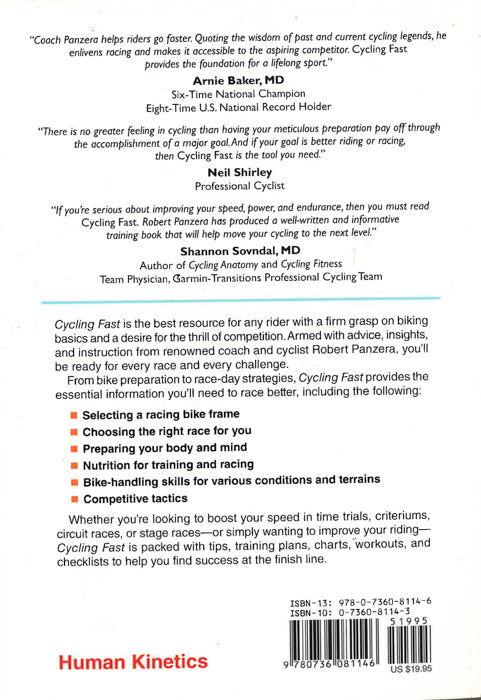 Cycling Fast is the best resource for any rider with a firm grasp on biking basics and a desire for the thrill of competition. Armed with advice, insights, and instruction from renowned coach and cyclist Robert Panzera, you'll be ready for every race and every challenge. From bike preparation to competitive tactics, Cycling Fast provides the essential information you'll need in order to master each event: * Choosing the right race for your skills, talent, and experience * Preparing your body and preparing your mind * Nutrition for training, racing, and recovery * Bike-handling skills for various conditions, environments, and terrains * Race-day strategies Cycling Fast also includes the latest information on new high-tech racing frames, training with a power meter and heart rate monitor, and coordinating your tactics as part of a team. Whether you're in a criterium, a time trial, or a stage race or simply looking to ride faster, Cycling Fast is packed with training plans, tips, charts, and checklists that will translate to success at the finish line.