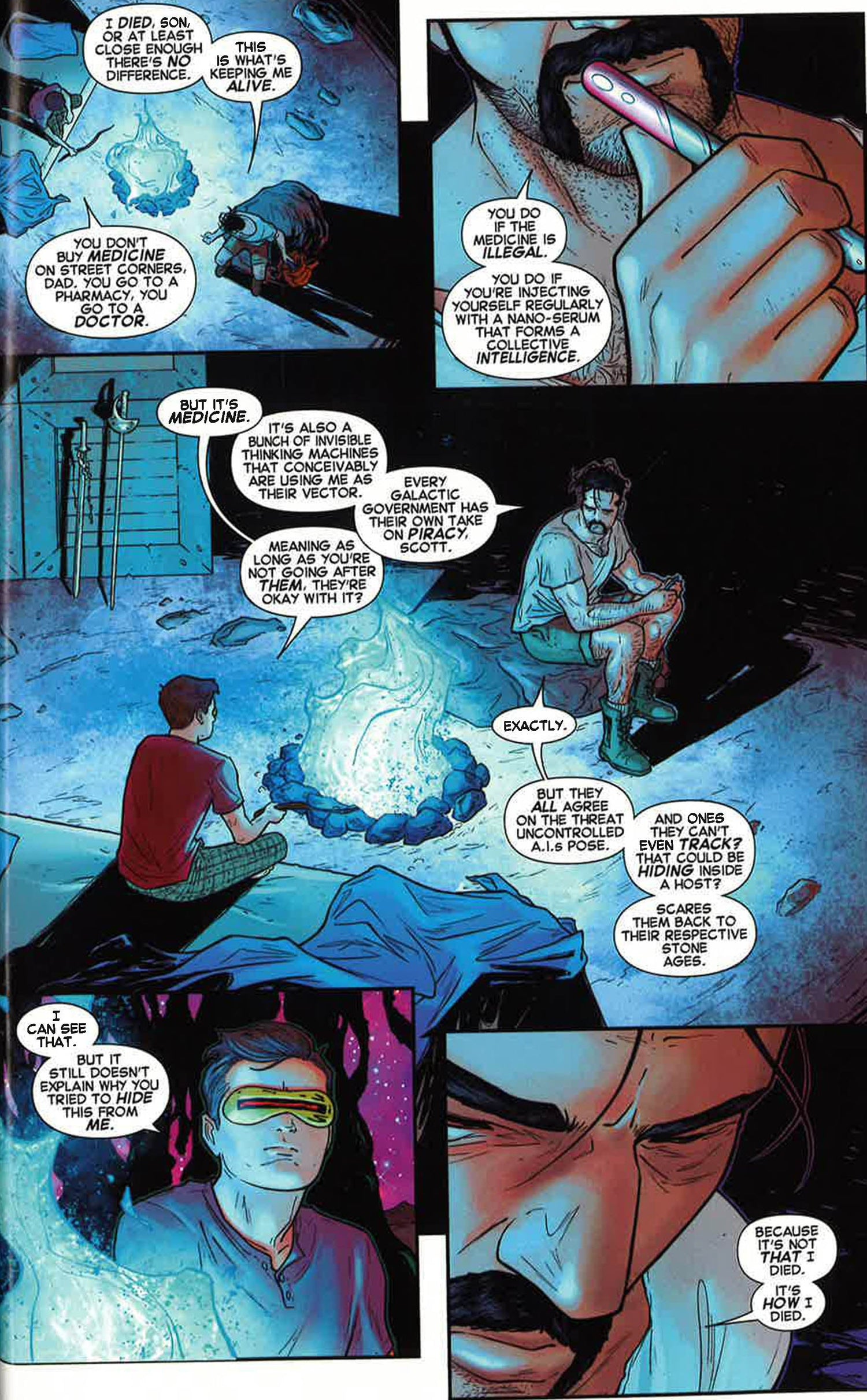 Cyclops just discovered that the father he thought died long ago is alive and well... and A Space Pirate! Spinning directly out of All-New X-Men, comes the first ongoing solo series for one of the time-traveling Original X-Men. After the events of Trial of Jean Grey,' Scott Summers stays in space to learn some valuable lessons from his dad: 1) How to shave, 2) How to talk to girls, 3) How to steal a Badoon spaceship.'