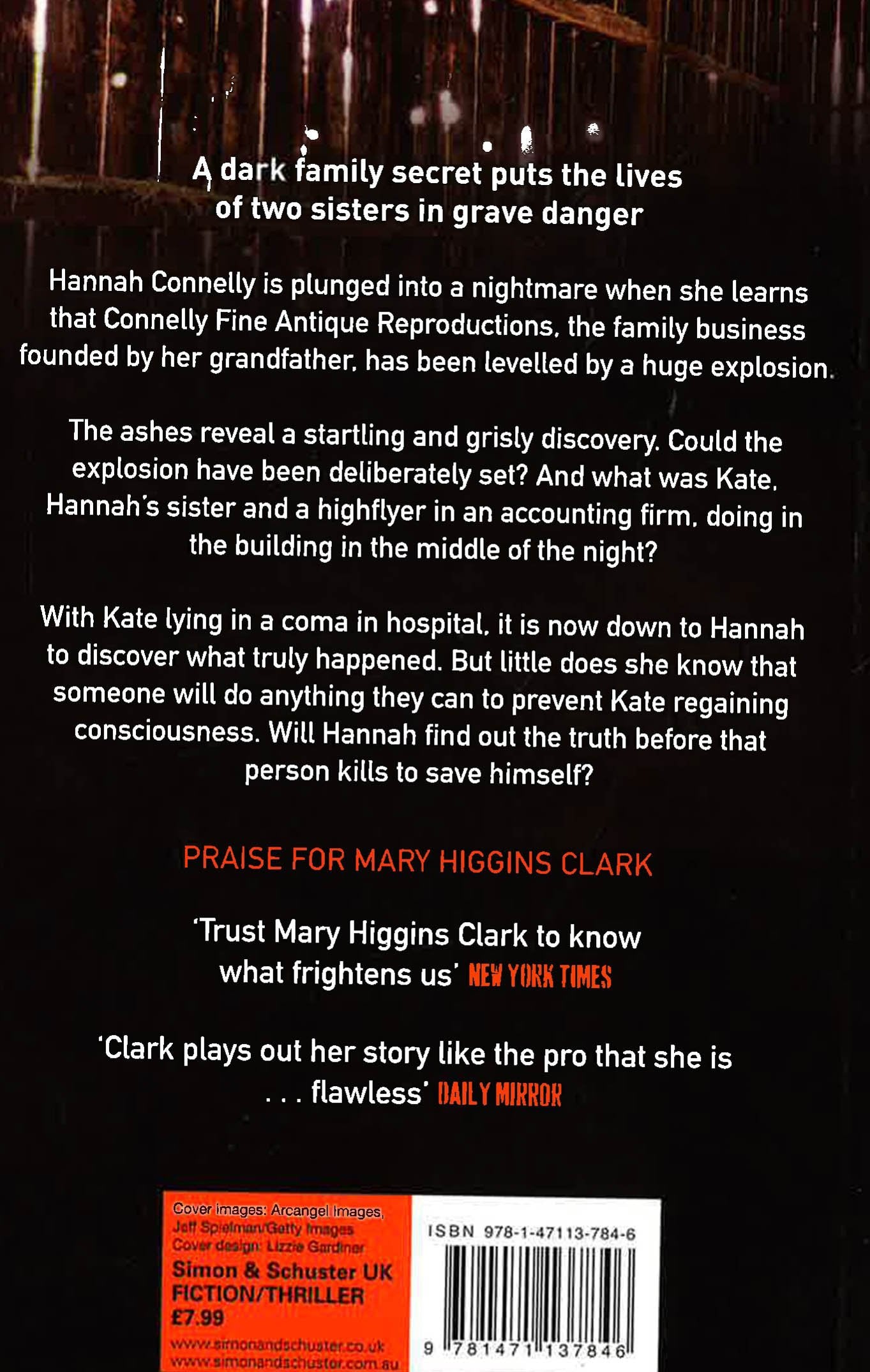 A dark family secret puts the lives of two sisters in grave danger Hannah Connelly is plunged into a nightmare when she learns that Connelly Fine Antique Reproductions, the family business founded by her grandfather, has been levelled by a huge explosion. The ashes reveal a startling and grisly discovery. Could the explosion have been deliberately set? And what was Kate, Hannah's sister and a highflyer in an accounting firm, doing in the building in the middle of the night? With Kate lying in a coma in hospital, it is now down to Hannah to discover what truly happened. But little does she know that someone will do anything they can to prevent Kate regaining consciousness. Will Hannah find out the truth before that person kills to save himself?