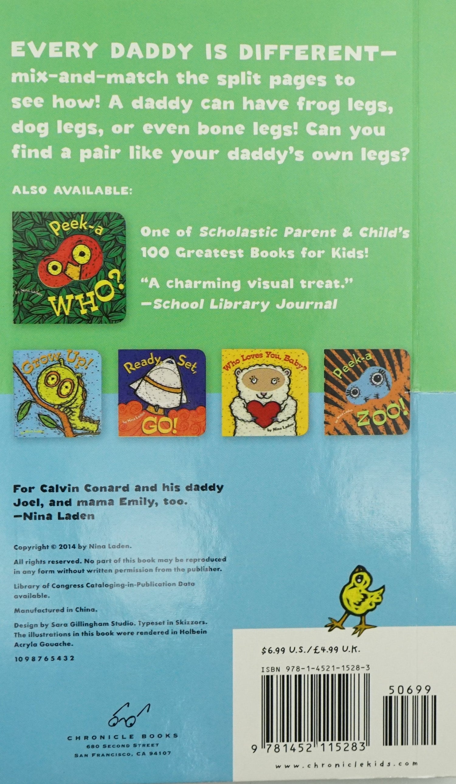 Every daddy is different and here's the proof! A daddy can have frog legs, dog legs, or even bone legs! Mix and match the pages to make daddies with matching torsos and legs, or mix tops and bottoms to make daddies that are part hairy, part scaly and wholly loving. In this a fun, interactive format that bridges book and game, children will learn the power of adjectives in a visual and hilarious way, with Nina Laden's trademark humour, innovation and playful rhymes.