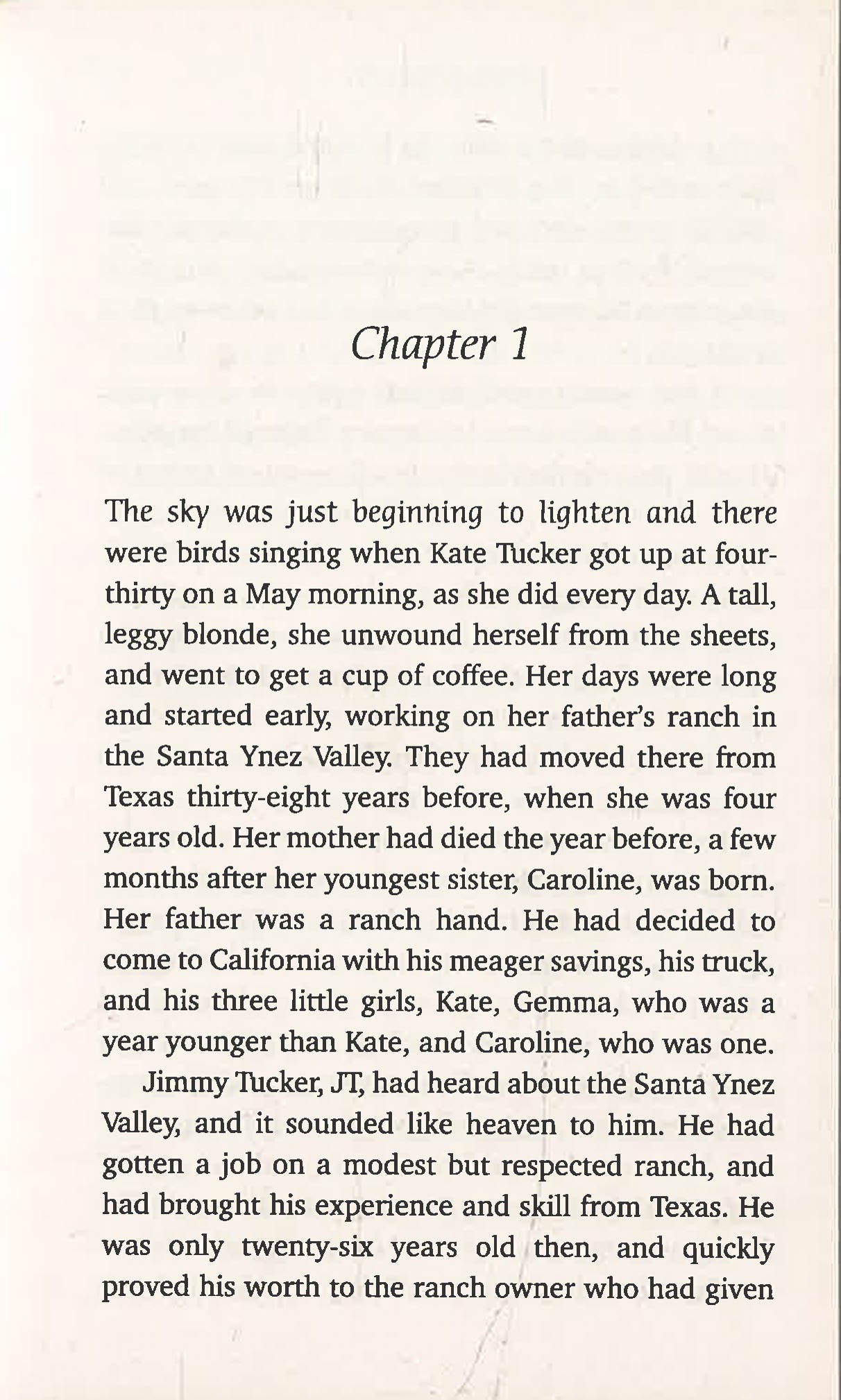 Decades ago, after the death of his wife, Texas ranch hand JT Tucker took his three small daughters to California to start a new life. With almost no money, a will of iron, and hard work, he eventually built the biggest ranch in California. But when he dies suddenly at the age of sixty-four, the ranch is inherited by his three daughters—each of them finding it impossible to believe that this larger-than-life figure is gone from their lives.
