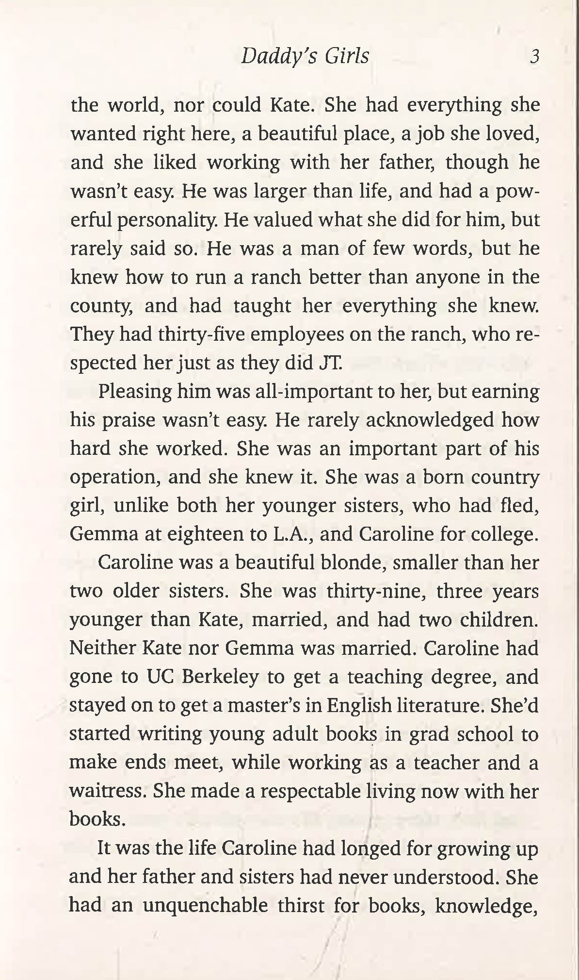 Set against the magnificent backdrop of the West and the drama of a family in turmoil, Daddy’s Girls is the story of three remarkable women and their unique bond to each other—the daughters of a complex, many-faceted, domineering father who left his mark on each of them.