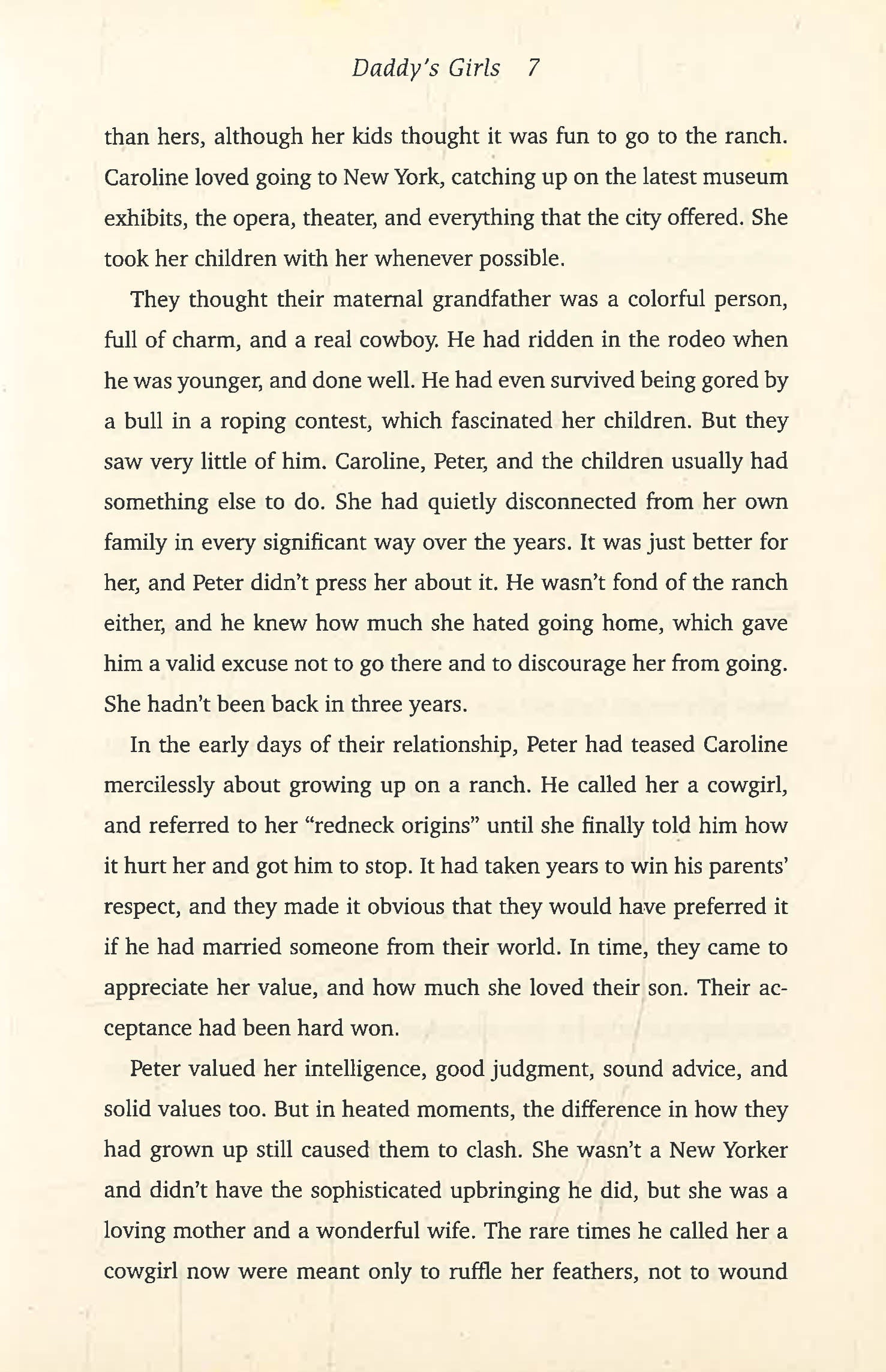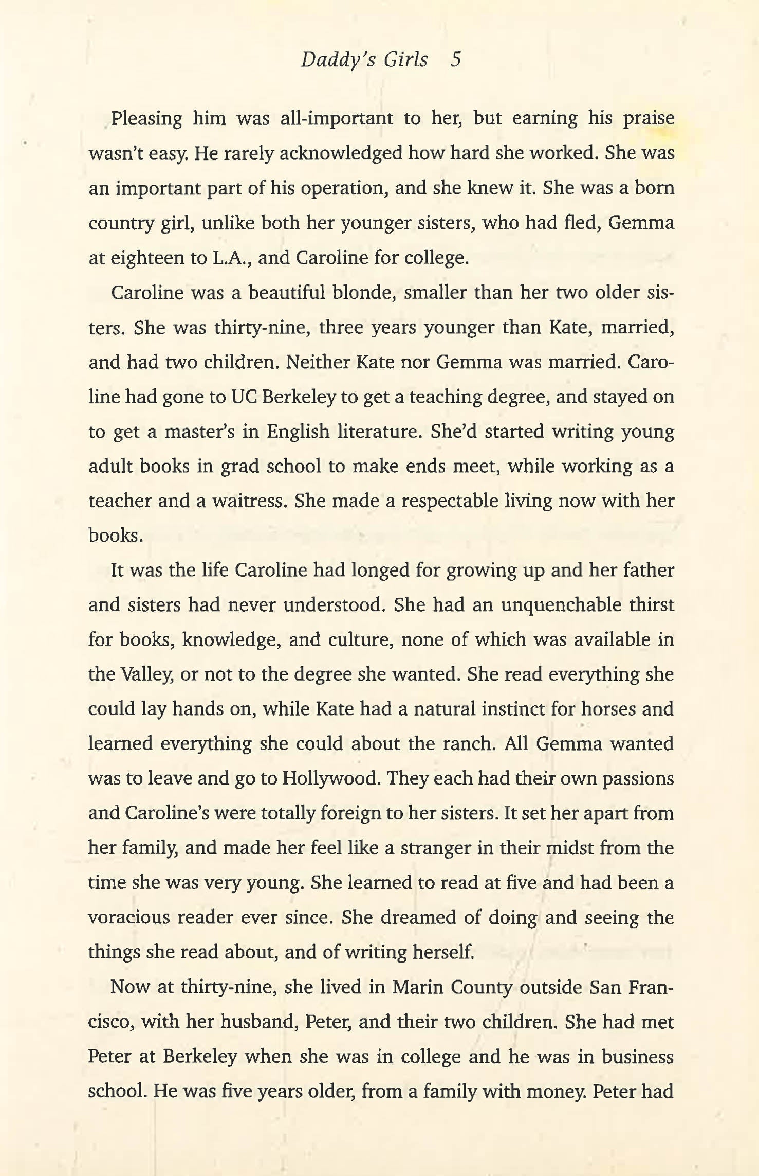 Caroline, the youngest, was overlooked by her father. She fled the ranch as early as she could to become a wife and mother, pursuing a career writing children’s books. Gemma, his declared favourite, yearned for Hollywood glamour and became a major TV star. Kate, the eldest, stayed to work on the ranch, forsaking relationships and family for a father who took her for granted.
