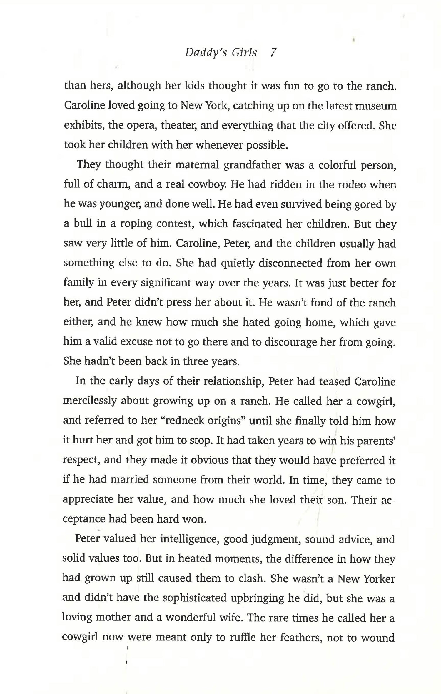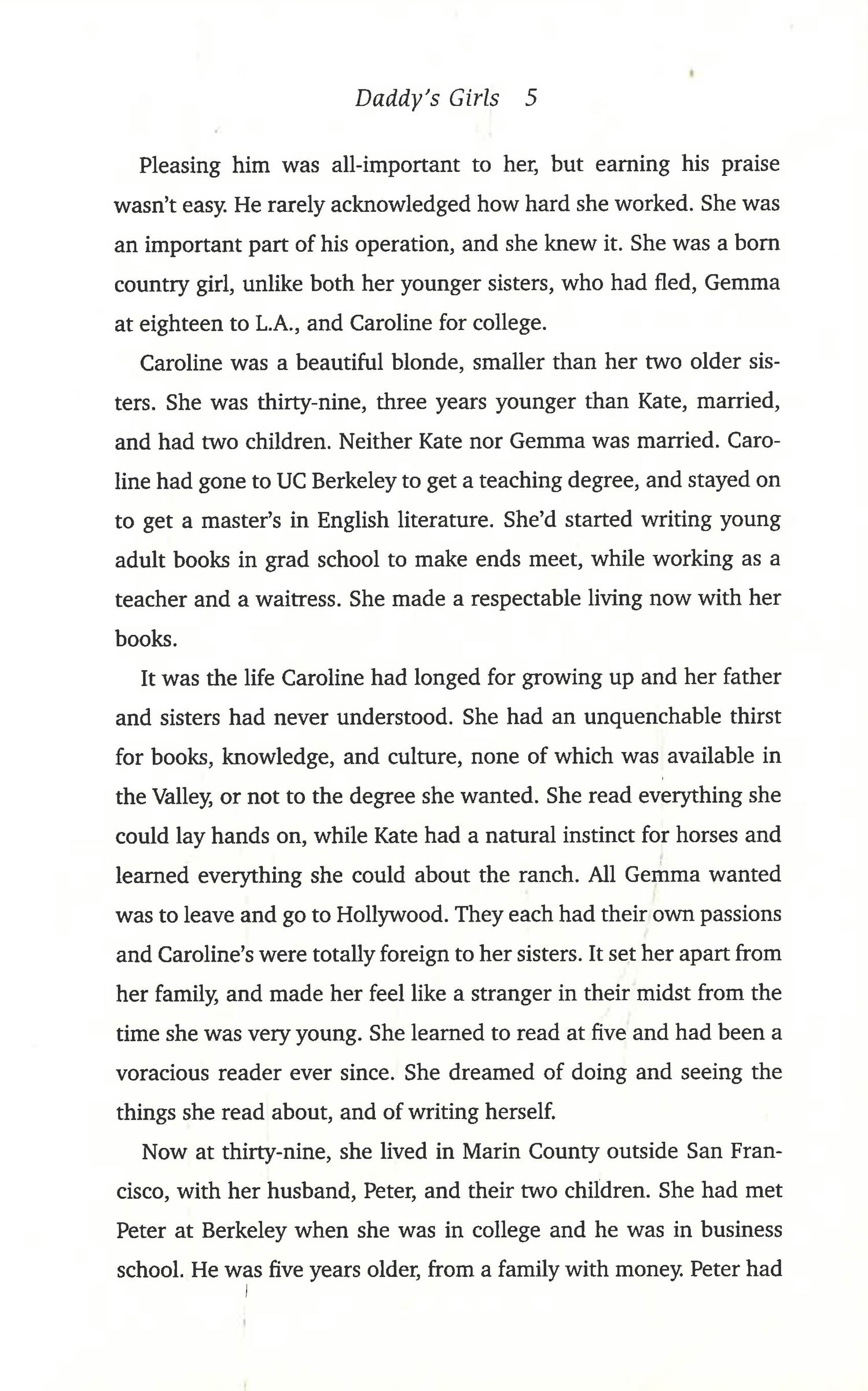 Set against the magnificent backdrop of the West and the drama of a family in turmoil, Daddy’s Girls is the story of three remarkable women and their unique bond to each other—the daughters of a complex, many-faceted, domineering father who left his mark on each of them.