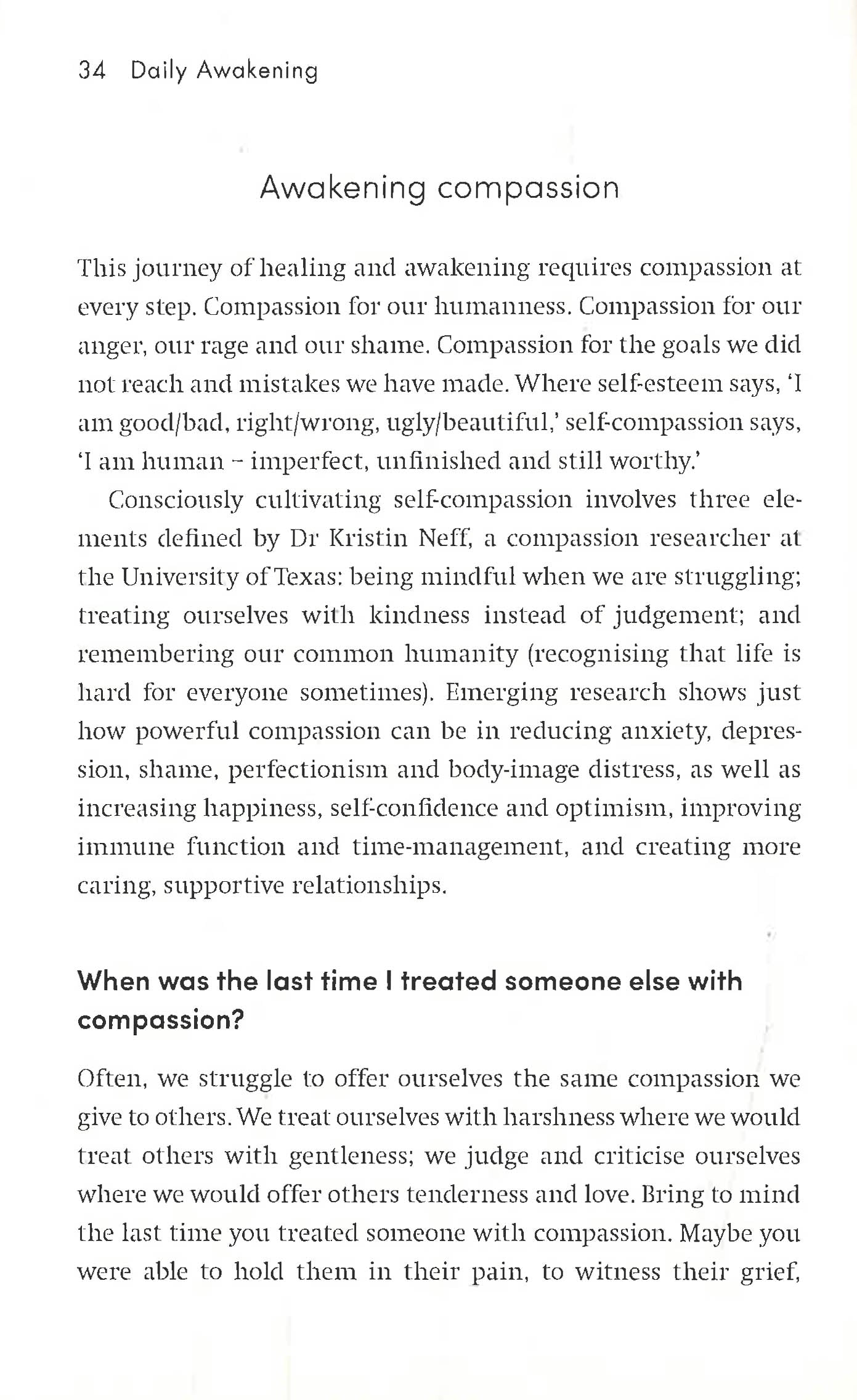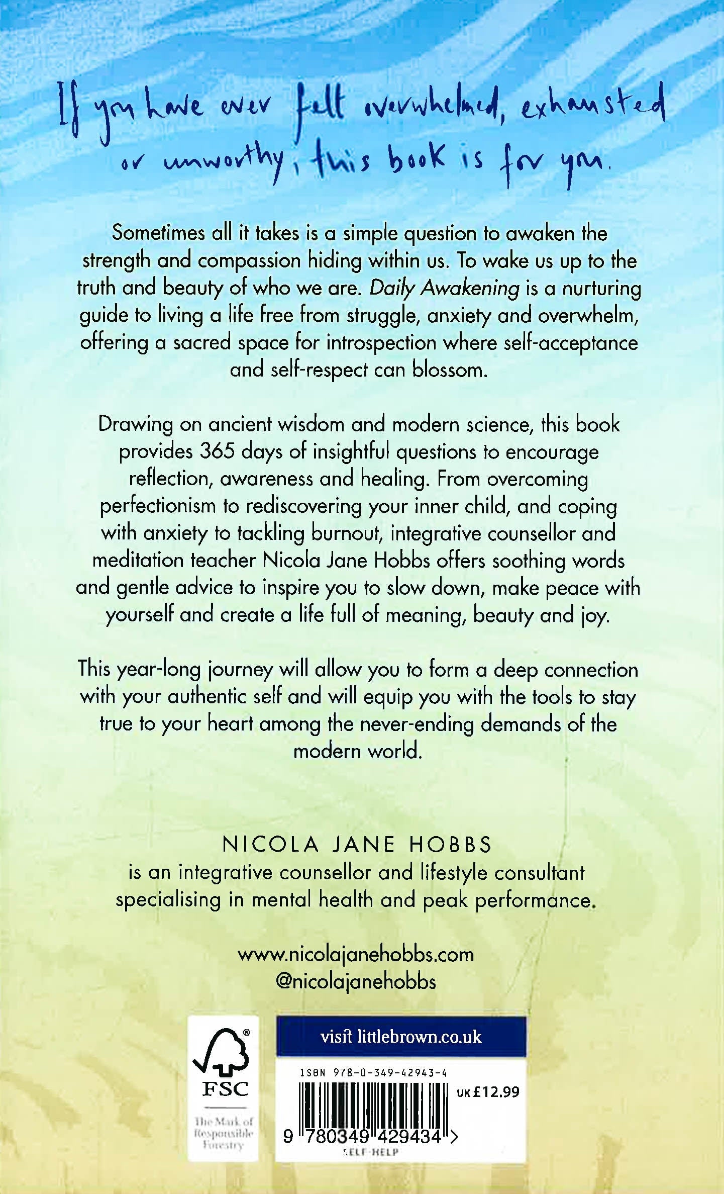 Sometimes all it takes is a simple question to awaken the strength and compassion hiding within us. To wake us up to the truth and beauty of who we are. Daily Awakening is a nurturing guide to living a life free from struggle, anxiety and overwhelm, offering a sacred space for introspection where self-acceptance and self-respect can blossom. Drawing on ancient wisdom and modern science, this book provides 365 days of insightful questions to encourage reflection, awareness and healing. From overcoming perfectionism to rediscovering your inner child, and coping with anxiety to tackling burnout, integrative counsellor and meditation teacher Nicola Jane Hobbs offers soothing words and gentle advice to inspire you to slow down, make peace with yourself and create a life full of meaning, beauty and joy.
