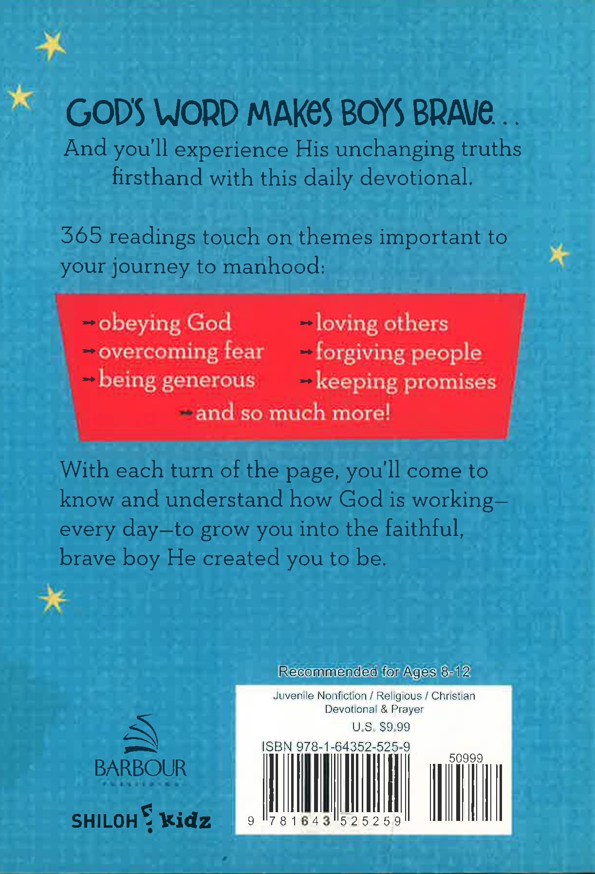 On his path to Christian manhood, every boy meets timeless challenges, including overcoming fear, making good choices, loving others, being generous, and obeying God. Each entry in this daily devotional includes a reading on bravery, a Scripture passage from the easy-to-understand NLV, and more. Ages 8 to 12.