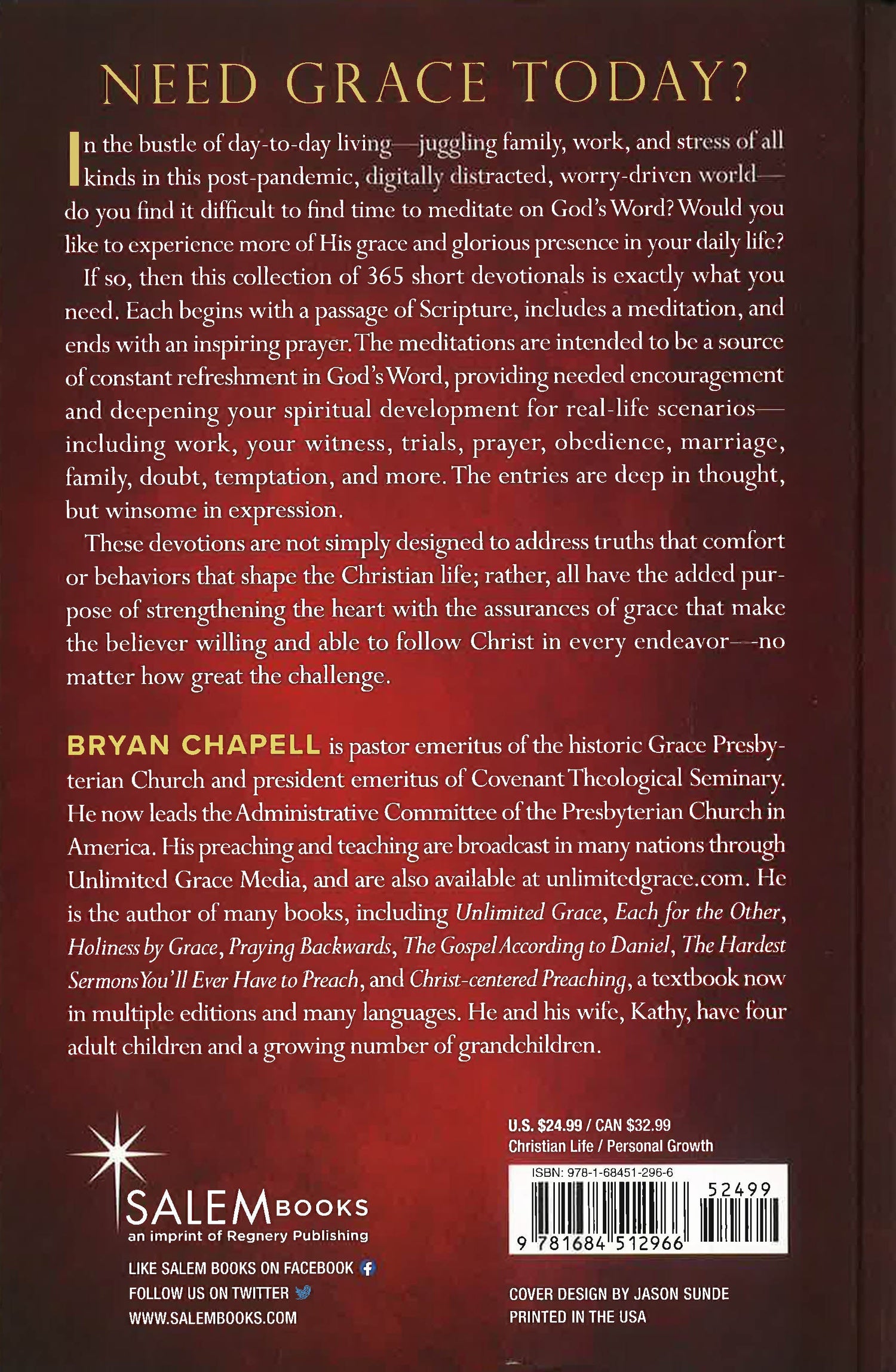 This special collection of brief devotional thoughts for each day from Bryan Chapell reflects God's unlimited grace in Scripture in our daily lives. Each devotional begins with a passage of Scripture. Chapell then shows the reader how God's grace shines through the verses and concludes with an inspiring prayer.