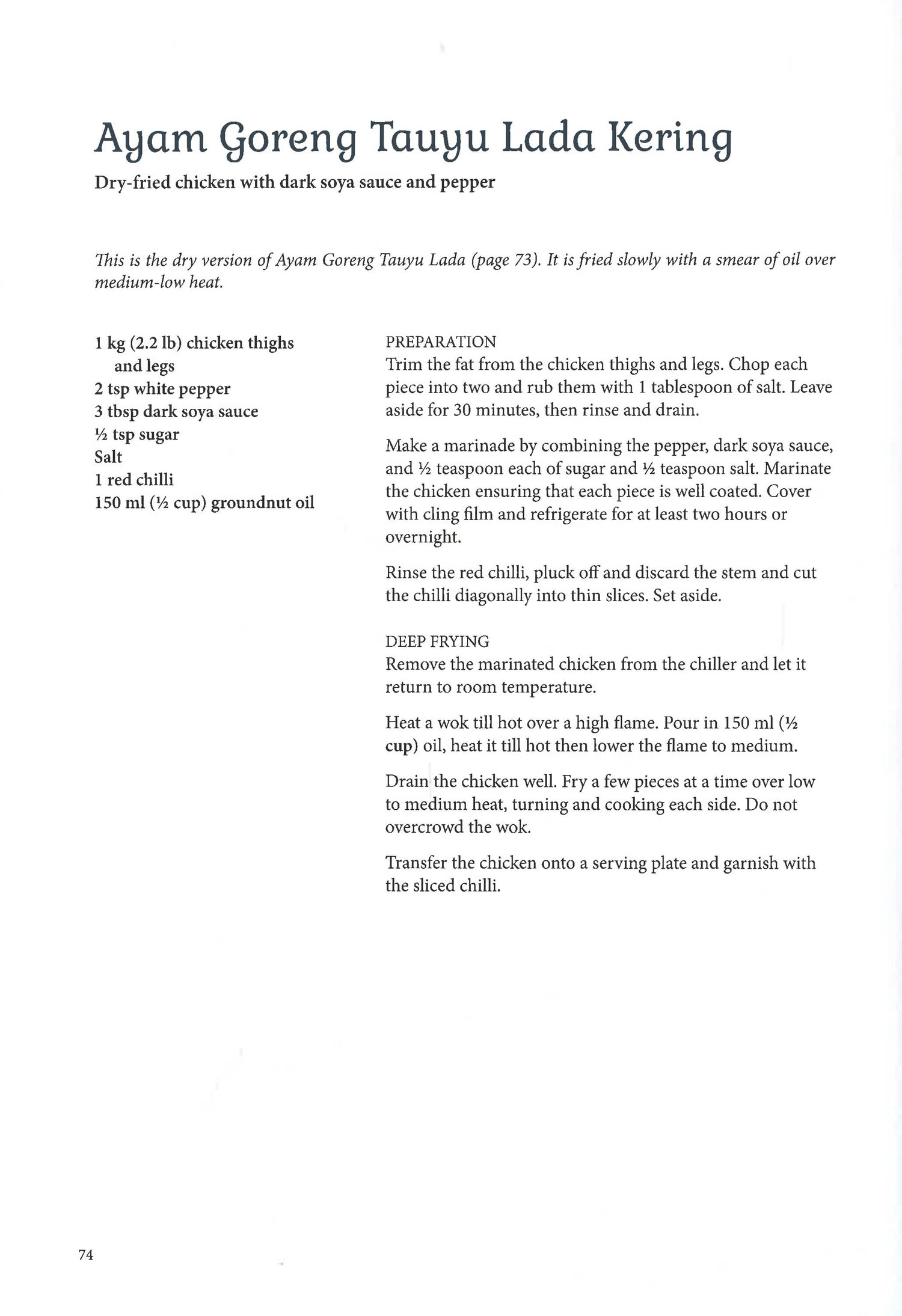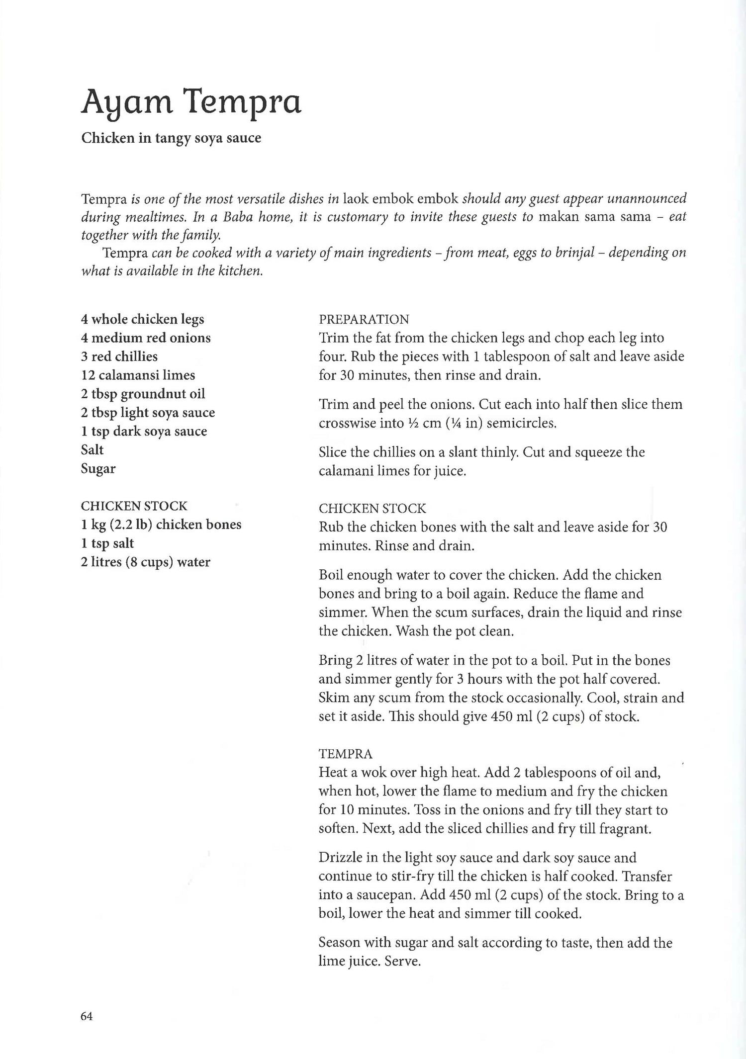 This food is not the festive cuisine of Ayam Buah Keluak, Babi Pongteh, and Bakwan Kepiting that are the staples of many Peranakan cookbooks available in bookshops. The daily Nonya dishes are more simple fare, but no less delicious. Food like Ayam Goreng Tauyu Lada Manis (fried chicken with sweet black soya sauce and pepper), Babi Tempra (pork in tangy soya sauce), Gerago Goreng Tepong (krill fritters), Belimbi Masak Taucheo (belimbing in fermented soya bean), and Telor Dadair Empat Daon (four-herb omelette).