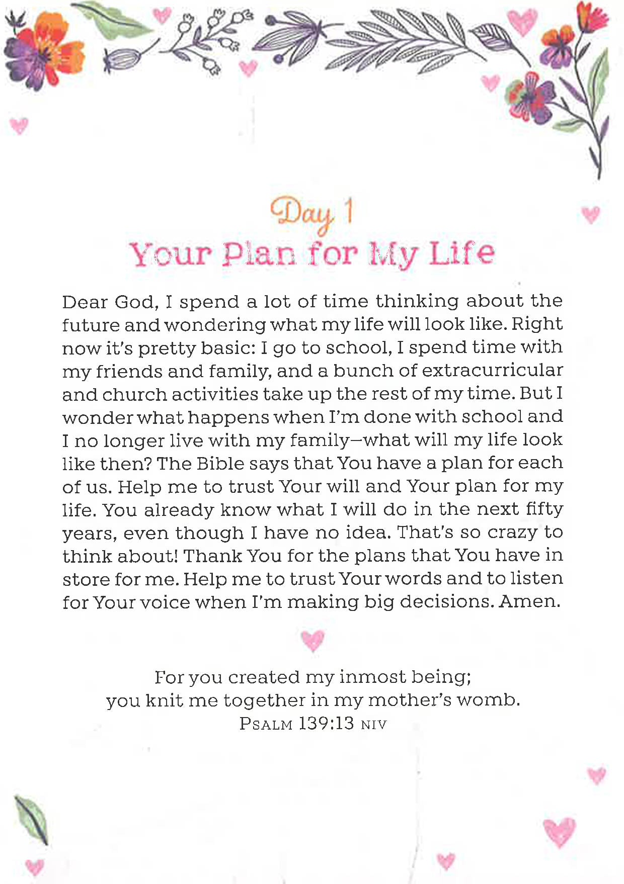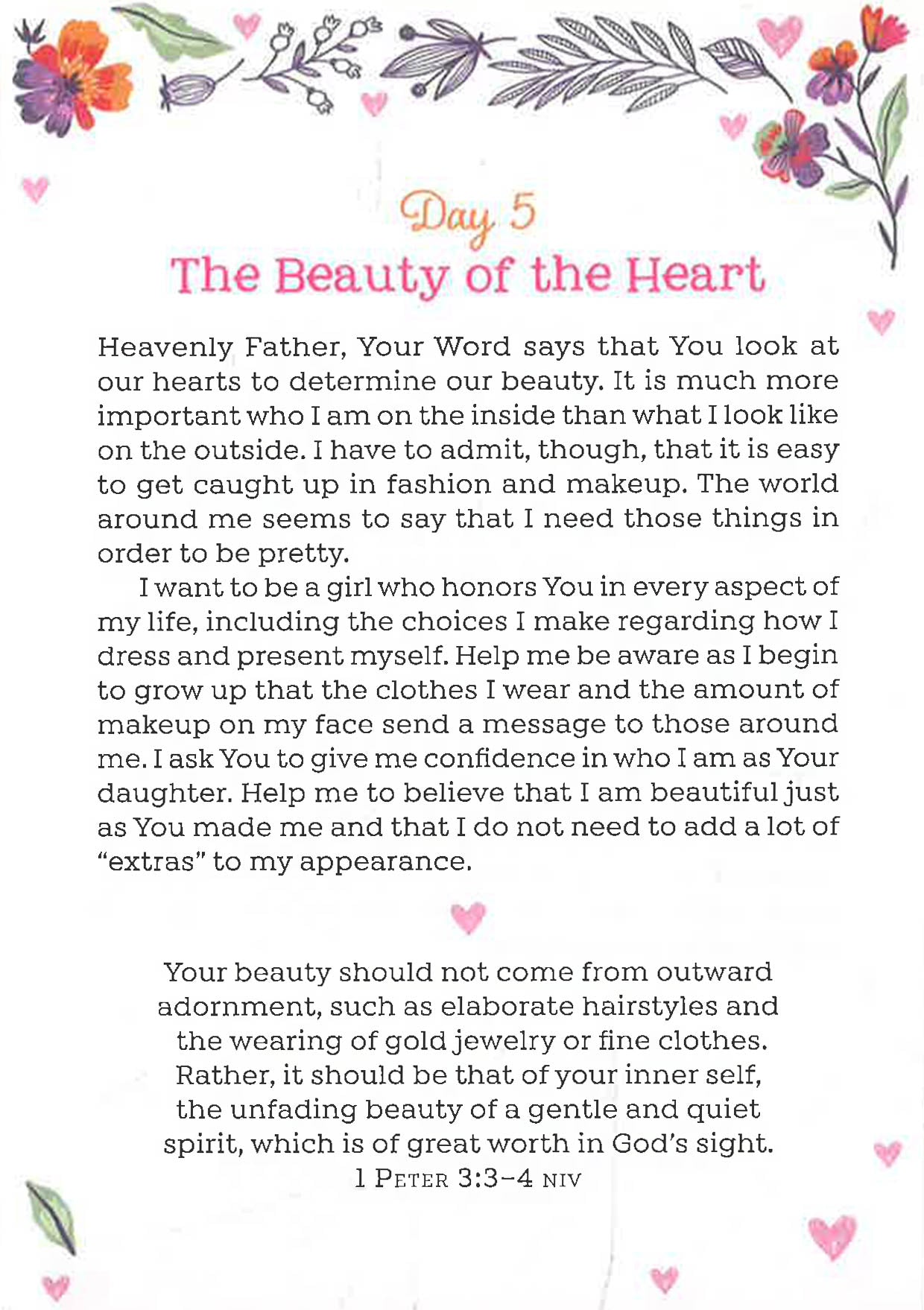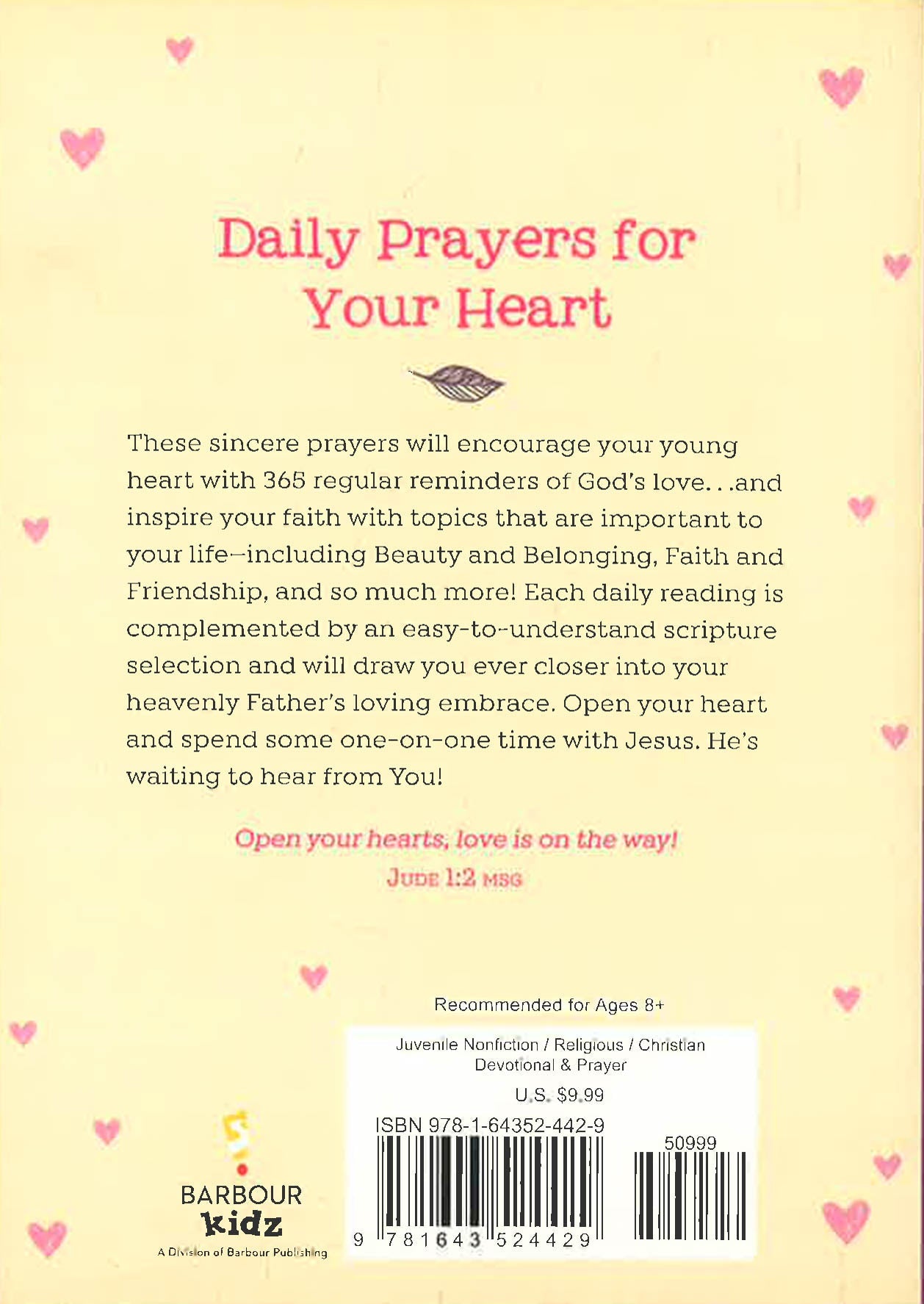 Introducing Daily Prayers for a Girl's Heart, an inspiring prayer book for your girls ages 8 and up. 365 heartfelt prayers will encourage young hearts with regular reminders of God’s love. Daily prayers touch on relevant life topics—such as, Faith, Friendship, Beauty, and Belonging. . . Each engaging and thought-provoking prayer is complemented by easy-to-understand scripture selections and will inspire girls to grow up God's way. Daily Prayers for a Girl's Heart is a great any-occasion gift for girls—all in one fun, creative package.