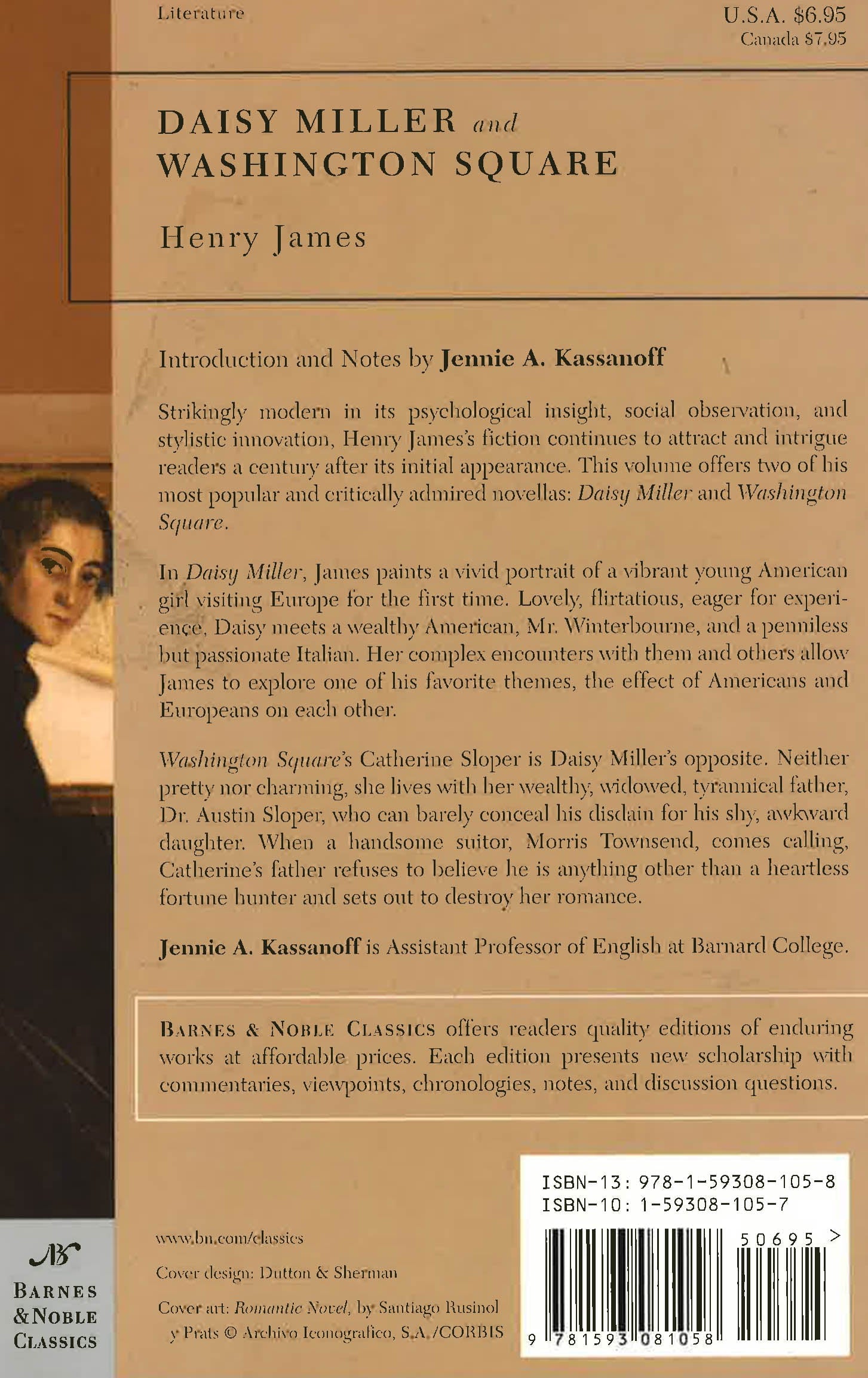 Henry James's slim novel Daisy Miller chronicles an American girl's excursions into the sophisticated world of European society. Daisy's innocence and impulsiveness lead her into a series of adventures--until her flirtations bring her to the brink of tragedy. Graham Greene once called Washington Square "the only novel in which a man has successfully invaded the feminine field and produced work comparable to Jane Austen's." This immensely readable novel of New York City society details the pitfalls faced by Catherine Sloper, a young and plain woman who is courted by a man only interested in her money.