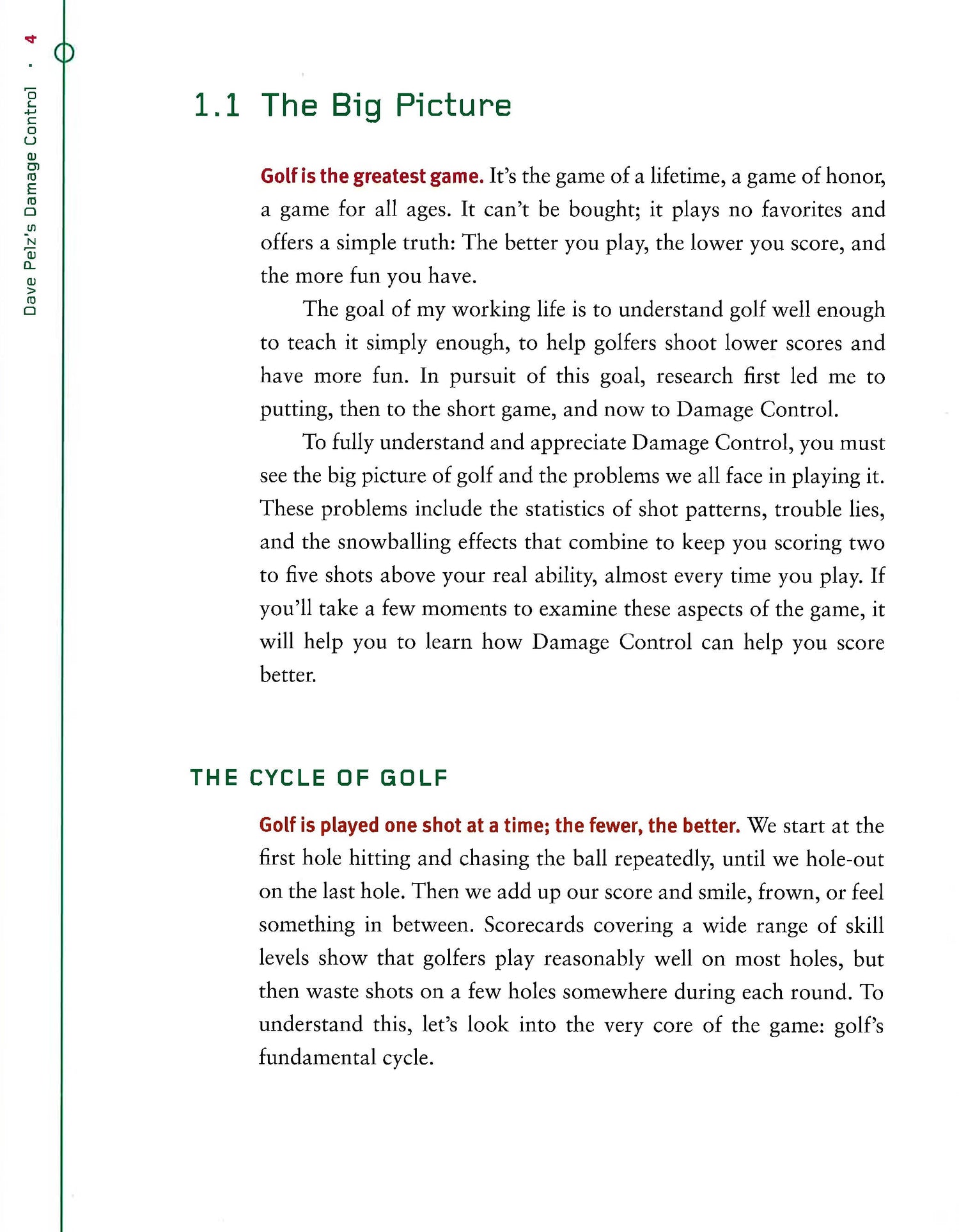 From the author of the phenomenally popular Short Game Bible and Putting Bible comes a third golf instruction title, focusing on a vital aspect of the game. Dave Pelz's training as a NASA scientist gives him a keen understanding of the importance of precision and he is the foremost authority on golf's short game. In Damage Control he explains how most golfers play below their handicap for most of their round - but then ruin their game by playing badly on just three or four holes. This book teaches how to control that damage: the 'set-up-ology' that will enable you to set up trouble shots correctly; the 'red-flag touch' that warns you when you're in danger of making a bad hole worse, and a proper 'damage control mentality'. Pelz is one of the few instructors whose books golfers read from cover to cover, implement every single one of his tips - and regularly see their handicaps drop like a stone. Damage Control is a must-have for any golfer looking to find an edge in their game.
