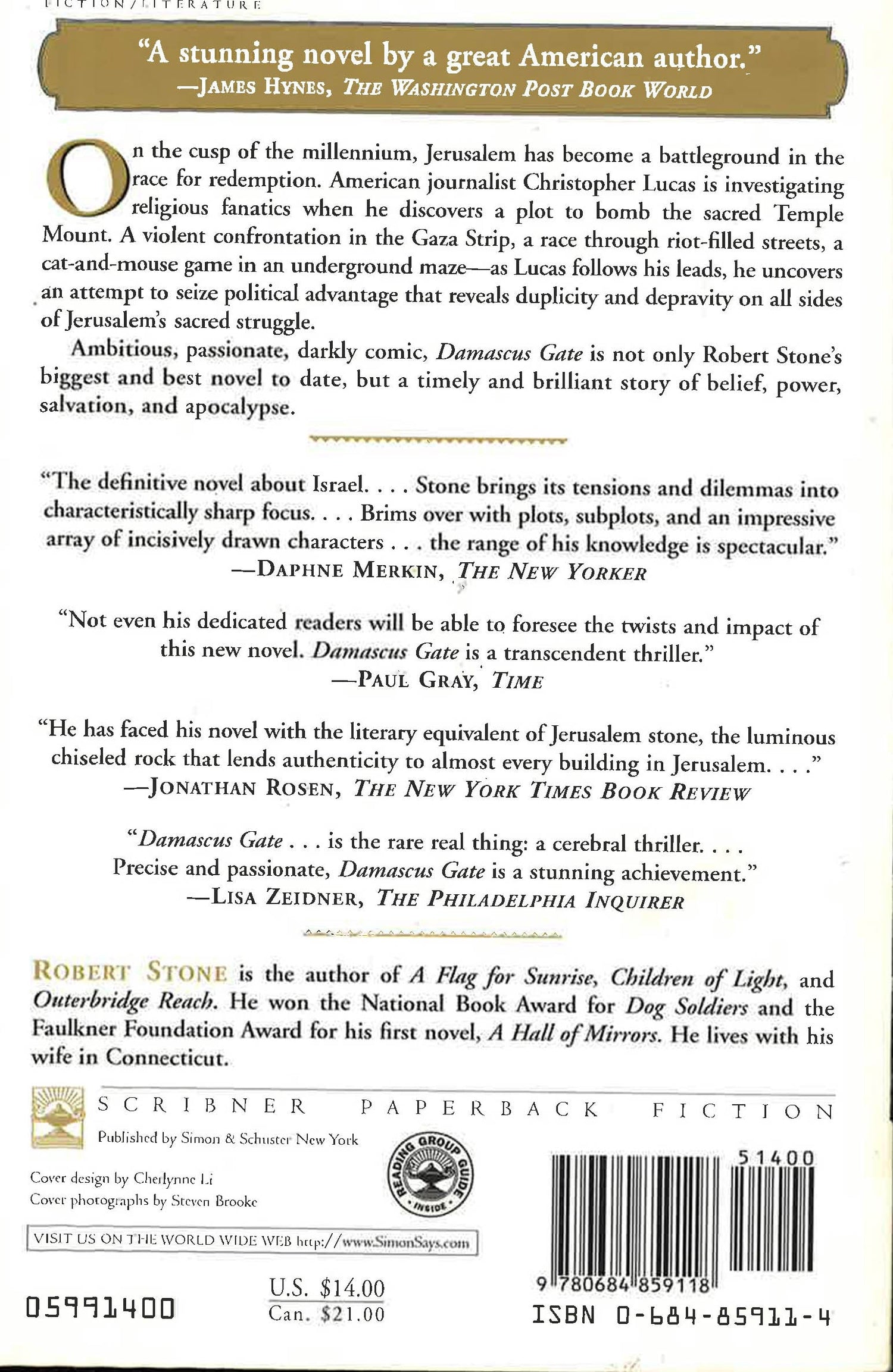 With soaring vision and profound intelligence, Robert Stone has written a harrowing, breathtaking novel about our desperate search, at any price, for the consolation of redemption—and about the people who are all too willing to provide it. A violent confrontation in the Gaza Strip, a mind-altering pilgrimage, a race through riot-filled Jerusalem streets, a cat-and-mouse game in an underground maze, a desperate attempt to prevent a bomb from detonating beneath the Temple Mount—Damascus Gate is an exhilarating journey through the moral and religious ambiguities that haunt the holiest of cities and its seekers, cynics, hustlers, and madmen. Set in Jerusalem, where violence, ecstasy, heresy, and salvation are all to be found, Damascus Gate is simultaneously the story of a man's search for truth—or some version of it—and the story of a city where sanity is casually traded for faith.