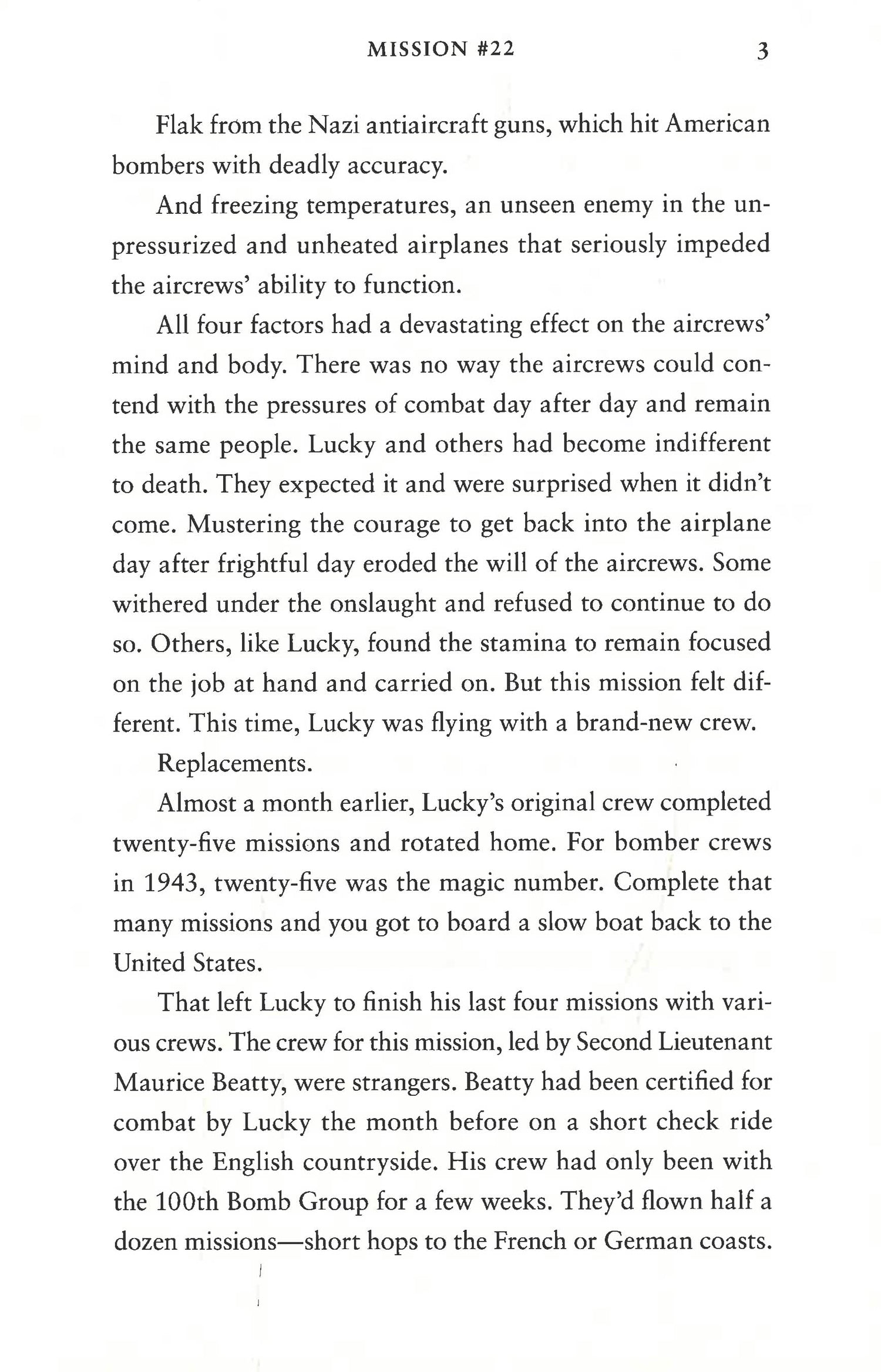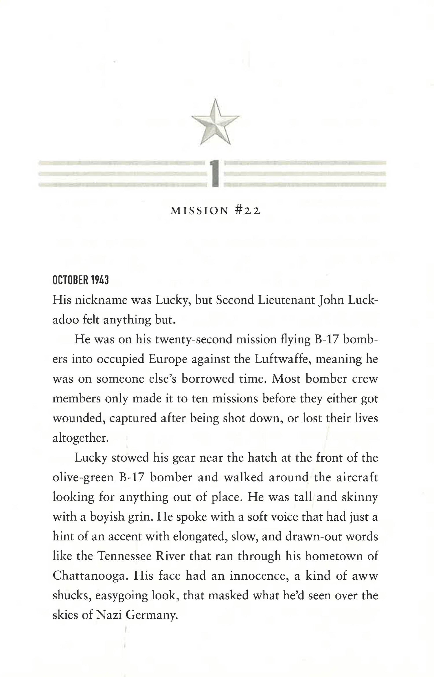 With a shrapnel torn Bible in his flight jacket pocket and his girlfriend's silk stocking around his neck like a scarf as talismans, Luckadoo piloted through Luftwaffe machine-gun fire and antiaircraft flak while enduring subzero temperatures to complete twenty-five missions and his combat service. The average bomber crew rarely survived after eight to twelve missions. Knowing far too many airmen who wouldn't be returning home, Luckadoo closed off his emotions and focused on his tasks to finish his tour of duty one moment at a time, realizing his success was more about being lucky than being skilled.