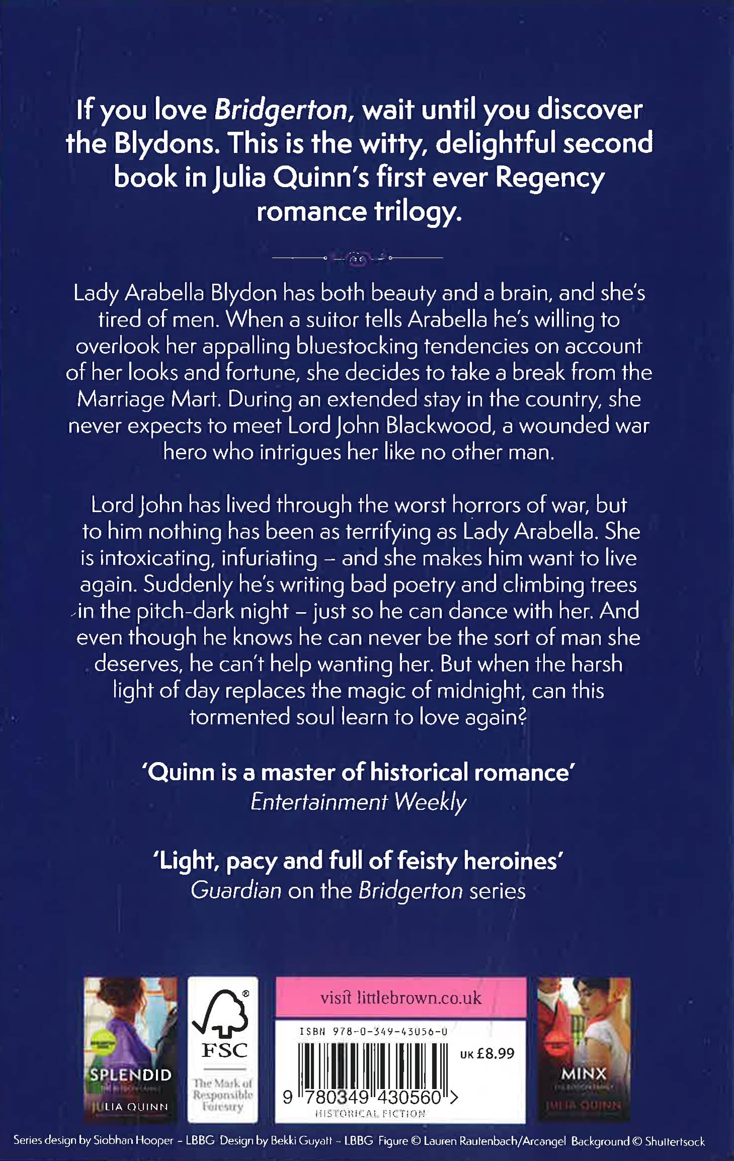 Lady Arabella Blydon has both beauty and a brain, and she's tired of men. When a suitor tells Arabella he's willing to overlook her appalling bluestocking tendencies on account of her looks and fortune, she decides to take a break from the Marriage Mart. During an extended stay in the country, she never expects to meet Lord John Blackwood, a wounded war hero who intrigues her like no other man.