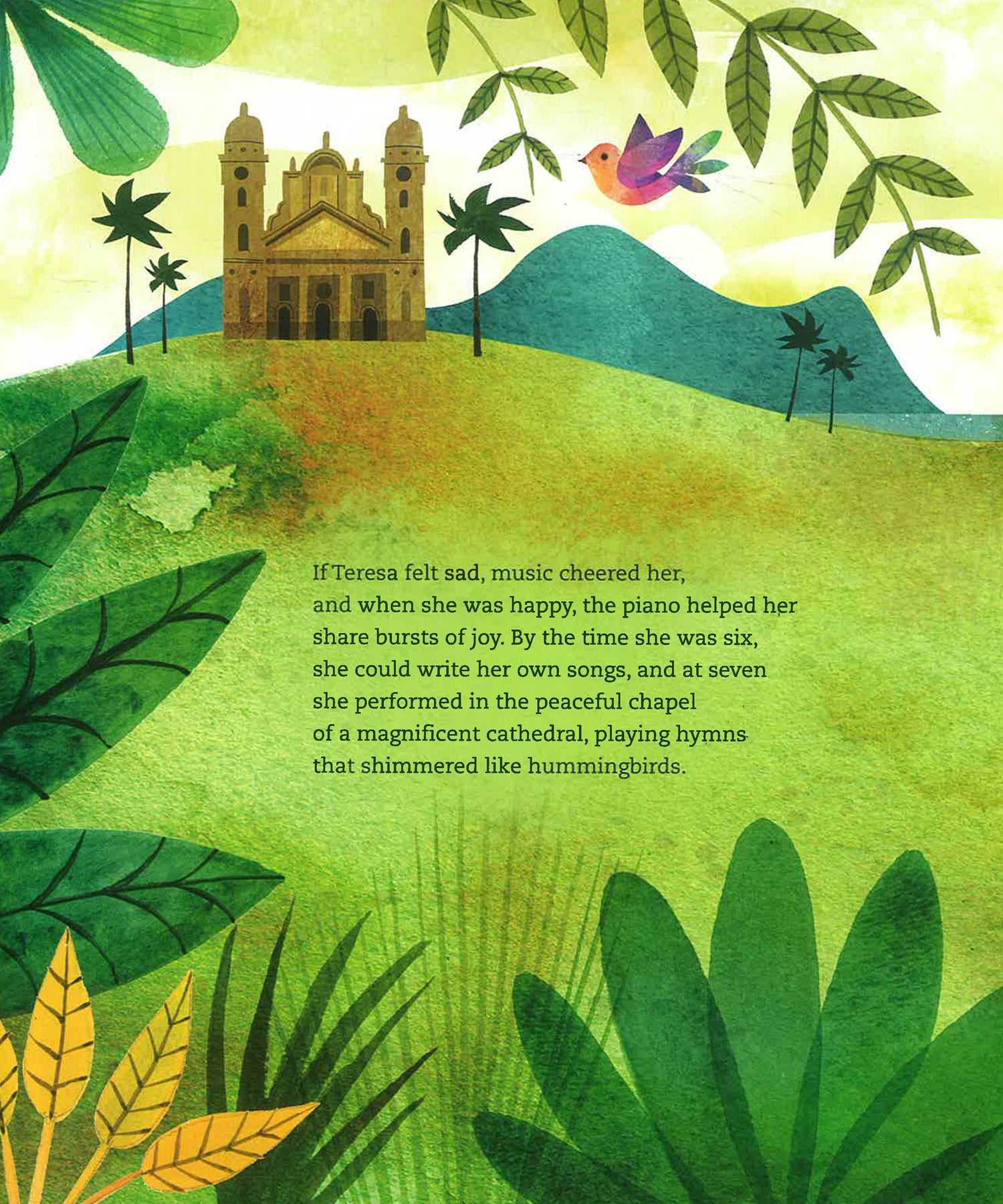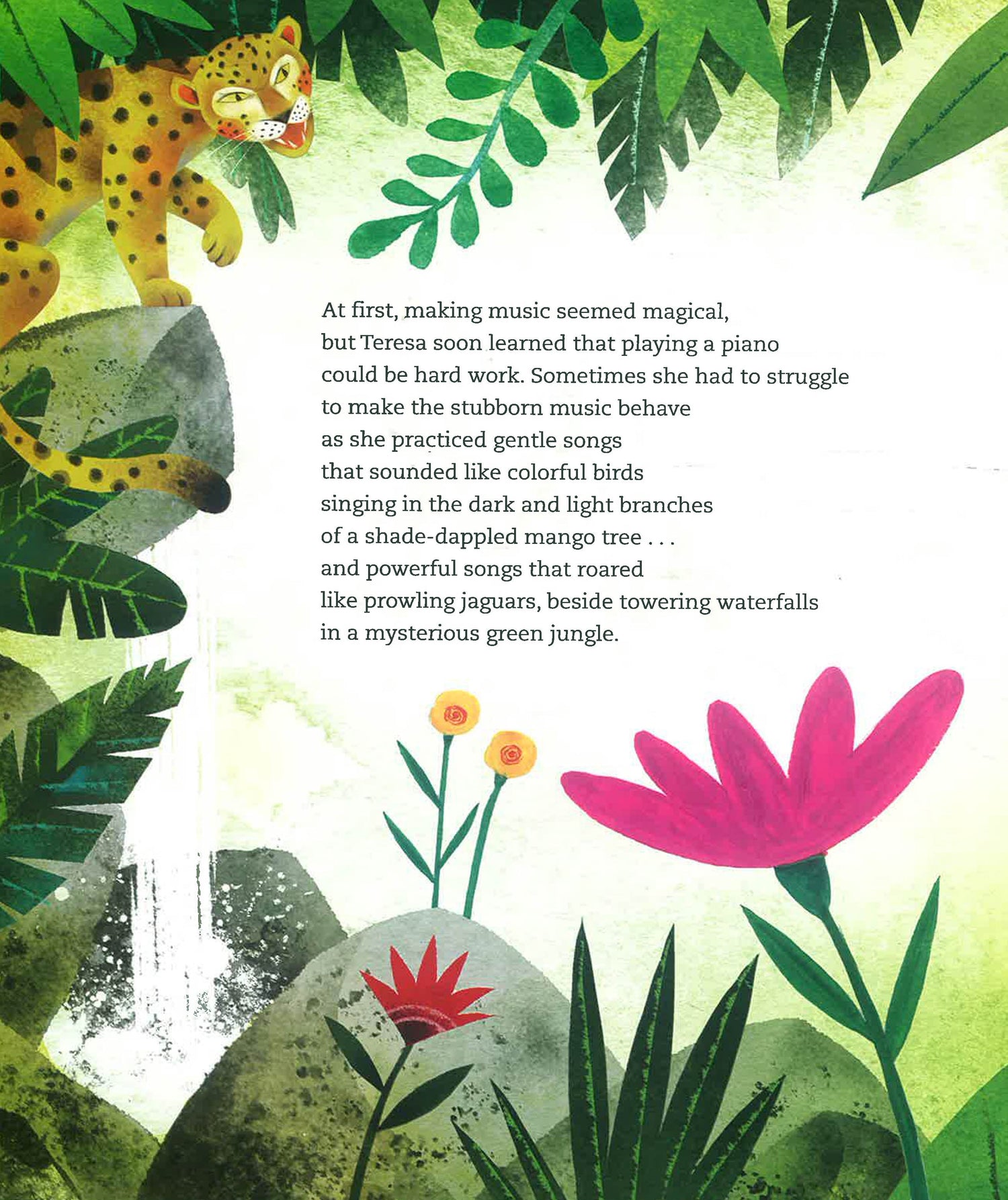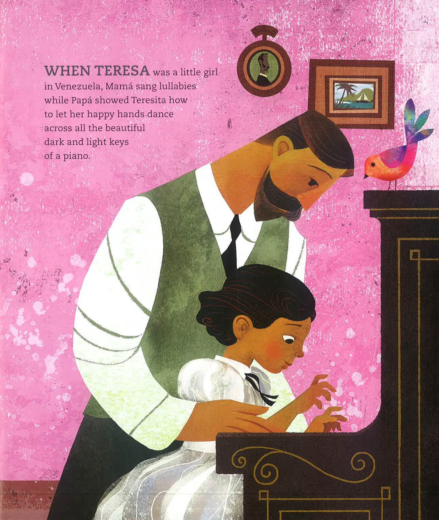 As a little girl, Teresa Carreño loved to let her hands dance across the beautiful keys of the piano. If she felt sad, music cheered her up, and when she was happy, the piano helped her share that joy. Soon she was writing her own songs and performing in grand cathedrals. Then a revolution in Venezuela forced her family to flee to the United States. Teresa felt lonely in this unfamiliar place, where few of the people she met spoke Spanish. Worst of all, there was fighting in her new home, too—the Civil War.