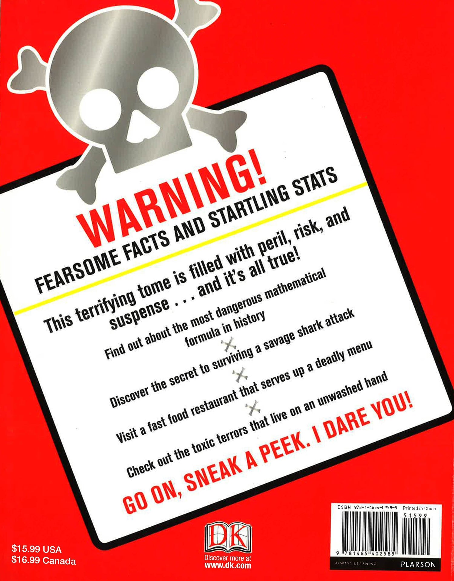 With "Danger!," young readers will tour the adrenaline-filled worlds of animals, nature, space, science, the human body, and more. Discover animals armed with sharp claws and killer jaws, deep-sea monsters, poisonous plants, and frogs falling from the sky, not to mention some of the world's most accident-prone humans and the most dangerous mathematical formula in history. An encyclopedia like no other, this guide will captivate kids of all ages as they explore the dangerously exciting world around them. Supports the Common Core State Standards.