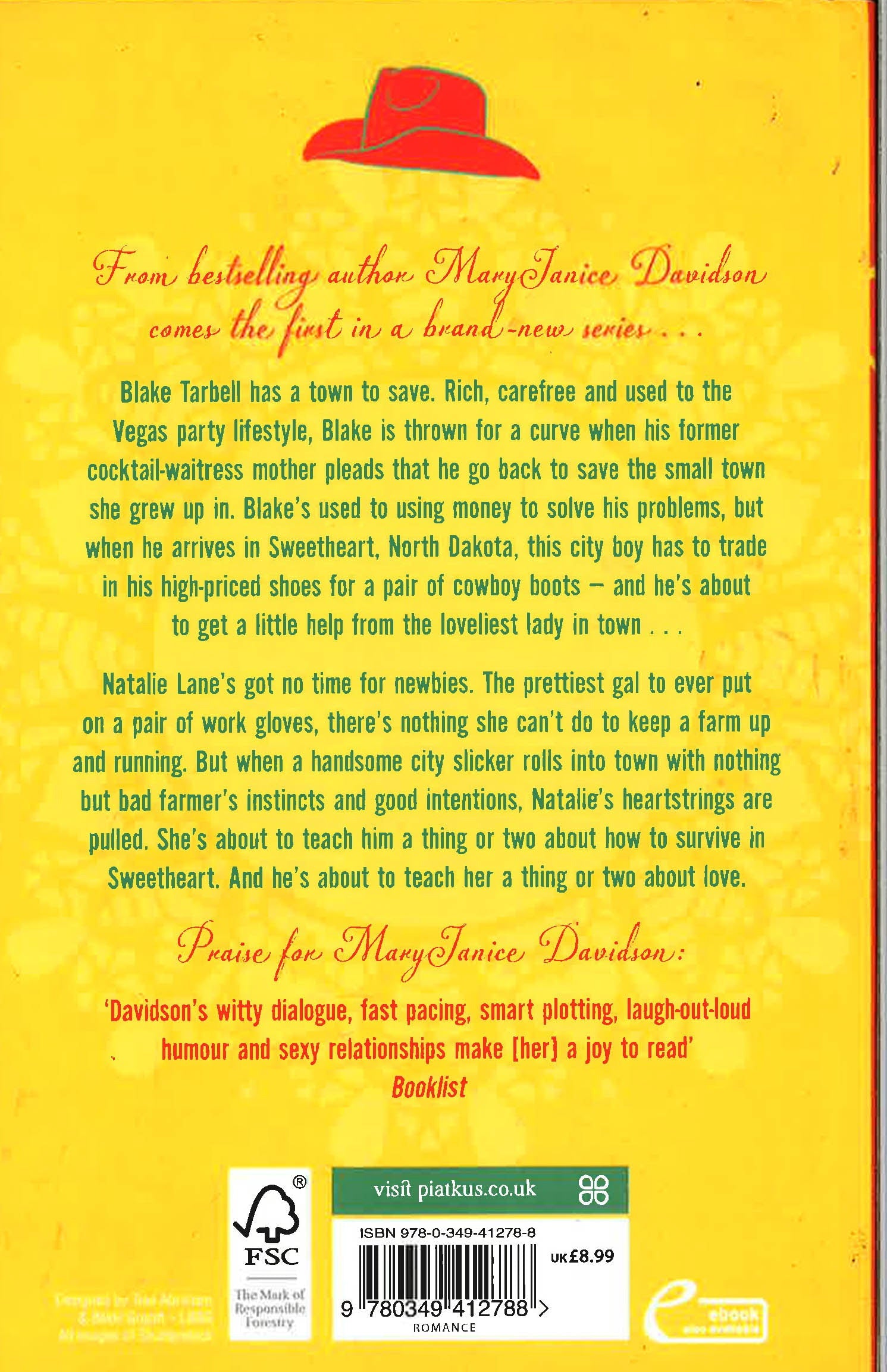 The first in a fun and quirky new contemporary series by New York Times bestselling author MaryJanice Davidson. This city boy's about to get a taste of country life . . . Blake Tarbell has a town to save. Rich, carefree, and used to the Vegas party lifestyle, Blake is thrown for a curve when his former cocktail-waitress mother pleads he go back to her roots to save the town she grew up in. Blake's used to using money to solve his problems, but when he arrives in Sweetheart, North Dakota, this city boy has to trade in his high-priced shoes for a pair of cowboy boots - and he's about to get a little help from the loveliest lady in town . . . Natalie Lane's got no time for newbies. The prettiest gal to ever put on a pair of work gloves, there's nothing she can't do to keep a farm up and running. But when a handsome city-slicker rolls into town with nothing but bad farmer's instincts and good intentions, Natalie's heartstrings are pulled. She's about to teach him a thing or two about how to survive in Sweetheart. And he's about to teach her a thing or two about love.