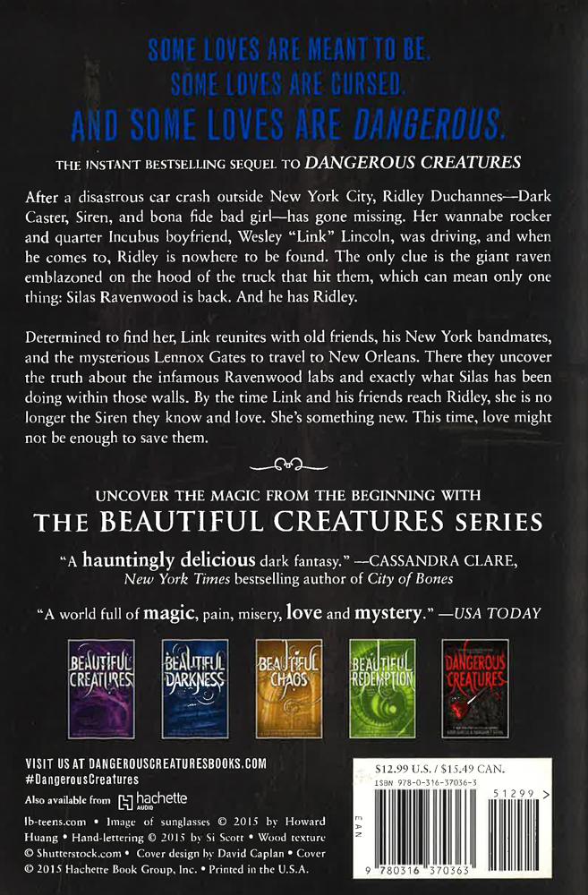 Determined to find her, Link reunites with old friends John Breed and Liv Durand, his New York bandmates, and the mysterious Lennox Gates--who has his own reasons for tracking down Ridley. Together they travel through the Caster Tunnels and the Deep South to New Orleans, where they uncover the truth about the infamous Ravenwood labs and exactly what Silas has been doing within those walls. By the time Link and his friends reach Ridley, she is no longer the Siren they know and love. She's something new. This time, love might not be enough to save them. In this sequel to Dangerous Creatures, the bestselling spin-off of the #1 New York Times bestselling Beautiful Creatures novels, coauthors Kami Garcia and Margaret Stohl deliver an intoxicating blend of magic, suspense, and danger.