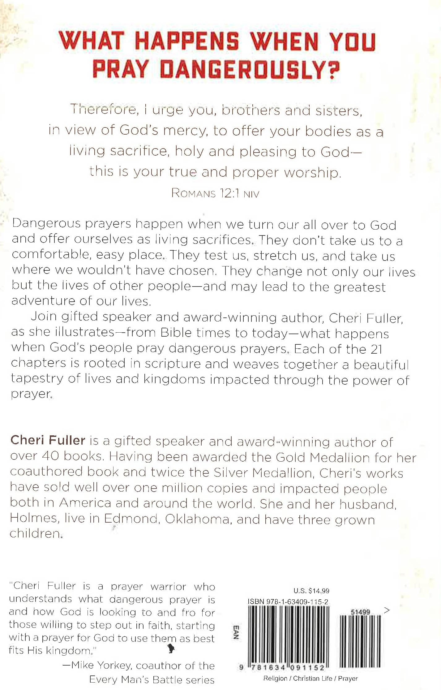 Dangerous prayers happen when you turn your all over to God and offer yourself as a living sacrifice (Romans 12:1). They don't take you to a comfortable, easy place. They test you, stretch you, and take you where you wouldn't have chosen. They change not only your life but the lives of other people. Join gifted speaker and award-winning author, Cheri Fuller, as she illustrates--from Bible times to today--what happens when God's people pray dangerous prayers. Each of the 21 chapters is rooted in scripture and weaves together a beautiful tapestry of lives and kingdoms impacted through the power of prayer.