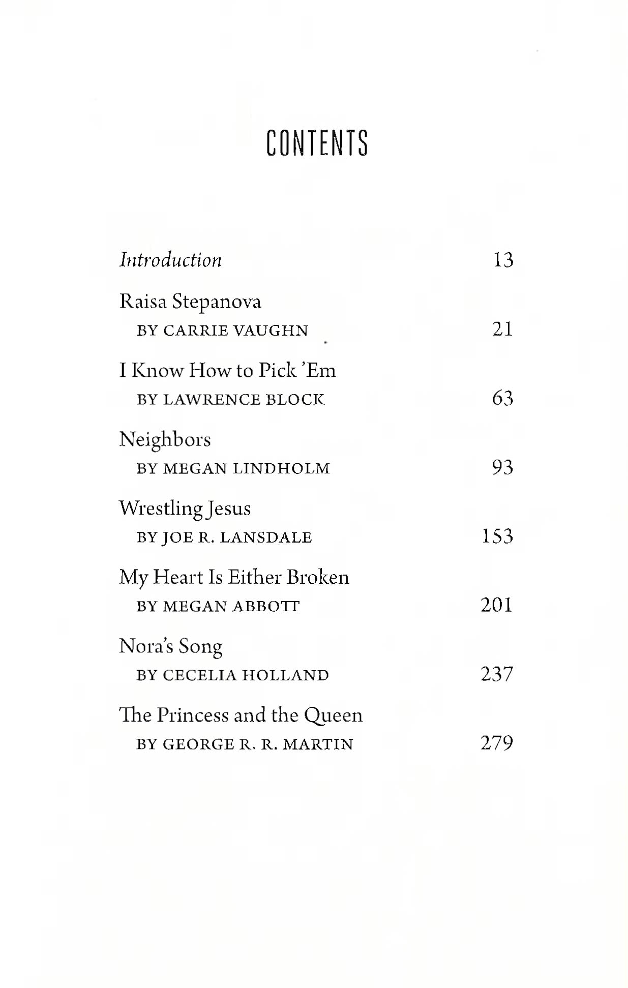 Also includes contributions from Carrie Vaughn, Lawrence Block, Megan Lindholm, Joe R. Lansdale, Megan Abbott, Cecelia Holland.