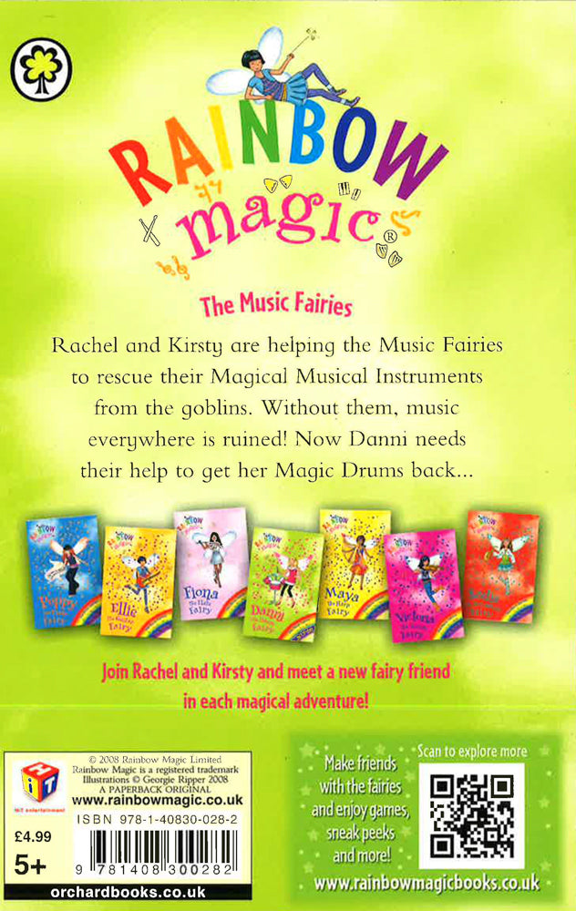 Join Rachel, Kirsty and the Music Fairies for lots more magical fun and adventure!The Music Fairies desperately need Rachel's and Kirsty's help! Jack Frost and his naughty goblins have stolen the fairies' Magical Musical Instruments, which means that music is being ruined for everyone! Jack Frost plans to use the instruments to help him win a national talent competition in the human world, and with the help of the enchanted instruments, he's bound to win. If this happens, humans will find out about Fairyland and then all the fairies will be in danger! Rachel and Kirsty must help Danni to find her Magic drum kit. But how will they find it AND get it back from Jack Frost and his sneaky goblins...?