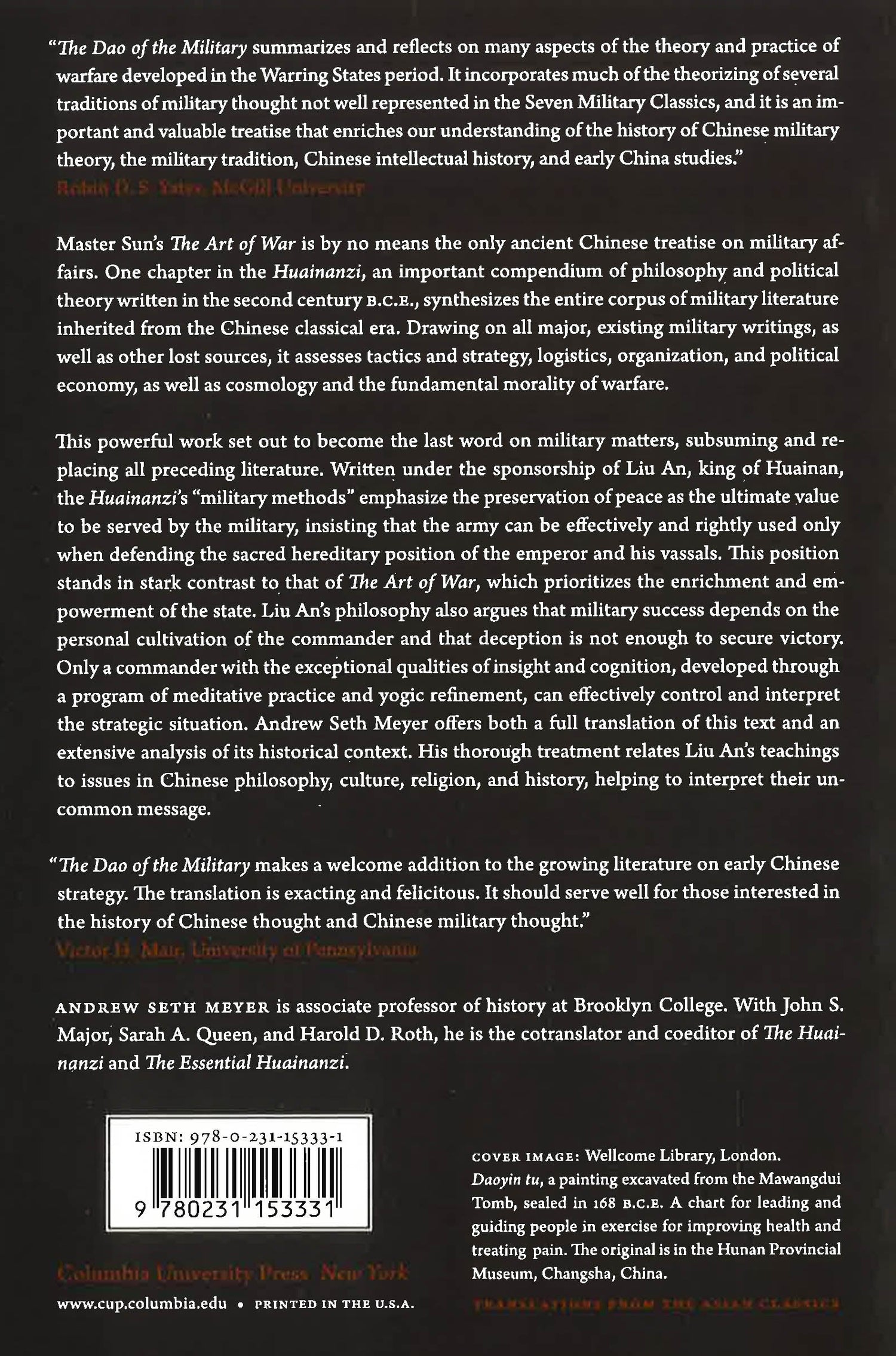 Translation previously published in: The Huainanzi. New York: Columbia University Press, 2010. Master Sun's The Art of War is by no means the only ancient Chinese treatise on military affairs. One chapter in the Huainanzi, an important compendium of philosophy and political theory written in the second century BCE, synthesizes the entire corpus of military literature inherited from the Chinese classical era. Drawing on all major, existing military writings, as well as other lost sources, it assesses tactics and strategy, logistics, organization, and political economy, as well as cosmology and the fundamental morality of warfare. This powerful work set out to become the last word on military matters, subsuming and replacing all preceding literature. Written under the sponsorship of Liu An, king of Huainan, the Huainanzi's "military methods" emphasize the preservation of peace as the ultimate value to be served by the military, insisting that the army can be effectively and rightly used only when defending the sacred hereditary position of the emperor and his vassals. This position stands in stark contrast to that of The Art of War, which prioritizes the enrichment and empowerment of the state. Liu An's philosophy also argues that military success depends on the personal cultivation of the commander and that deception is not enough to secure victory. Only a commander with the exceptional qualities of insight and cognition, developed through a program of meditative practice and yogic refinement, can effectively control and interpret the strategic situation. Andrew Seth Meyer offers both a full translation of this text and an extensive analysis of its historical context. His thorough treatment relates Liu An's teachings to issues in Chinese philosophy, culture, religion, and history, helping to interpret their uncommon message.