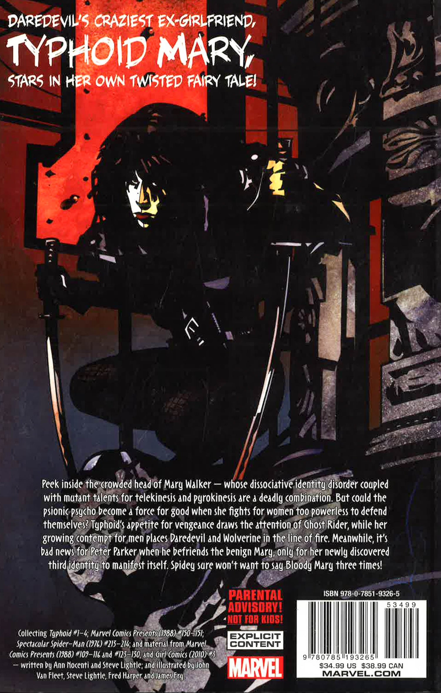 Daredevil's craziest ex-girlfriend, Typhoid Mary, is the star of her own twisted fairy tale! Peek inside the crowded head of Mary Walker, whose dissociative identity disorder and mutant talents for telekinesis and pyrokinesis are a deadly combination. But could the psionic psycho become a force for good when she fights for women too powerless to defend themselves? Typhoid's appetite for vengeance draws the attention of Ghost Rider, while her growing contempt for men places Daredevil and Wolverine in the firing line.
