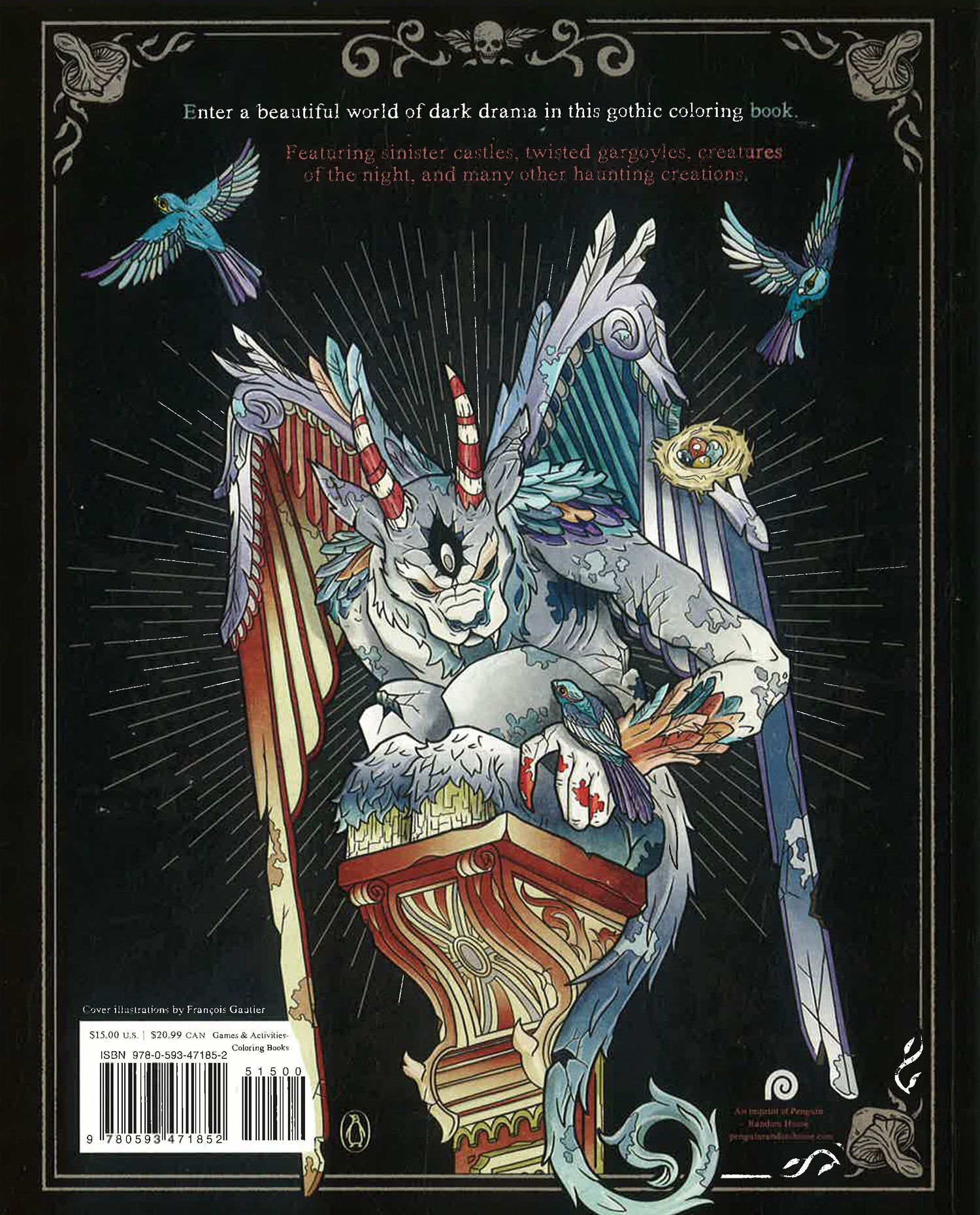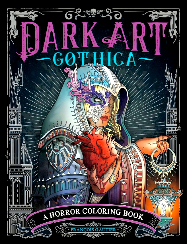 A horror coloring book sequel to Dark Art, featuring intricate and macabre gothic artwork by illustrator François Gautier