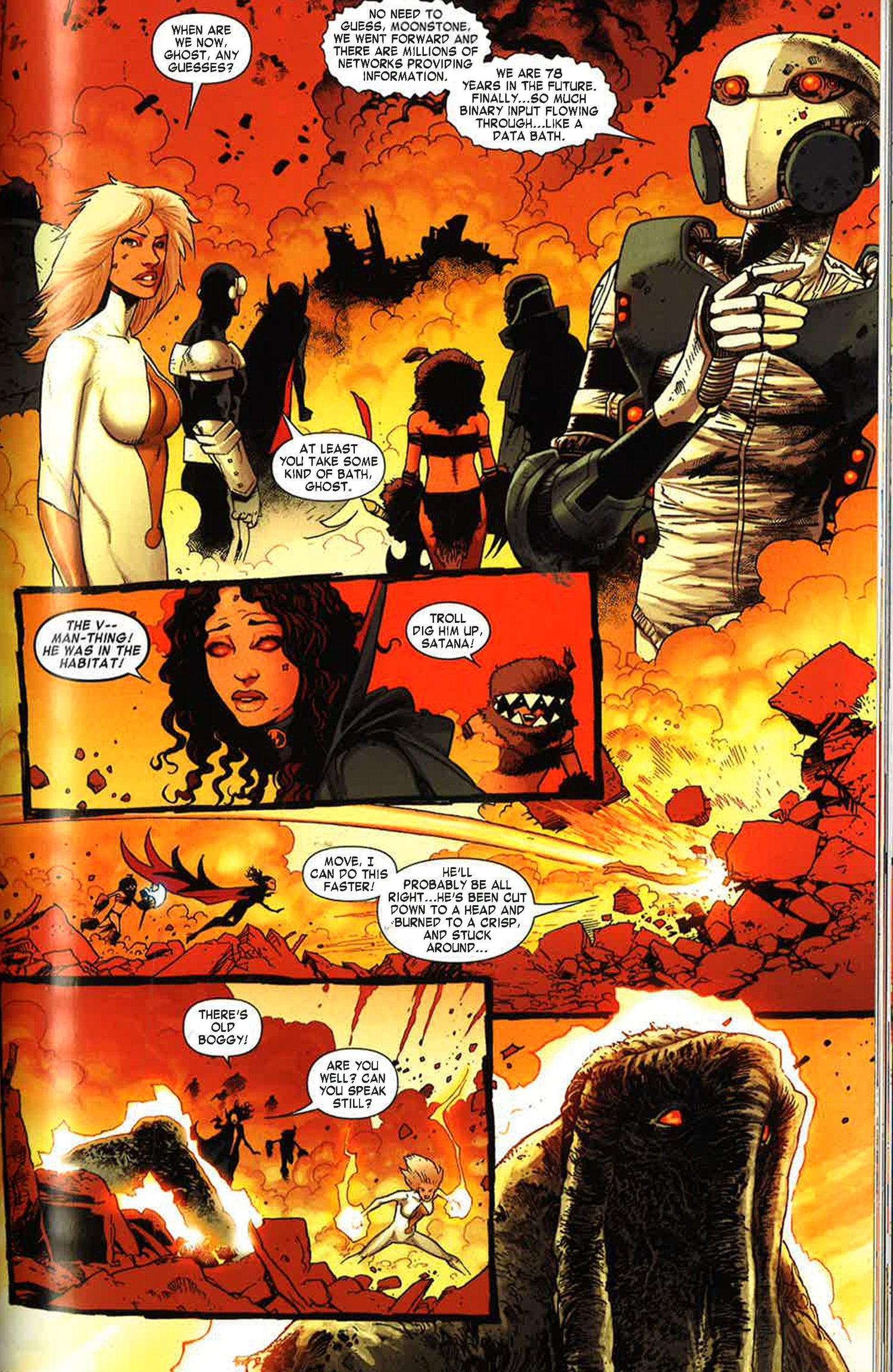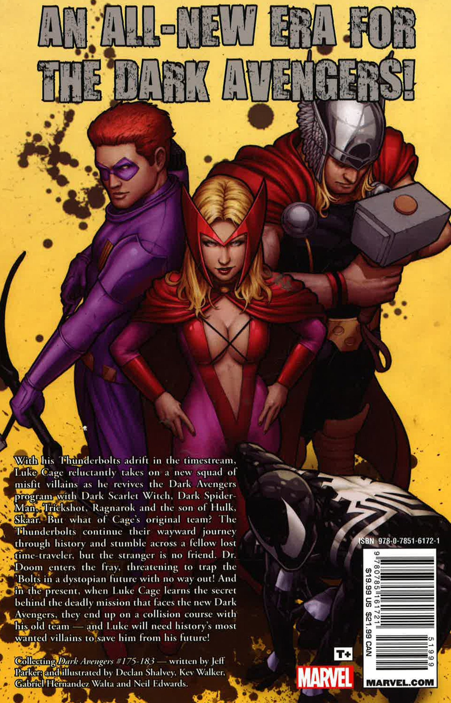 With the Thunderbolts lost in time, a new group steps in to replace them: the Dark Avengers! Featuring Dark Scarlet Witch, Dark Spider-Man, Trickshot, Ragnarok ... and Luke Cage? But as the T-Bolts battle Dr. Doom in the past for the fate of the future, Cage learns of the Dark Avengers' deadly new mission - and Skaar, son of Hulk, discovers the team's secret agenda! As the Dark Avengers' operation sets off what will become known as The Cataclysm, things get worse when Songbird stumbles onto a conspiracy to destroy the team - plus Cage and the T-Bolts to boot!