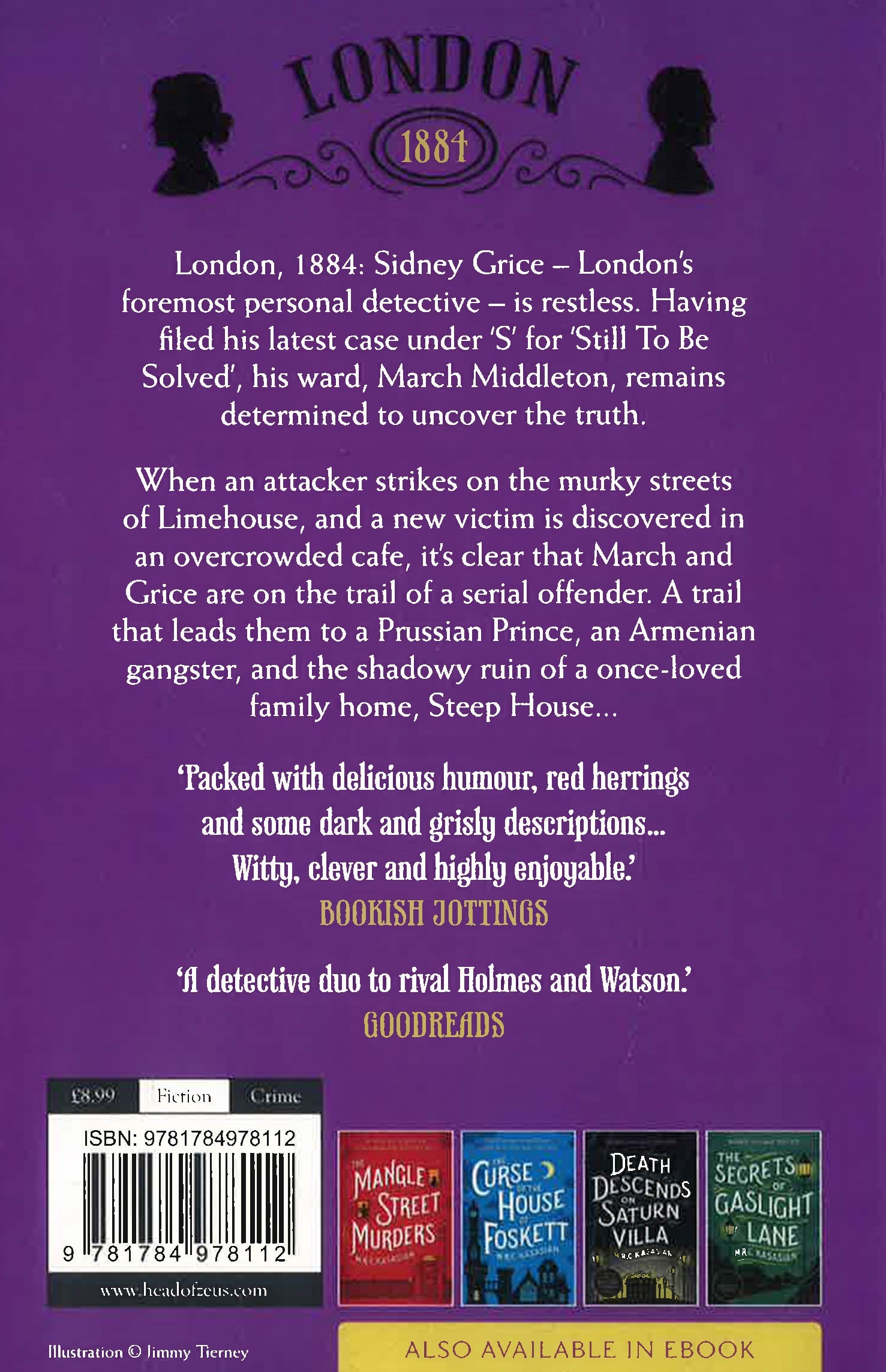 Fresh, funny historical mystery series for fans of Jasper Fforde and M.C. Beaton. 'Delightful and original... A series that could well become a cult' Daily Mail 125 Gower Street, London, 1884. Sidney Grice – London's foremost personal detective – is restless. Having filed his latest case under 'S' for 'Still To Be Solved', his ward, March Middleton, remains determined to uncover the truth. When an attacker strikes on the murky streets of Limehouse, and a new victim is discovered in an overcrowded cafe, it's clear that the duo are on the trail of a serial offender. A trail that leads them to a Prussian Prince, an Armenian gangster, and the shadowy ruin of a once-loved family home, Steep House... Reviews for DARK DAWN OVER STEEP HOUSE: 'A welcome addition to the genre' Historical Novel Society 'Classic whodunit fans will appreciate Kasasian's playing fair with them' Publishers Weekly 'Ingenious and atmospheric... Packed with delicious humour, red herrings and devious twists and turns' Bookish Jottings 'Strikes the perfect balance between humour and tension... A real page turner' Portable Magic 'Quirky humour, eccentric characters and a compelling plot' What Cathy Read Next Read the whole series: THE MANGLE STREET MURDERS THE CURSE OF THE HOUSE OF FOSKETT DEATH DESCENDS ON SATURN VILLA THE SECRETS OF GASLIGHT LANE DARK DAWN OVER STEEP HOUSE.