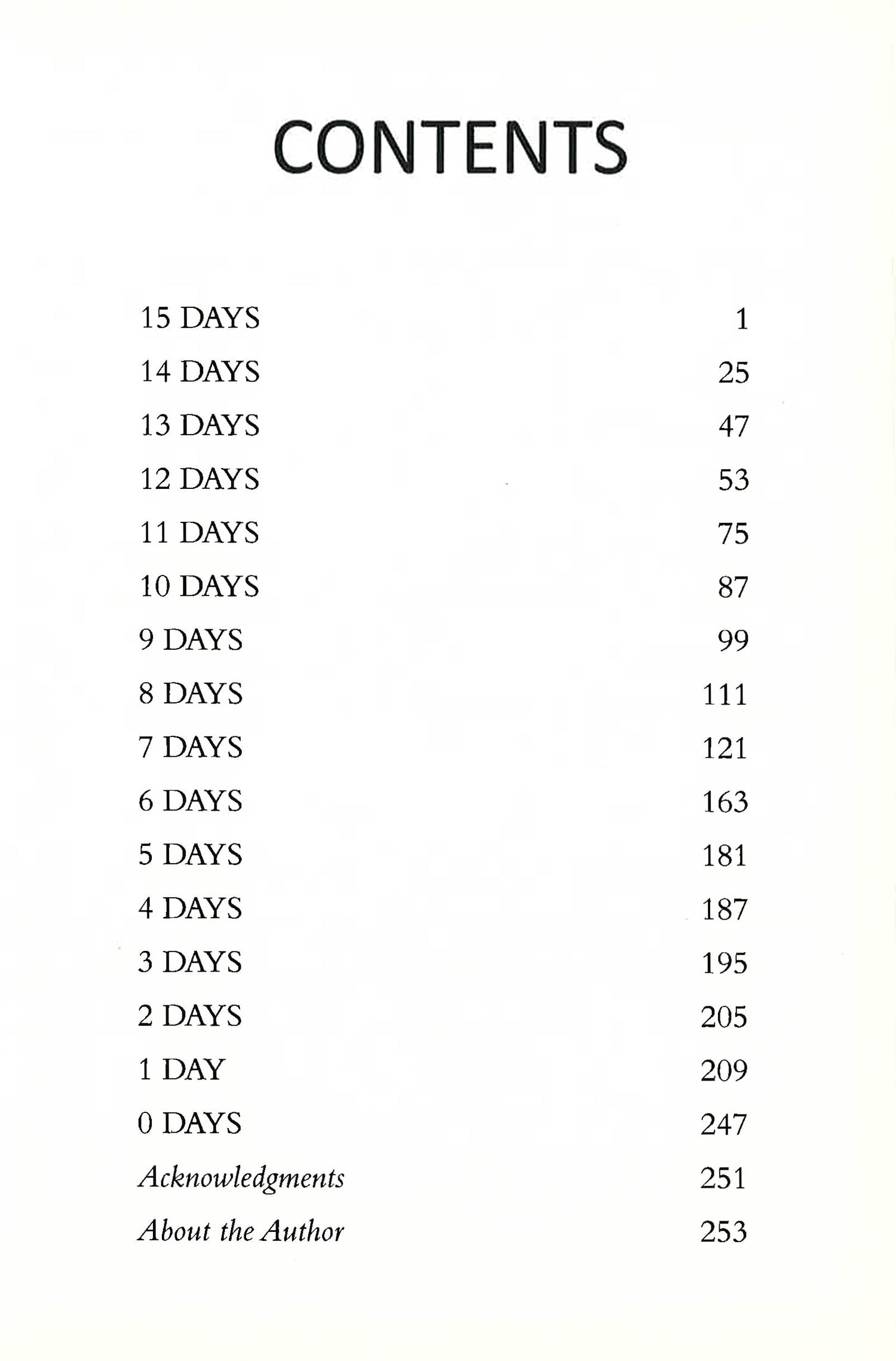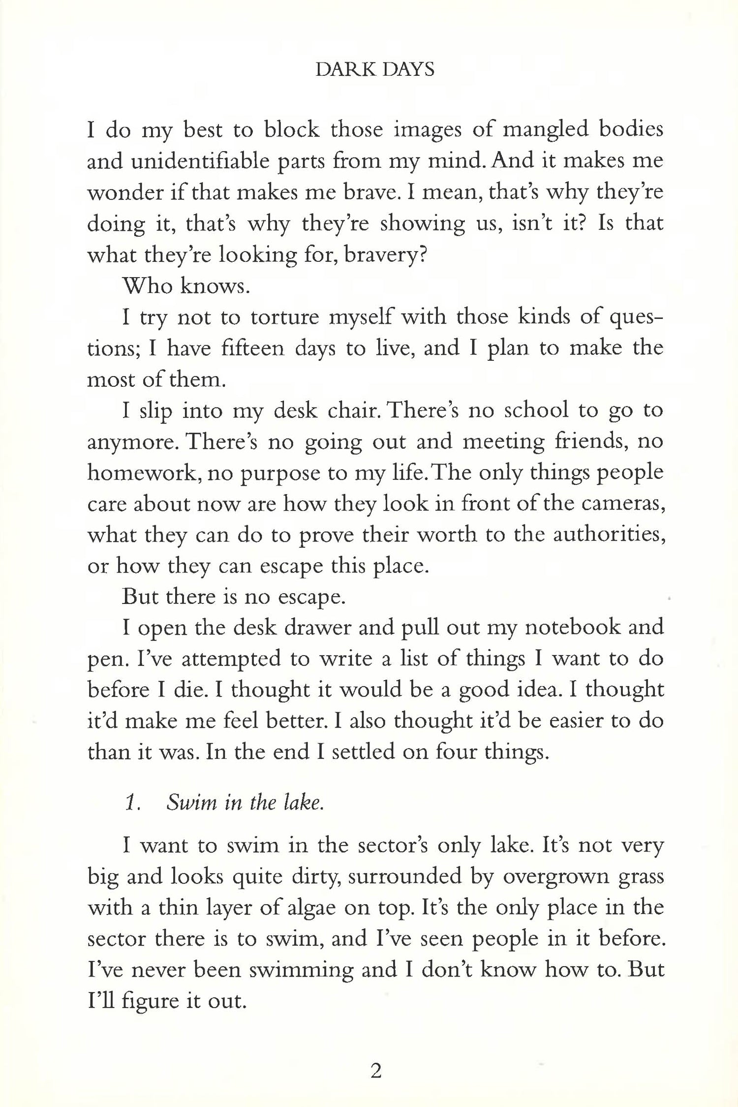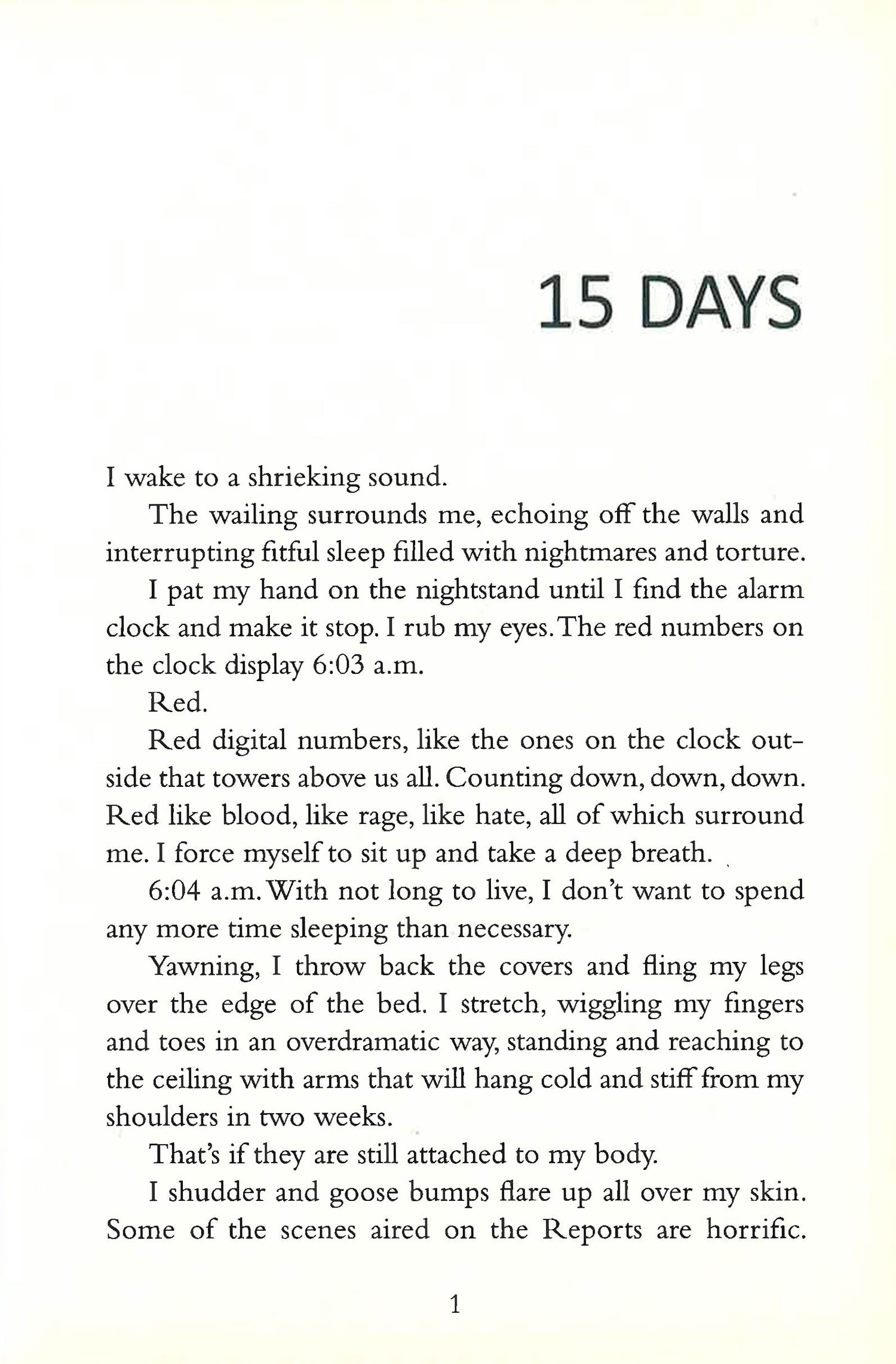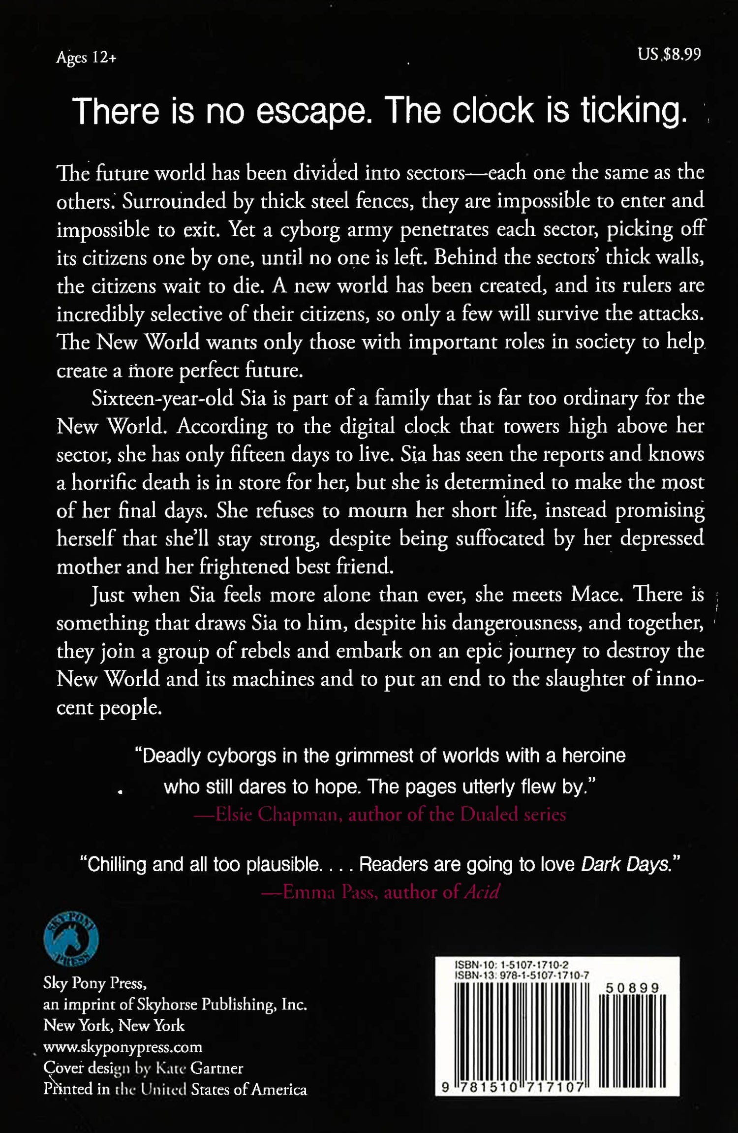 The future world has been divided into sectors-each the same as the other. Surrounded by thick steel fences, there is no way in and no way out. Yet a cyborg army penetrates each sector, picking off its citizens one by one, until no one is left. Behind the sectors' thick walls, the citizens wait to die. A new world has been created, and its rulers are incredibly selective on who will become a citizen, so only a few will survive the attacks. The New World only wants those with important roles in society to help create a more perfect future. Sixteen-year-old Sia is part of a family that is far too ordinary to be picked to live. According to the digital clock that towers high above her sector, she has only fifteen days to live. Sia has seen the reports and knows a horrific death is in store for her, but she is determined to make the most of her final days. She refuses to mourn her short life, instead promising herself that she'll stay strong, despite being suffocated by her depressed mother and her frightened best friend. Just when Sia feels more alone than ever, she meets Mace, a mysterious boy. There is something that draws Sia to him, despite his dangerousness, and together, they join a group of rebels and embark on an epic journey to destroy the New World and its machines, and to put an end to the slaughter of innocent people.