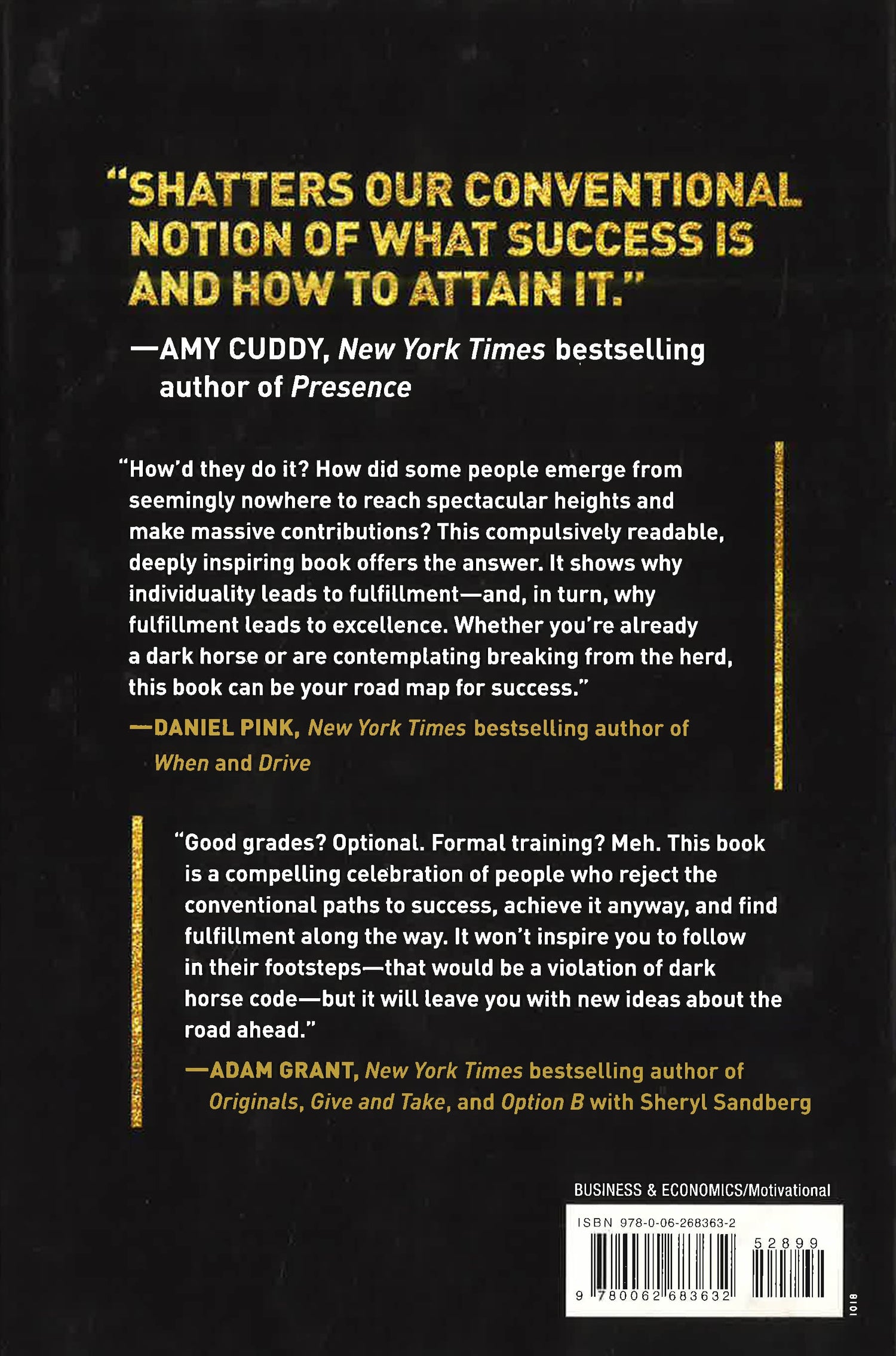 For generations, we've been stuck with a cookie-cutter mold for success that requires us to be the same as everyone else, only better. This "standard formula" works for some people but leaves most of us feeling disengaged and frustrated. As much as we might dislike the standard formula, it seems like there's no other practical path to financial security and a fulfilling life. But what if there is? In the Dark Horse Project at the Harvard Graduate School of Education, bestselling author and acclaimed thought leader Todd Rose and neuroscientist Ogi Ogas studied women and men who achieved impressive success even though nobody saw them coming. Dark horses blaze their own trail to a life of happiness and prosperity. Yet what is so remarkable is that hidden inside their seemingly one-of-a-kind journeys are practical principles for achieving success that work for anyone, no matter who you are or what you hope to achieve. This mold-breaking approach doesn't depend on you SAT scores, who you know, or how much money you have. The secret is a mindset that can be expressed in plain English: Harness your individuality in the pursuit of fulfillment to achieve excellence. In Dark Horse, Rose and Ogas show how the four elements of the dark horse mindset empower you to consistently make the right choices that fit your unique interests, abilities, and circumstances and will guide you to a life of passion, purpose, and achievement.