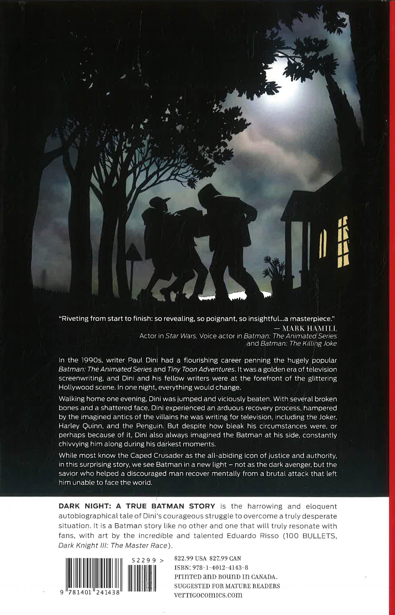 A gripping graphic memoir of one writer&;s traumatic experience and his deep connection with his creative material, DARK NIGHT: A TRUE BATMAN STORY is an original graphic novel that will resonate profoundly with fans. Art by the incredible and talented Eduardo Risso (100 BULLETS, TRANSMETROPOLITAN).