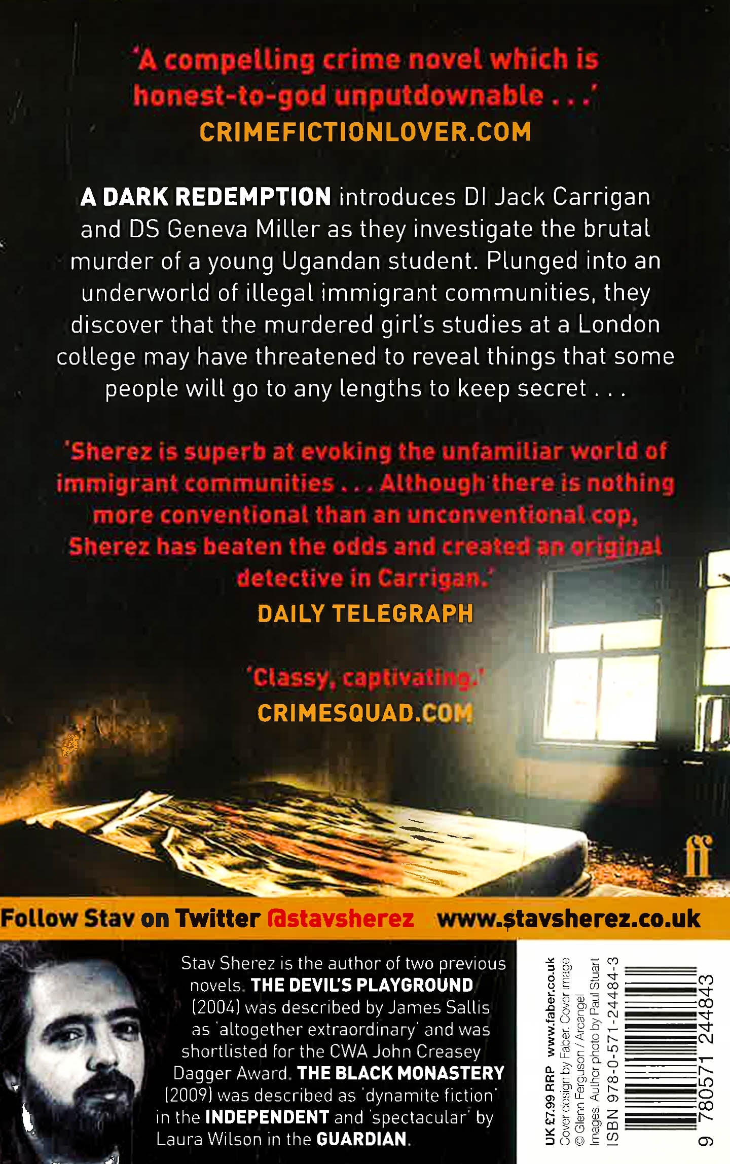 A Dark Redemption introduces DI Jack Carrigan and DS Geneva Miller as they investigate the brutal rape and murder of a young Ugandan student. Plunged into an underworld of illegal immigrant communities, they discover that the murdered girl's studies at a London College may have threatened to reveal things that some people will go to any lengths to keep secret....