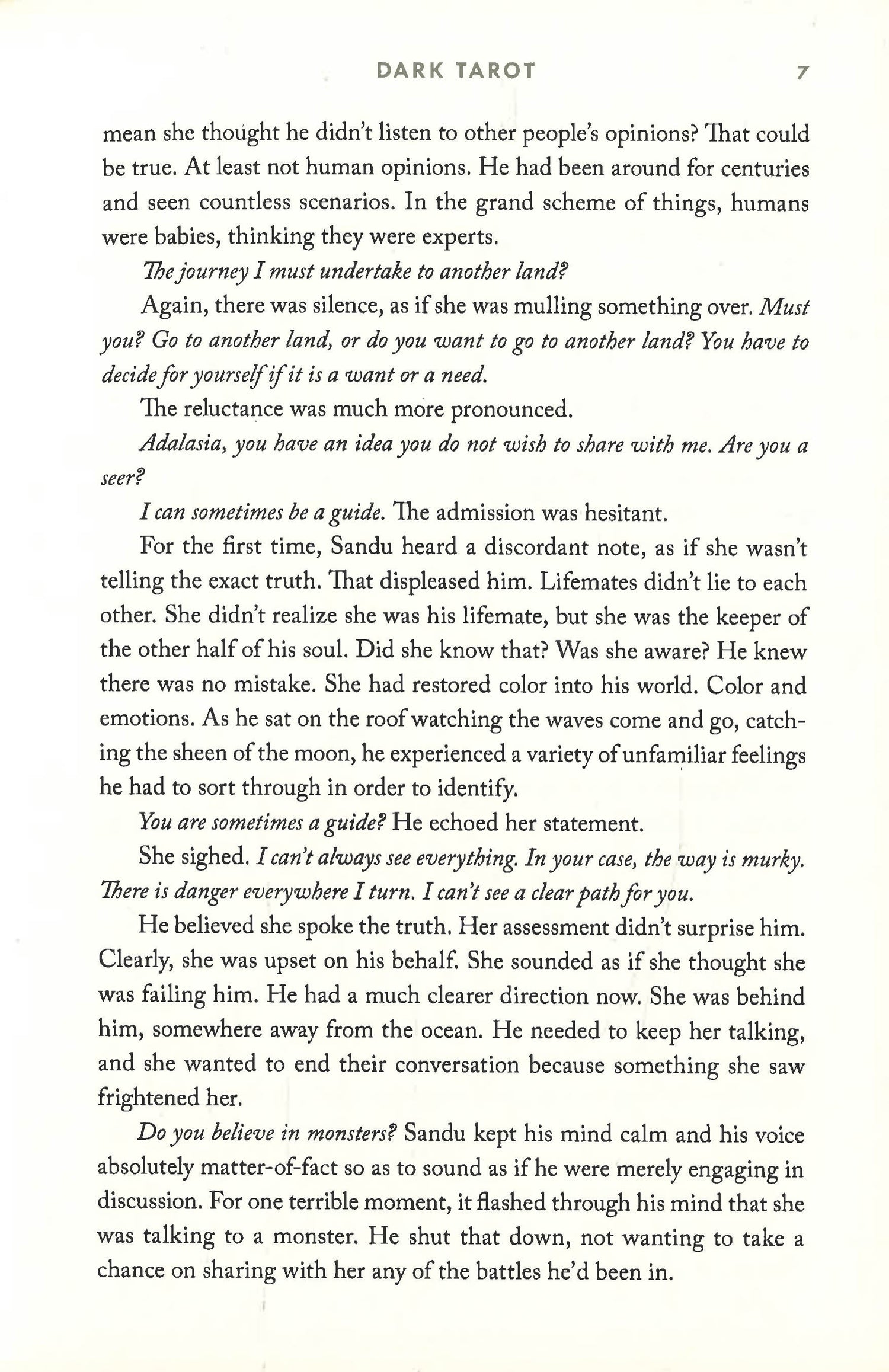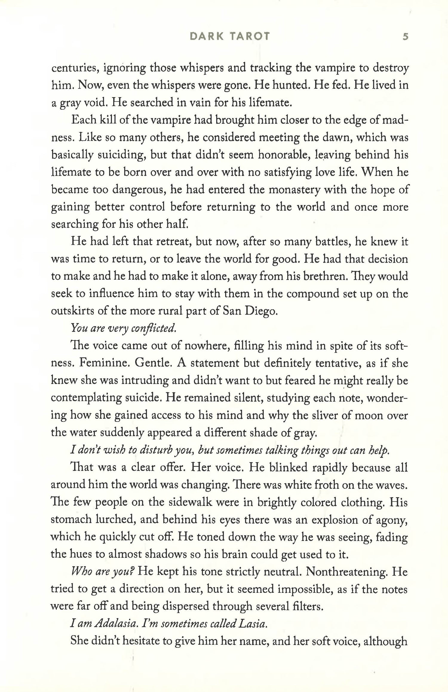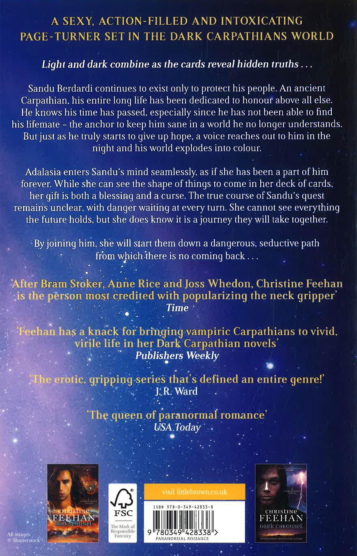Sandu Berdardi continues to exist only to protect his people. An ancient Carpathian, his entire long life has been dedicated to honor above all else. He knows his time has passed, especially since he has not been able to find his lifemate — the anchor to keep him sane in a world he no longer understands. But just as he truly starts to give up hope, a voice reaches out to him in the night and his world explodes into color.Adalasia enters Sandu's mind seamlessly, as if she has been a part of him forever. While she can see the shape of things to come in her deck of cards, her gift is both a blessing and a curse. The true course of Sandu's quest remains unclear, with danger waiting at every turn. She cannot see everything the future holds, but she does know it is a journey they will take together.