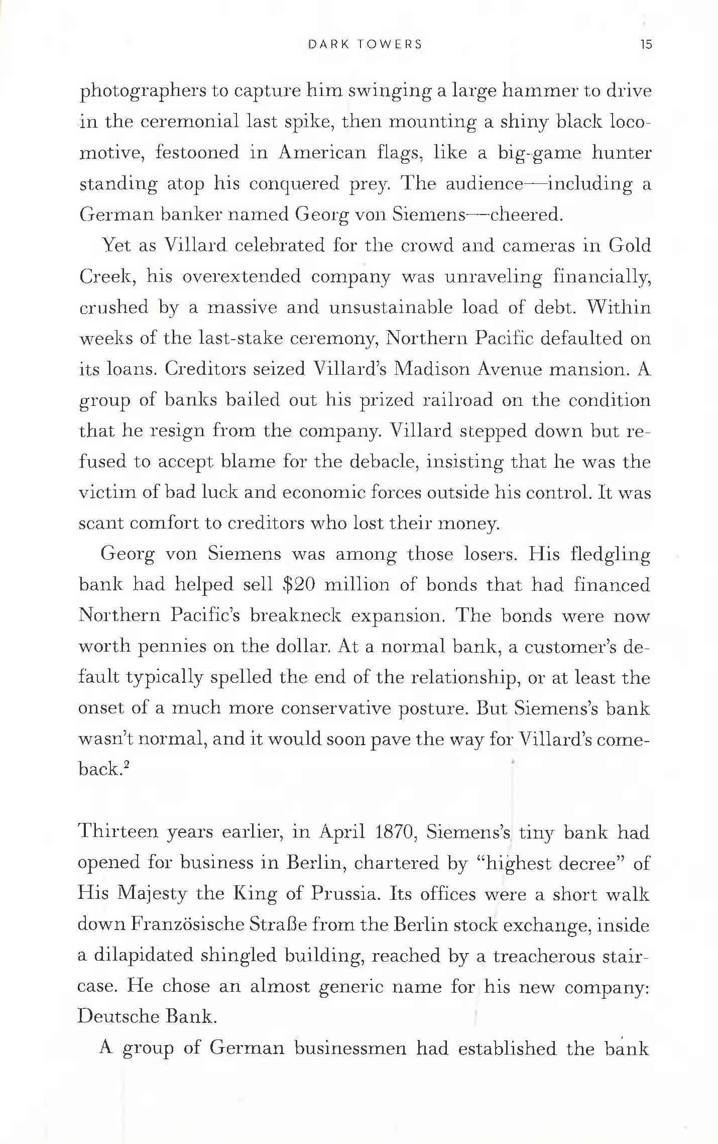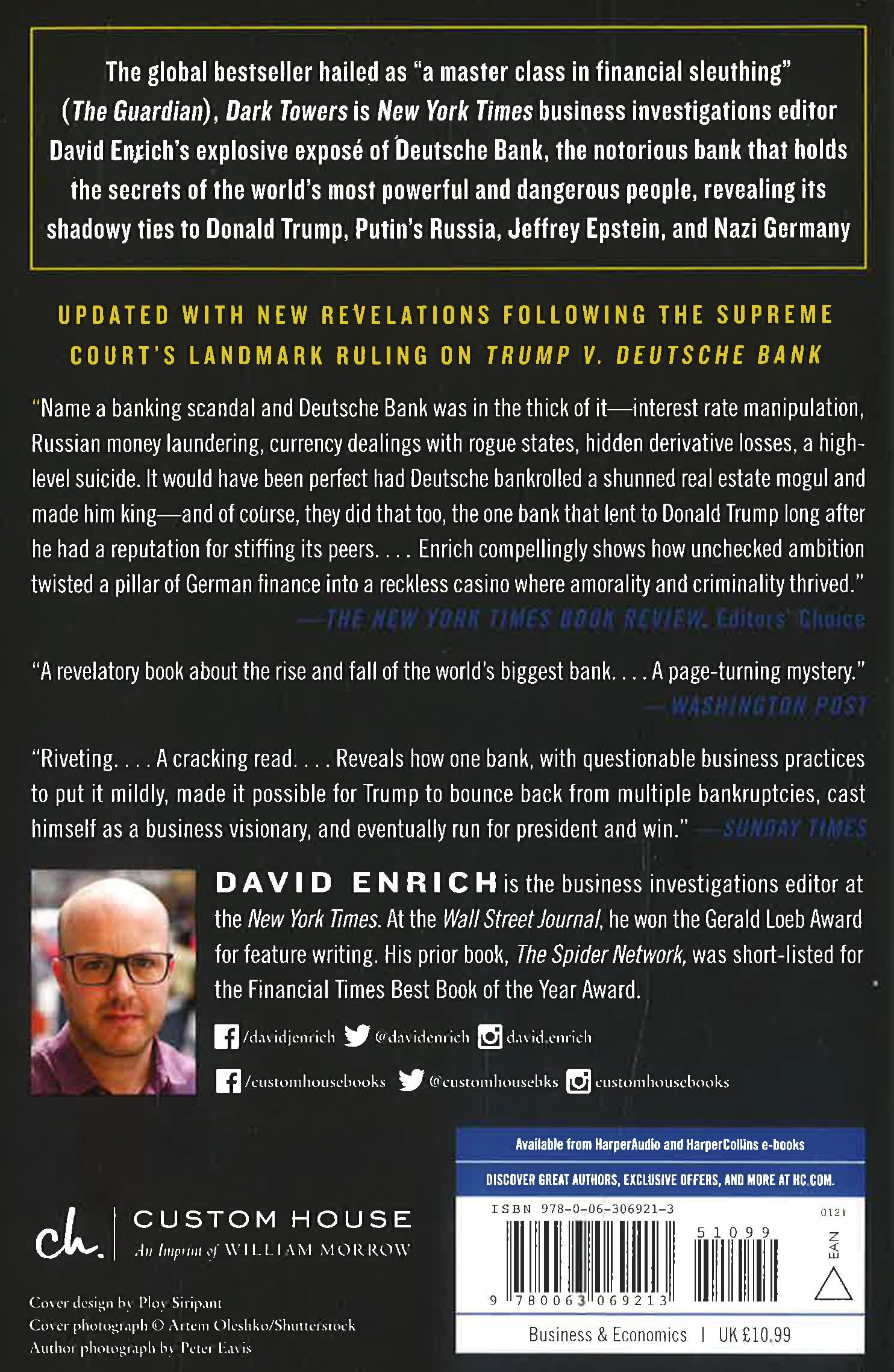 #1 WALL STREET JOURNAL BESTSELLER * NEW YORK TIMES BESTSELLER New York Times finance editor David Enrich's explosive exposé of the most scandalous bank in the world, revealing its shadowy ties to Donald Trump, Putin's Russia, and Nazi Germany "A jaw-dropping financial thriller" -- Philadelphia Inquirer On a rainy Sunday in 2014, a senior executive at Deutsche Bank was found hanging in his London apartment. Bill Broeksmit had helped build the 150-year-old financial institution into a global colossus, and his sudden death was a mystery, made more so by the bank's efforts to deter investigation. Broeksmit, it turned out, was a man who knew too much. In Dark Towers , award-winning journalist David Enrich reveals the truth about Deutsche Bank and its epic path of devastation. Tracing the bank's history back to its propping up of a default-prone American developer in the 1880s, helping the Nazis build Auschwitz, and wooing Eastern Bloc authoritarians, he shows how in the 1990s, via a succession of hard-charging executives, Deutsche made a fateful decision to pursue Wall Street riches, often at the expense of ethics and the law. Soon, the bank was manipulating markets, violating international sanctions to aid terrorist regimes, scamming investors, defrauding regulators, and laundering money for Russian oligarchs. Ever desperate for an American foothold, Deutsche also started doing business with a self-promoting real estate magnate nearly every other bank in the world deemed too dangerous to touch: Donald Trump. Over the next twenty years, Deutsche executives loaned billions to Trump, the Kushner family, and an array of scandal-tarred clients, including convicted sex offender Jeffrey Epstein. Dark Towers is the never-before-told saga of how Deutsche Bank became the global face of financial recklessness and criminality--the corporate equivalent of a weapon of mass destruction. It is also the story of a man who was consumed by fear of what he'd seen at the bank--and his son's obsessive search for the secrets he kept. --Kirkus Reviews