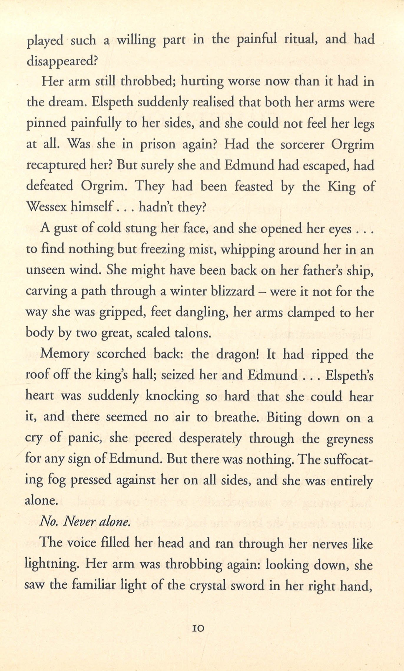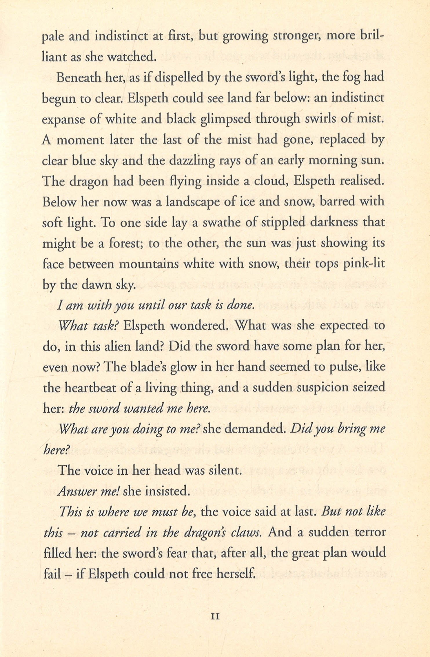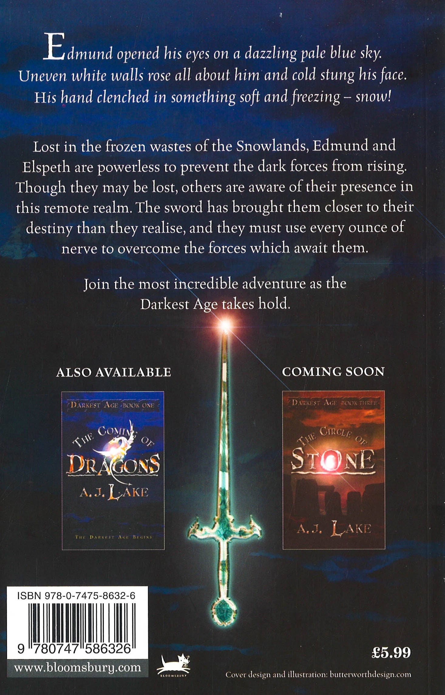 Snatched by a dragon at the end of book one, Edmund and Elspeth awake to find themselves soaring over the frozen wastes of the Snowlands, hundreds of miles from home. Escaping the dragon's clutches, they are discovered in the soft snow by Fritha. Edmund wants her help to arrange a passage home, but Elspeth has other ideas. Snatched by a dragon at the end of book one, Edmund and Elspeth awake to find themselves soaring over the frozen wastes of the Snowlands, hundreds of miles from home. Escaping the dragon's clutches, they are discovered in the soft snow by Fritha. a charcoal burner's daughter. Edmund wants her help to arrange a passage home, but Elspeth has other ideas. The sword is speaking to her, filling her thoughts more and more. It's destiny is nearby, the purpose for which is was hewn, and where the sword goes, Elspeth must follow, increasingly under it's spell. Edmund and Fritha refuse to let Elspeth travel alone, and so they set out together on a perlilous route to Eigg Loki, the mountain which is drawing Elspeth and the sword, and to the dark secrets which lie at its heart.