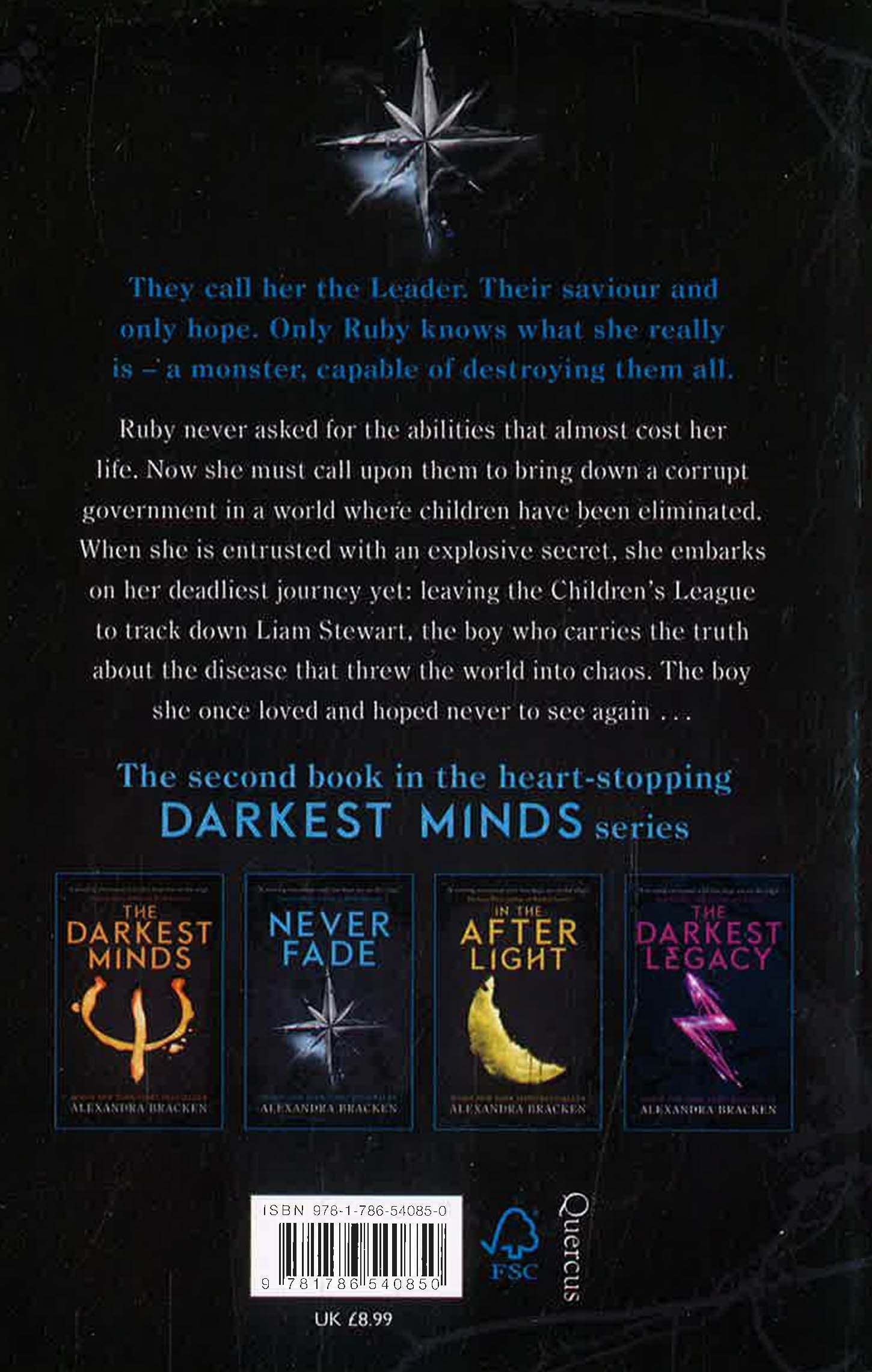 The second book in the heart-stopping The Darkest Minds trilogy, by New York Times bestselling author of Passenger, for fans of Divergent and The Hunger Games. They call her the Leader. Their saviour and only hope. Only Ruby knows what she really is - a monster, capable of destroying them all. Ruby never asked for the abilities that almost cost her life. Now she must call upon them to bring down a corrupt government in a world where children have been eliminated. When she is entrusted with an explosive secret, she embarks on her deadliest journey yet: leaving the Children's League to track down Liam Stewart, the boy who carries the truth about the disease that threw the world into chaos. The boy she once loved and hoped never to see again ...