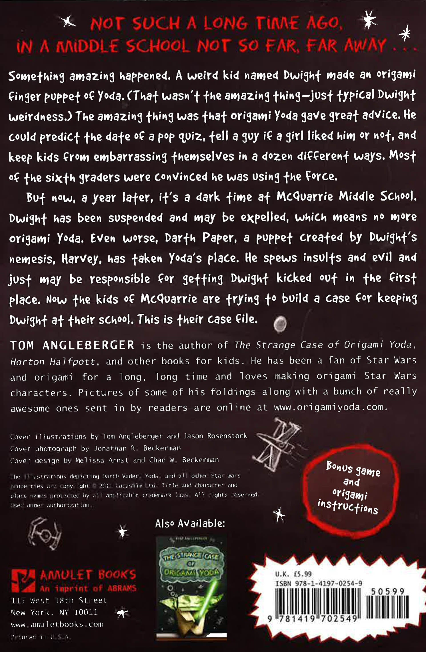 In this clever follow-up to the breakout bestseller The Strange Case of Origami Yoda, author Tom Angleberger once again captures the sometimes-hilarious intrigues and dramas of middle school, and also introduces a new Star Wars-based puppet: Darth Paper! Things aren't going so well at Ralph McQuarrie Middle School. Sick of being humiliated by Dwight and his strange Origami Yoda finger puppet, Harvey gets Dwight suspended from school for being a troublemaker. But not all hope is lost. Origami Yoda has a plan: He wants Tommy and Kellen to create a new case file that proves Dwight's presence benefits the school. Together, the friends record cases such as "Origami Yoda and the Pre-eaten Wiener," "Origami Yoda and the Exploding Pizza Bagels," and "Origami Yoda and Wonderland: The Musical." But Harvey and his Darth Paper puppet have a plan of their own...and it could make Dwight's suspension a permanent one!