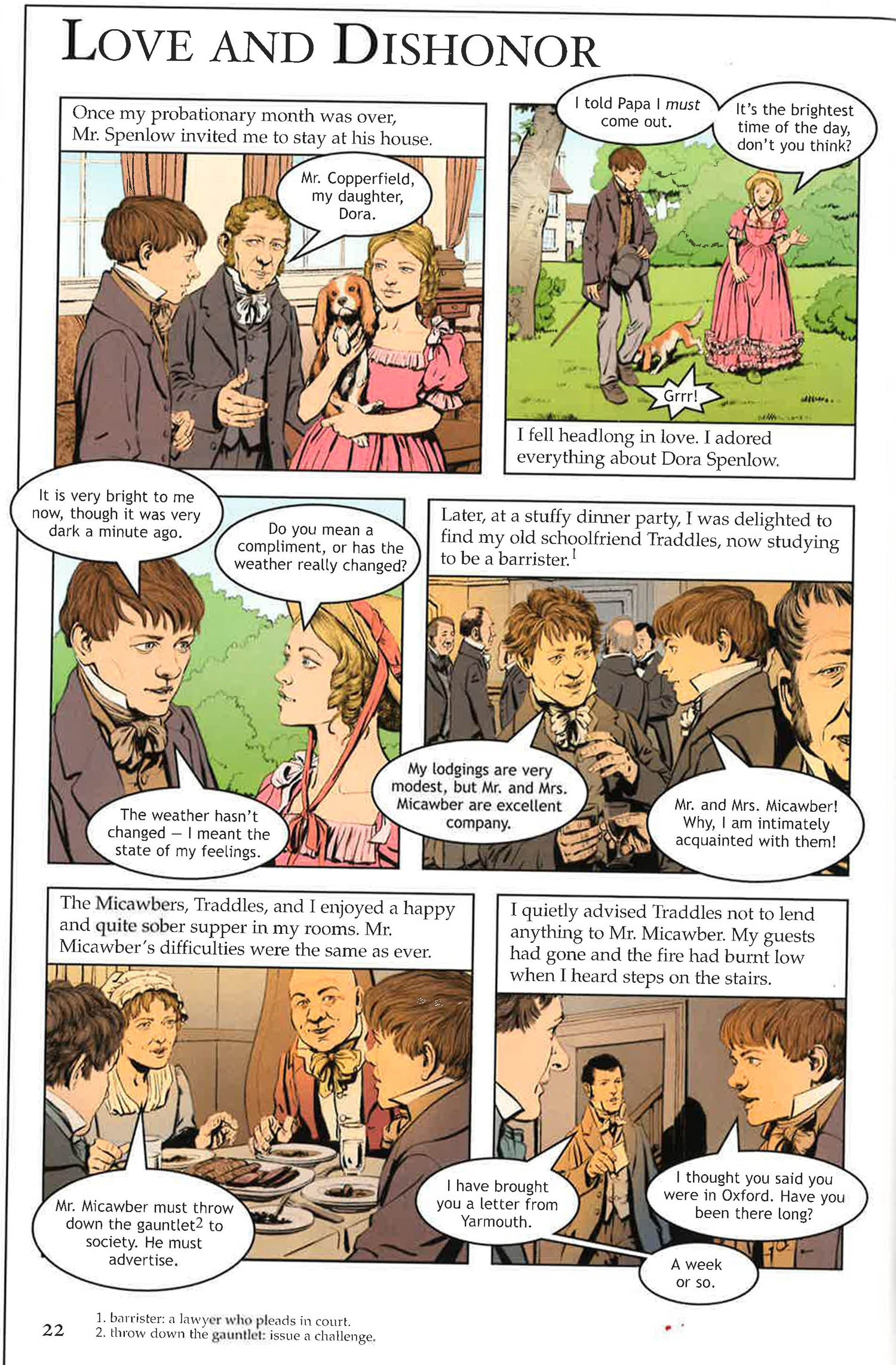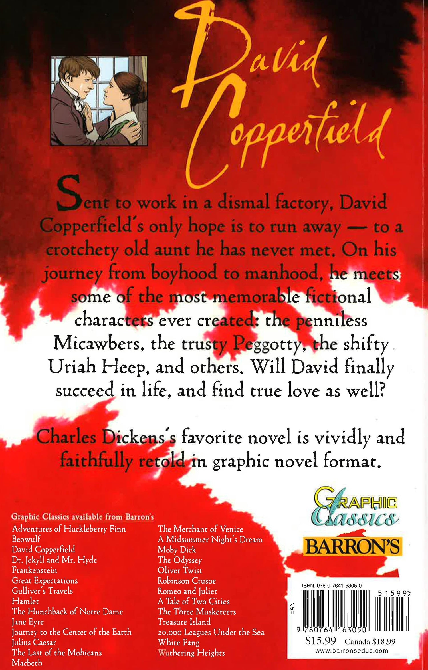 Titles in Barron's " Graphic Classics " series present faithful graphic novel adaptations of memorable works of literature. " Graphic Classics " introduce elementary and secondary school students to many great books, and encourage boys and girls to discover the joy of reading the masterworks in their original form. " Graphic Classics " titles tell absorbing stories with high-quality color illustrations, brief narrative sections, and dialogue balloons that capture the spirit of the originals. Each title includes background material to help young readers understand when and why the literary work was originally written. " David Copperfield, " a classic novel by Charles Dickens, tells of a little boy's struggles against a wicked stepfather and other hardships as he grows to manhood. The story is also enlivened with many colorfully comic characters. Probably the funniest of them is the always-in-debt but ever hopeful Mister Micawber. Dickens claimed that David Copperfield was his favorite among his many fictional characters. This edition is hardcover. The book is also available in a paperback edition.