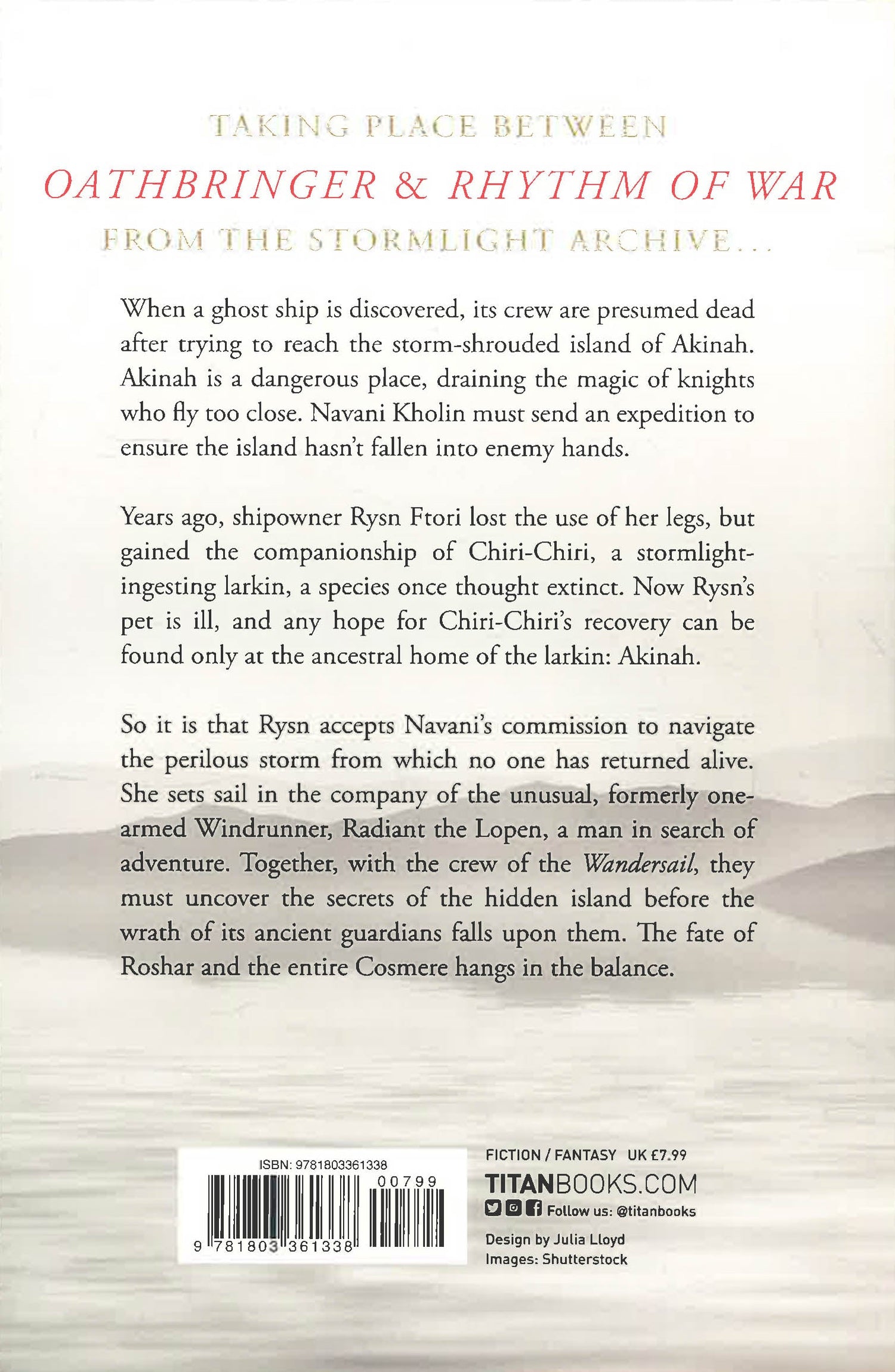 Epic fantasy like no other in the #1 New York Times bestselling Stormlight Archive series, a hefty novella taking place between Oathbringer and Rhythm of War. Discover the stories of often-overshadowed characters: See more of Lopen, the Windrunner, Rysn Ftori and Chiri-Chiri the last larkin. When a ghost ship is discovered, its crew presumed dead after trying to reach the storm-shrouded island of Akinah, Navani Kholin must send an expedition to make sure the island hasn't fallen into enemy hands. Knights who fly too near find their magic suddenly drained, so the voyage must be by sea. Years ago, shipowner Rysn Ftori lost the use of her legs but gained the companionship of Chiri-Chiri, a stormlight-ingesting larkin, a species once thought extinct. Now Rysn's pet is ill, and any hope for Chiri-Chiri's recovery can be found only at the ancestral home of the larkin: Akinah. With the help of Lopen, the formerly one-armed windrunner, Rysn must accept Navani's quest and sail into the perilous storm from which no one has returned alive. If the crew cannot uncover the secrets of the hidden island city before the wrath of its ancient guardians falls upon them, the fate of Roshar and the entire Cosmere hangs in the balance.