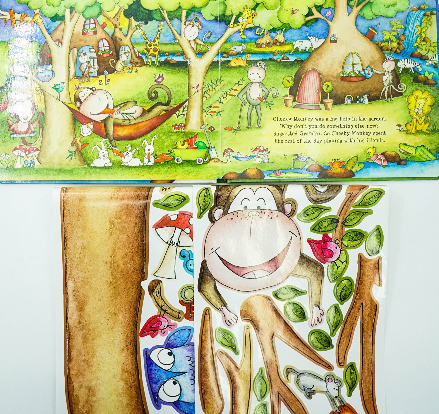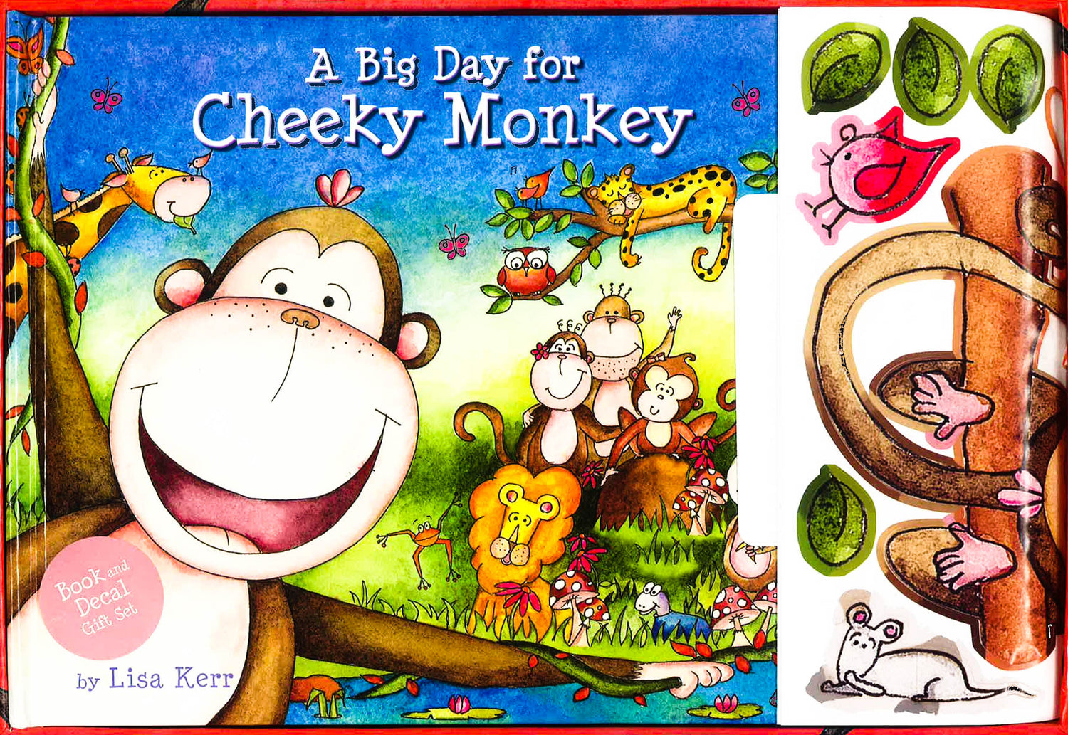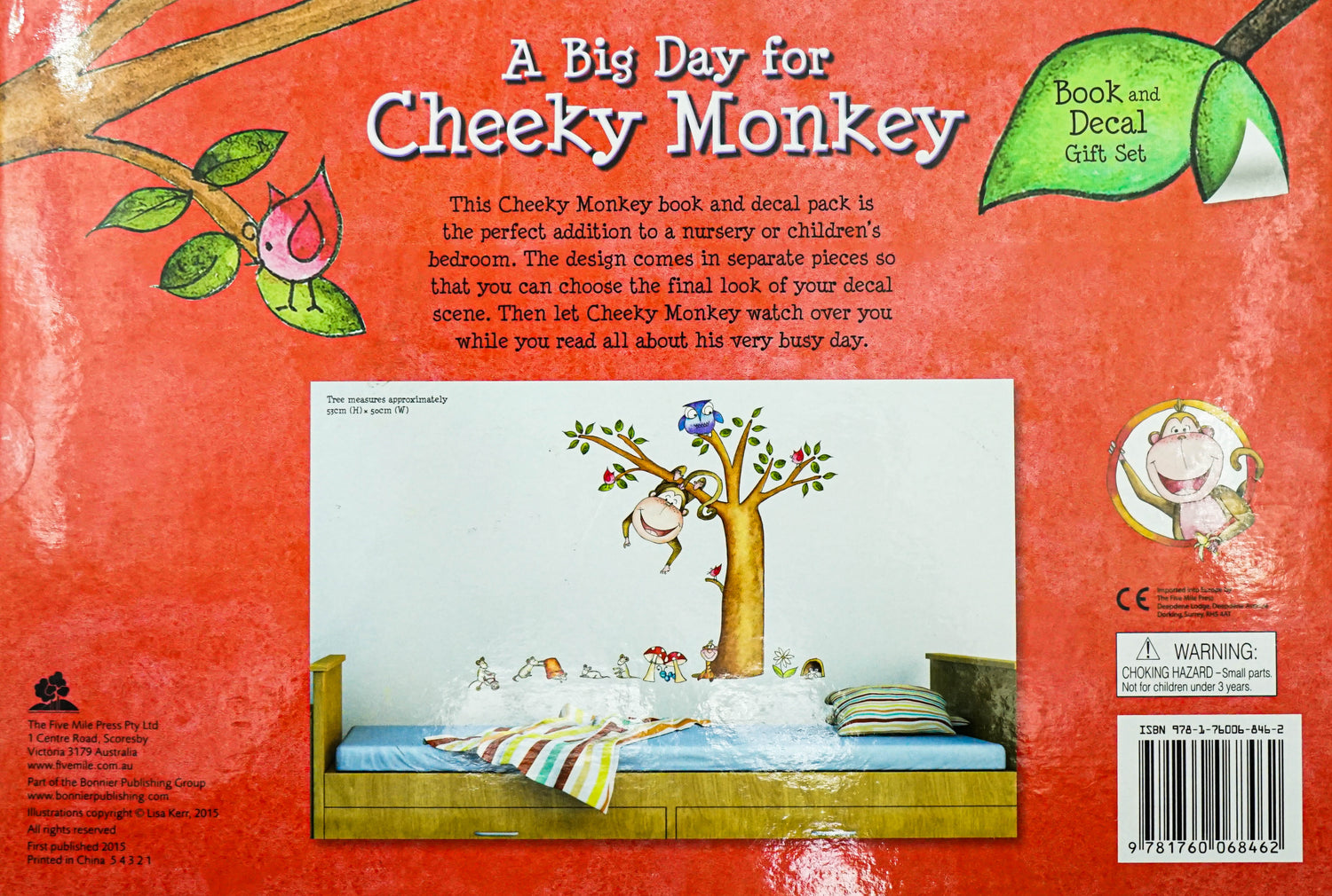 A board book and wall decals featuring Cheeky Monkey and his friends - perfect for any young child's room!Read the book - spend a day with Cheeky Monkey, from breakfast to bedtime and all the in-between time.Decorate a wall with Cheeky Monkey, his tree and some of his friends.Story models early learning concepts. Features popular character, Cheeky Monkey.Removable decal - a great way to decorate any young child's room.Night time ending makes it the perfect going to bed story.