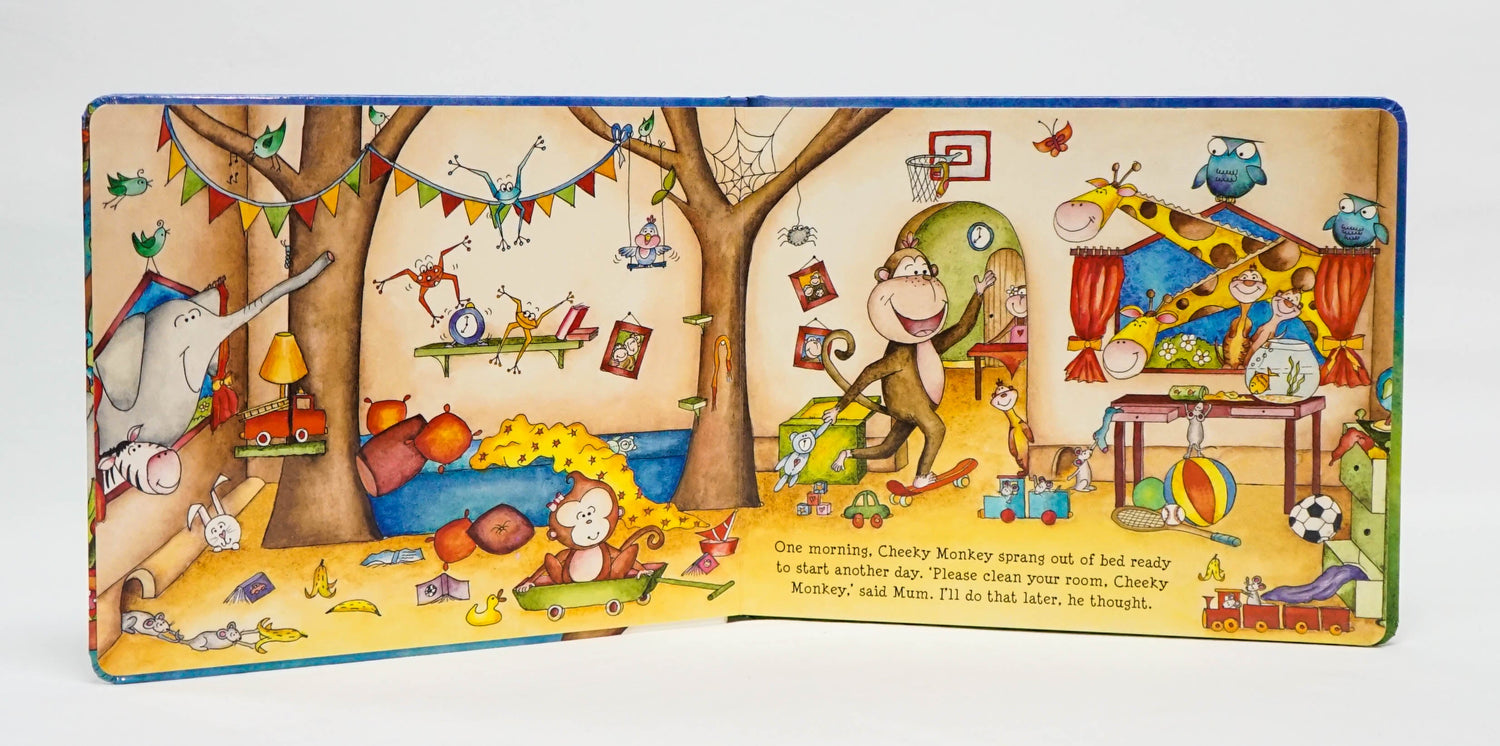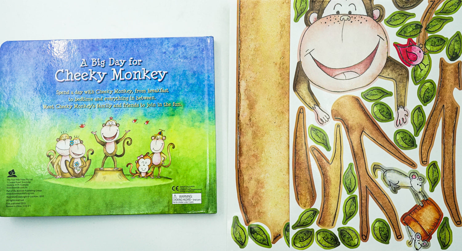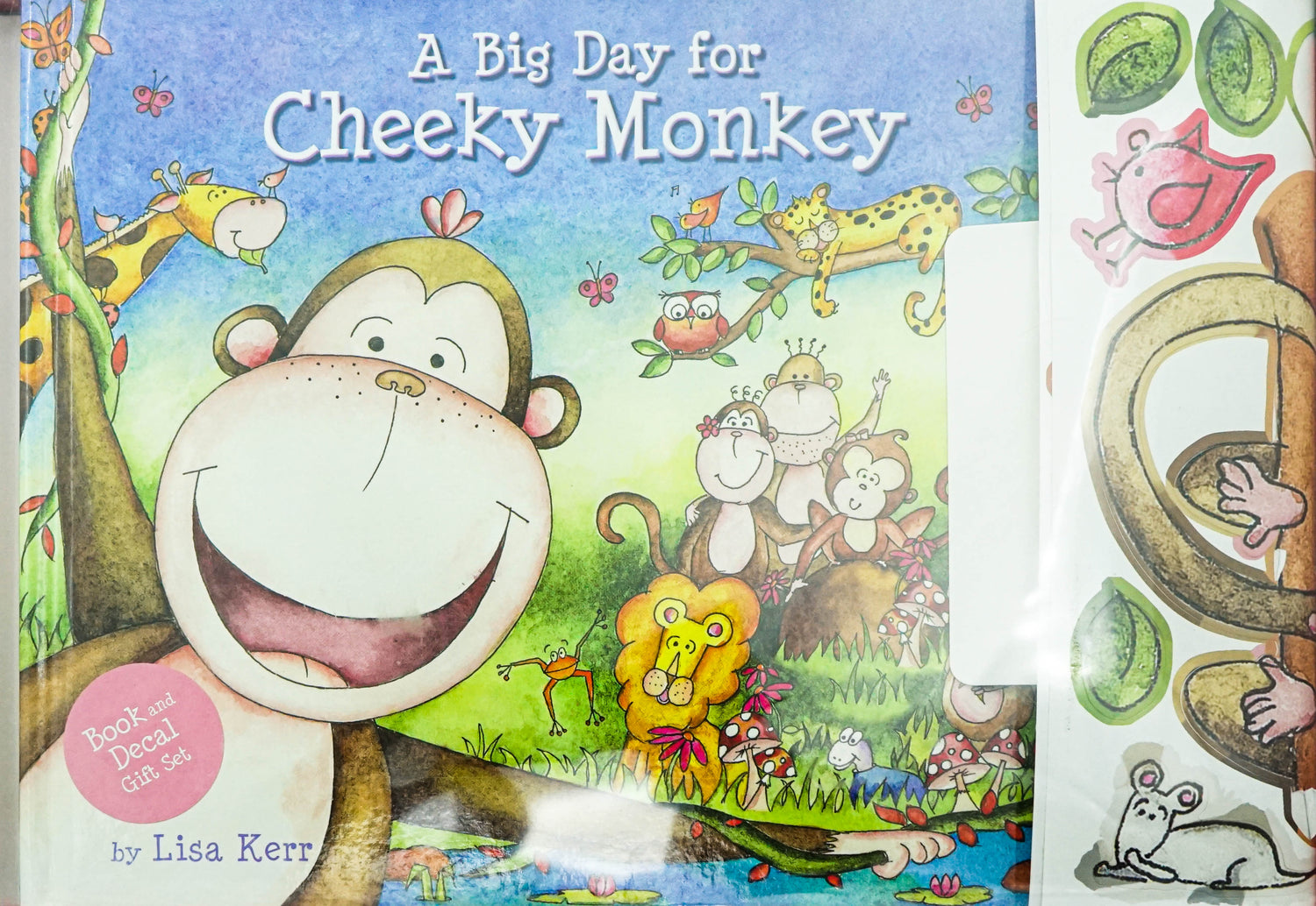 A board book and wall decals featuring Cheeky Monkey and his friends - perfect for any young child's room!Read the book - spend a day with Cheeky Monkey, from breakfast to bedtime and all the in-between time.Decorate a wall with Cheeky Monkey, his tree and some of his friends.Story models early learning concepts. Features popular character, Cheeky Monkey.Removable decal - a great way to decorate any young child's room.Night time ending makes it the perfect going to bed story.