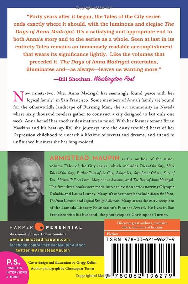 Now ninety-two, and committed to the notion of “leaving like a lady,” Mrs. Madrigal has seemingly found peace with her “logical family” in San Francisco: her devoted young caretaker Jake Greenleaf; her former tenant Brian Hawkins and his daughter Shawna; and Michael Tolliver and Mary Ann Singleton, who have known and loved Anna for nearly four decades.